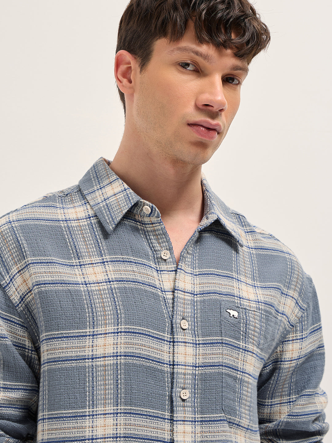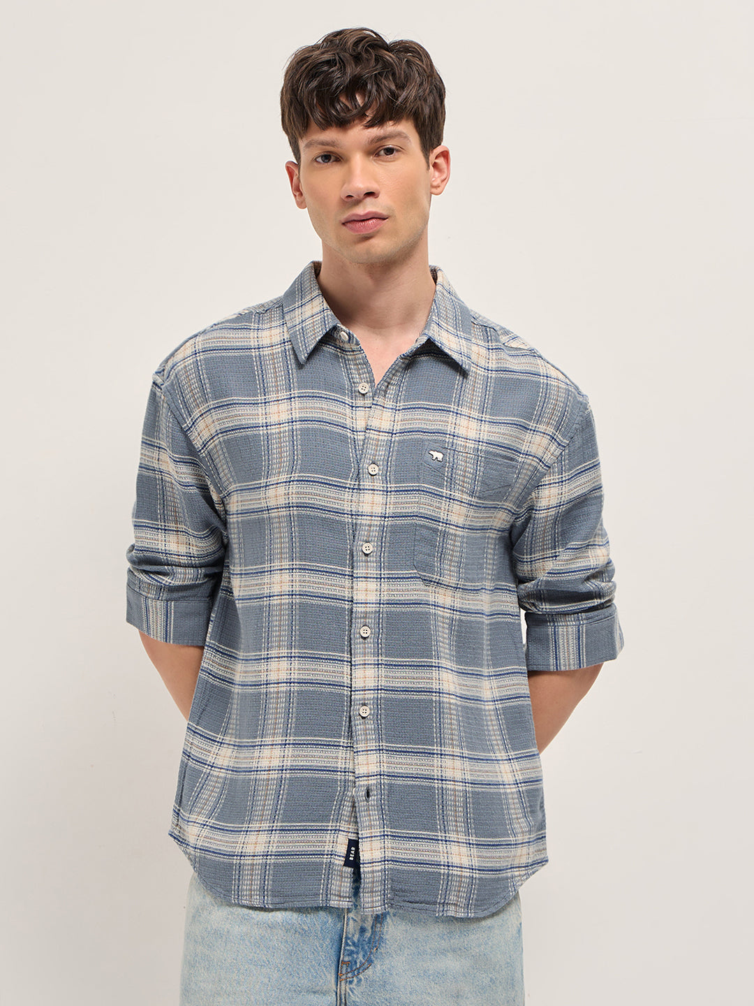 Grey and Cream Waffle Checked Textured Relaxed Fit Casual Shirt