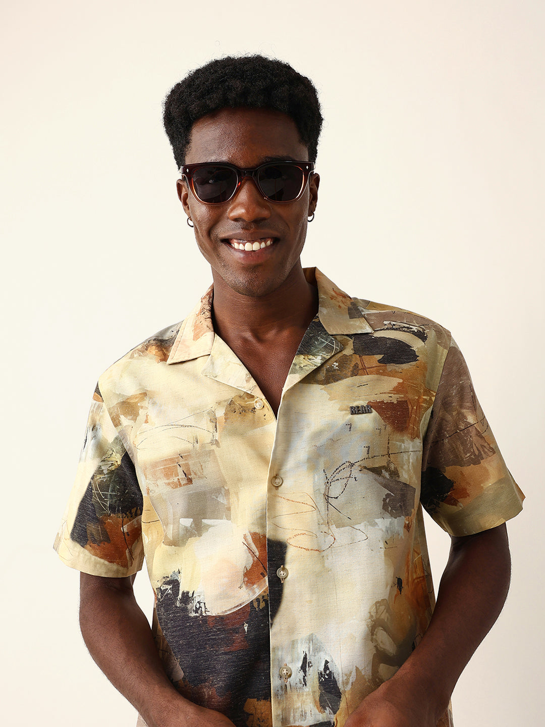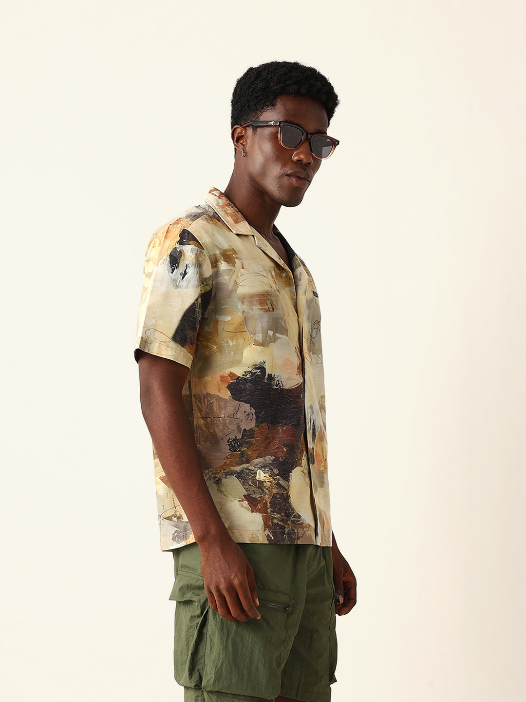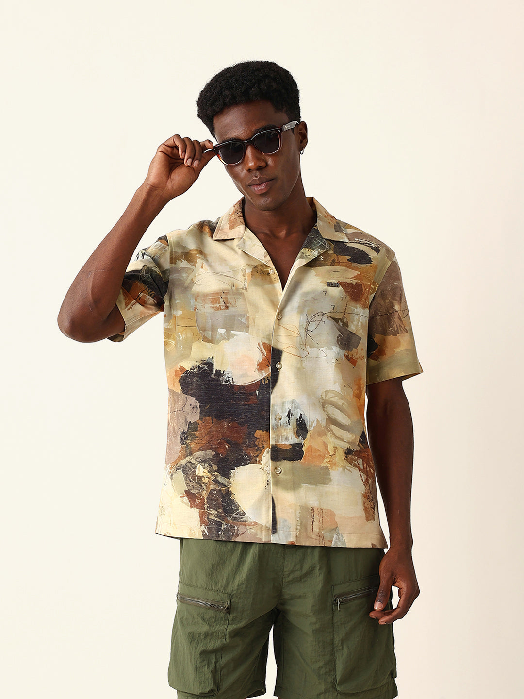 Shop Multicolor Abstract Brushstroke Print Cuban Collar Relaxed Fit Casual Shirt Online.