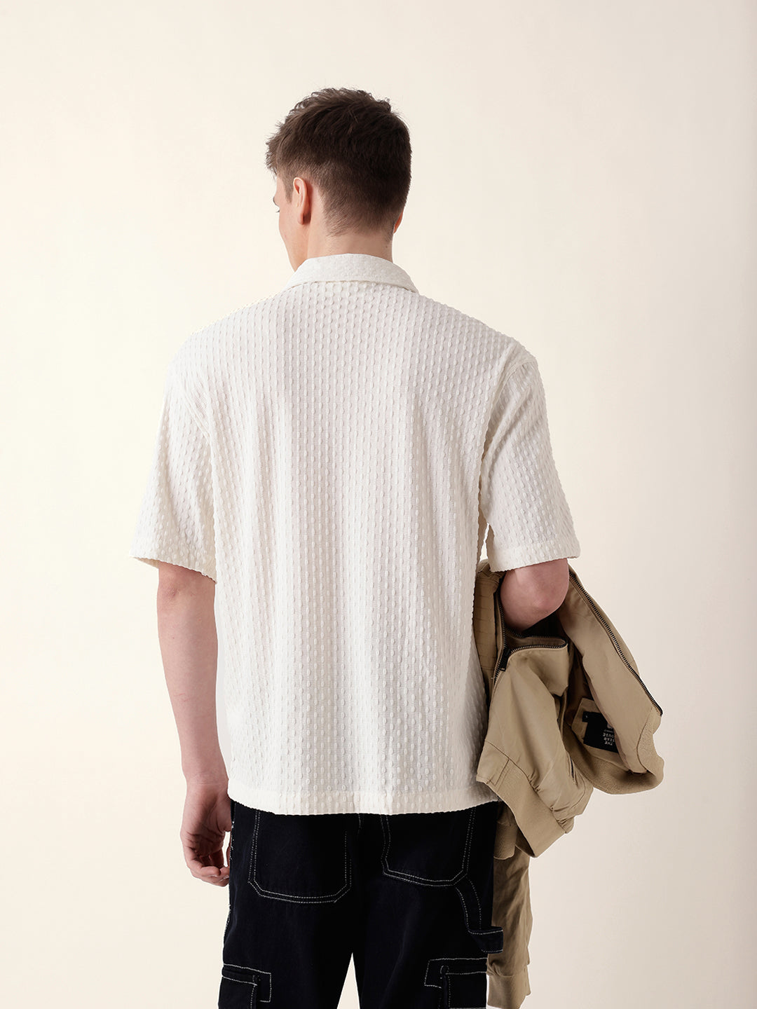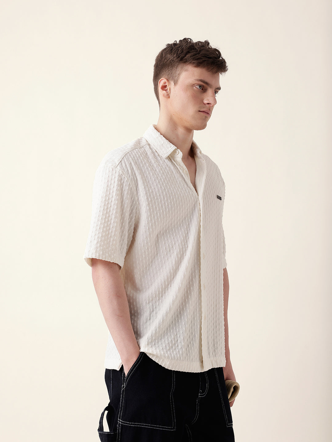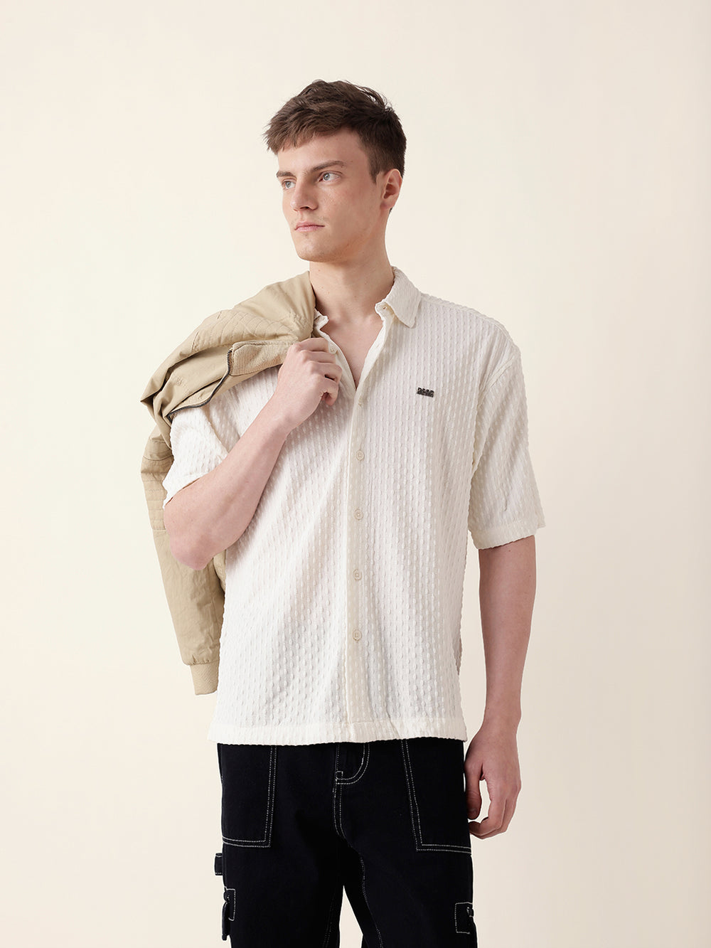 Shop White Textured Woven Oversized Fit Half Sleeve Casual Shirt Online.