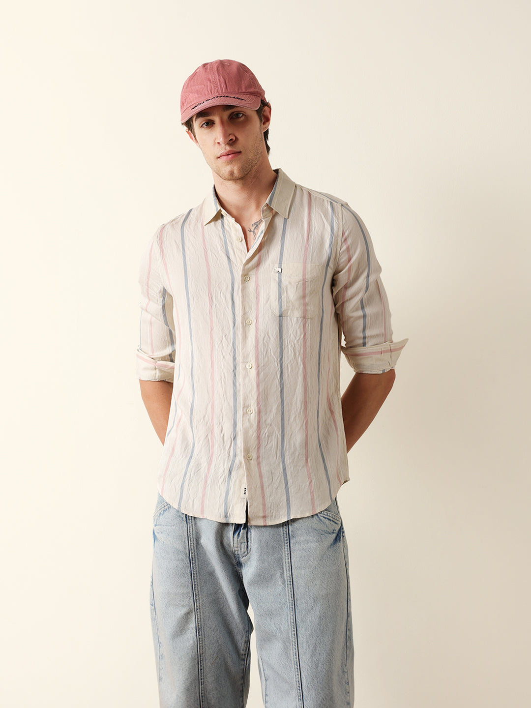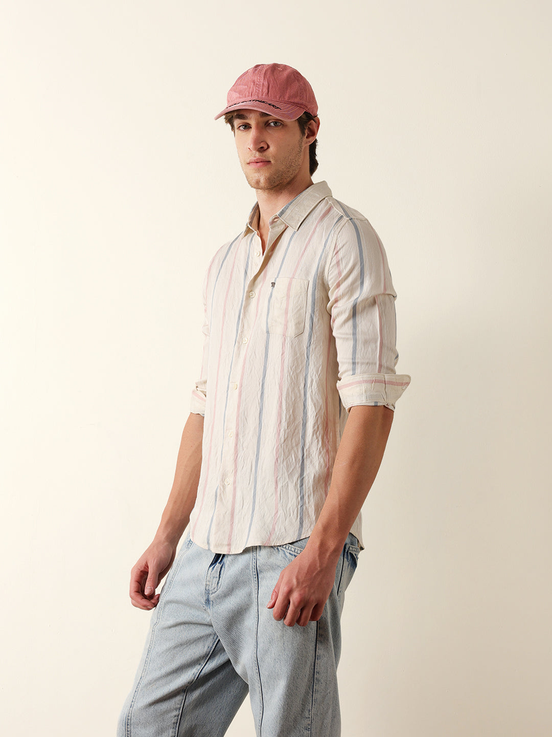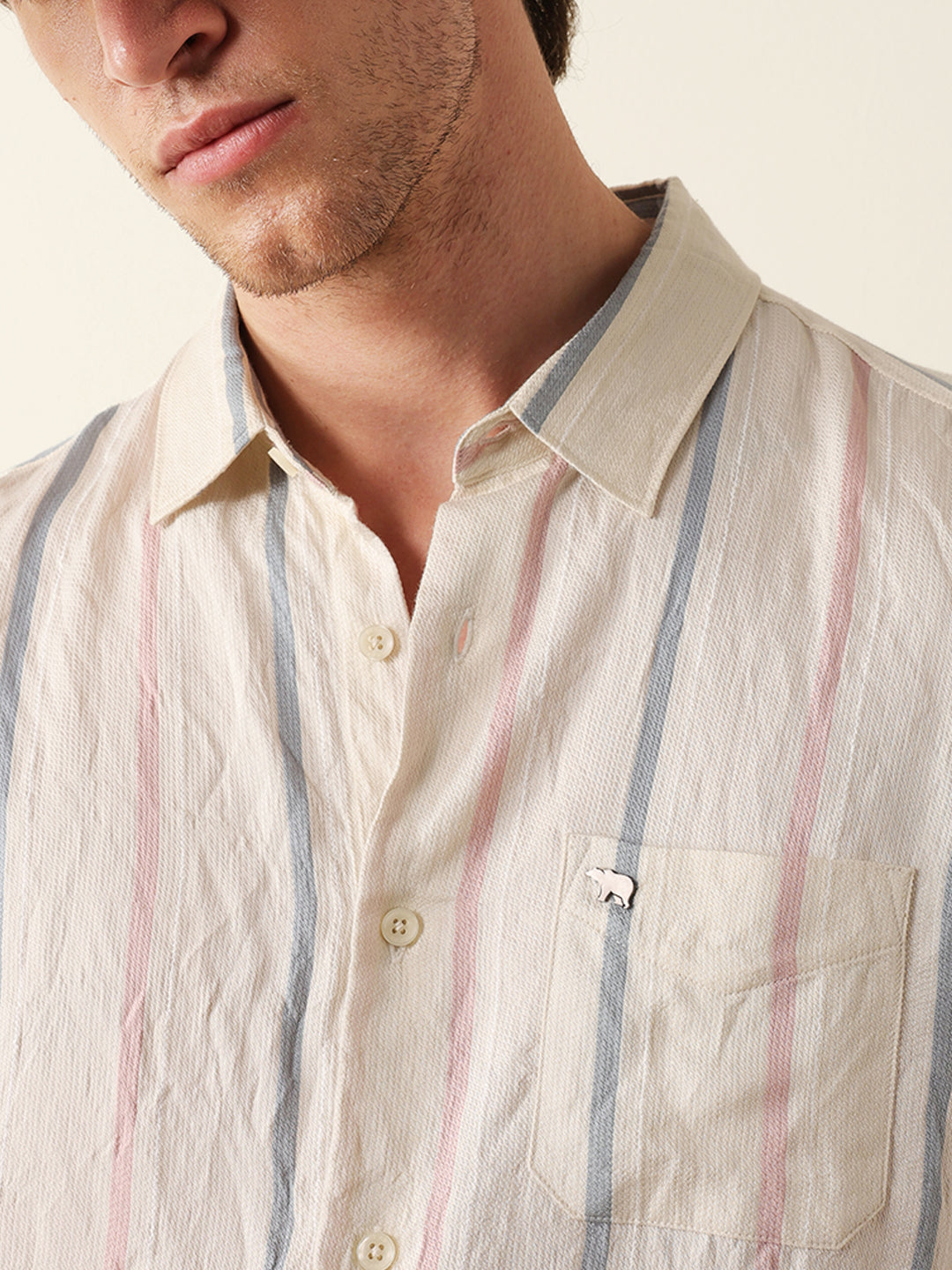 Shop Cream Vertical Woven Stripe Slim Fit Casual Shirt Online.