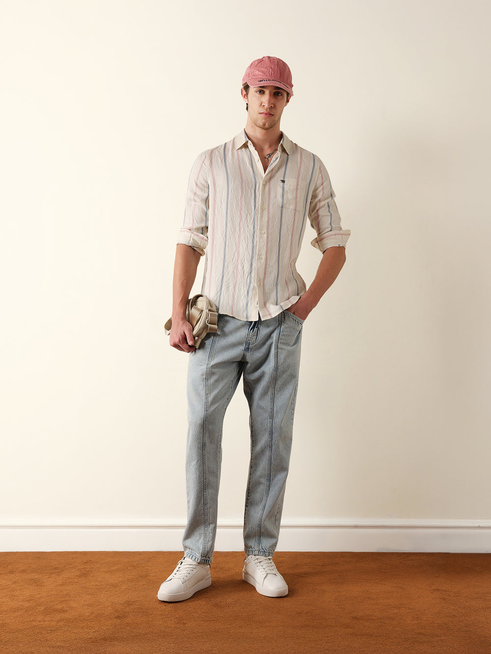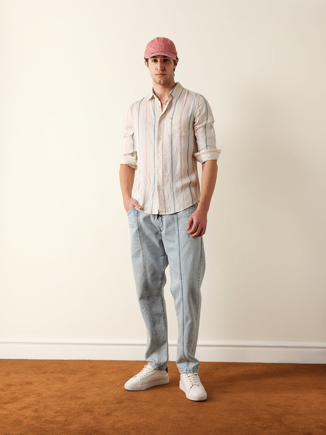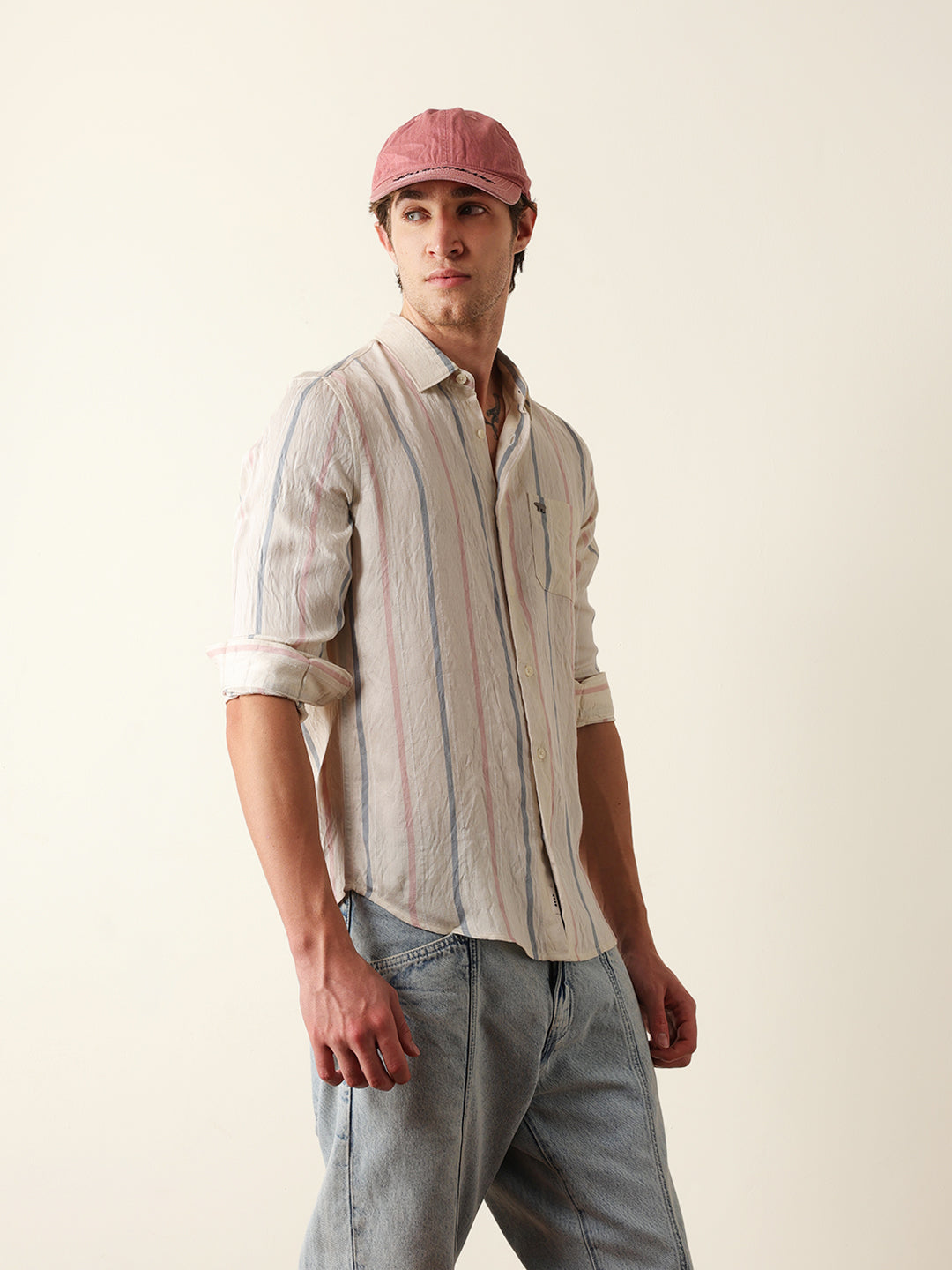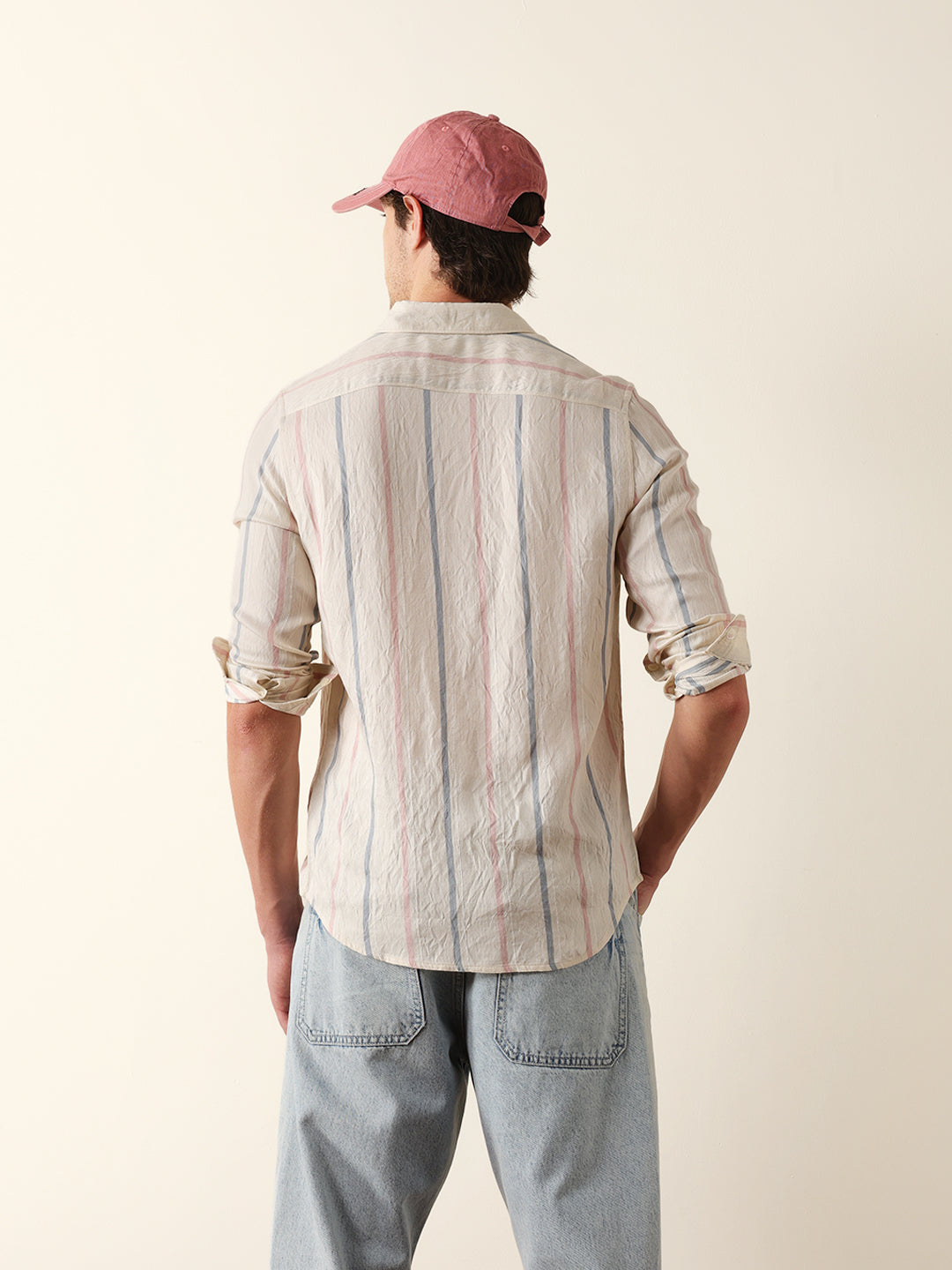Shop Cream Vertical Woven Stripe Slim Fit Casual Shirt Online.