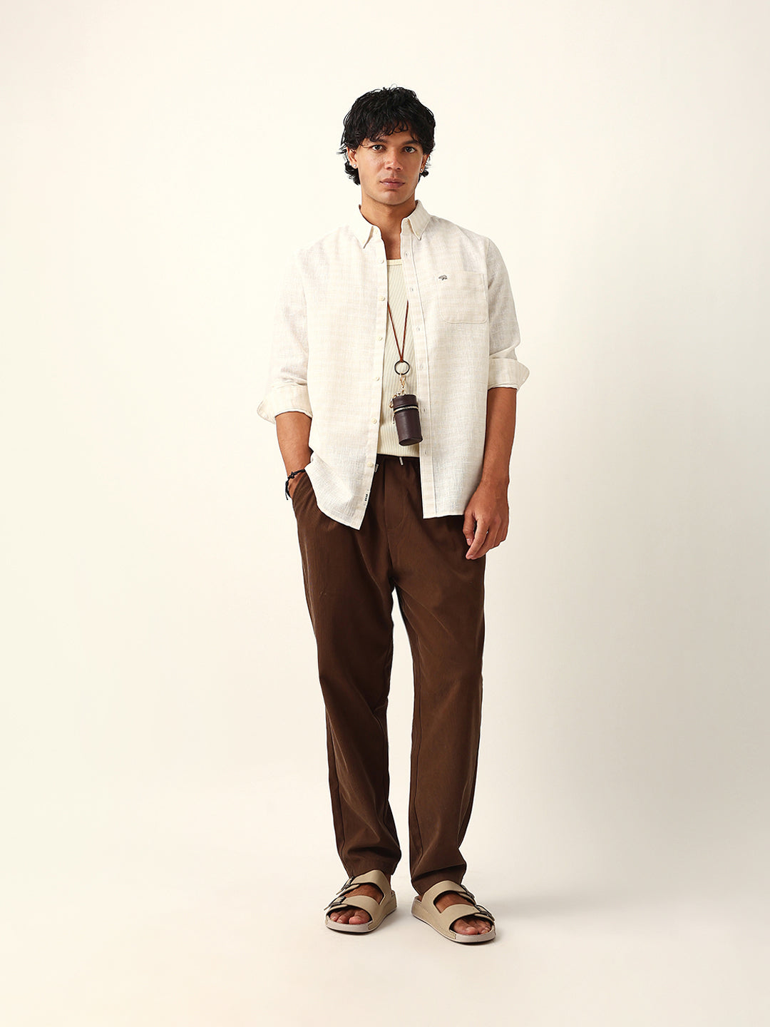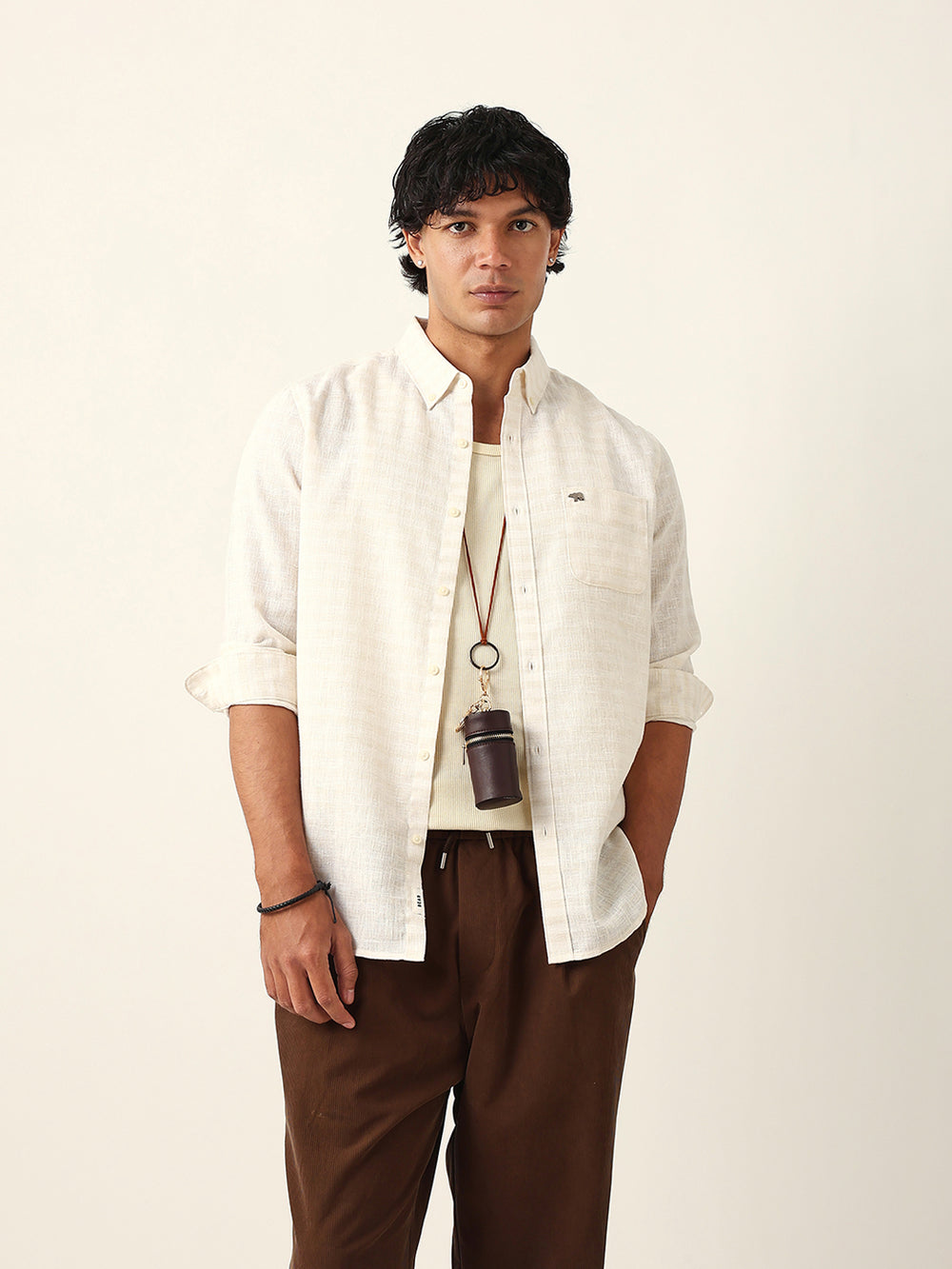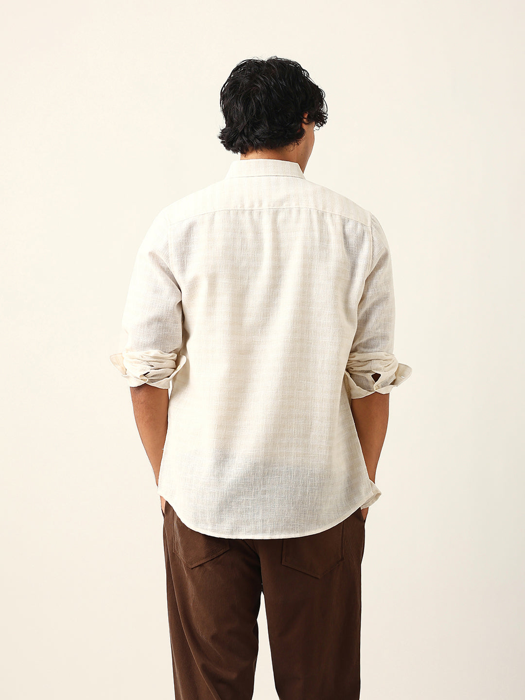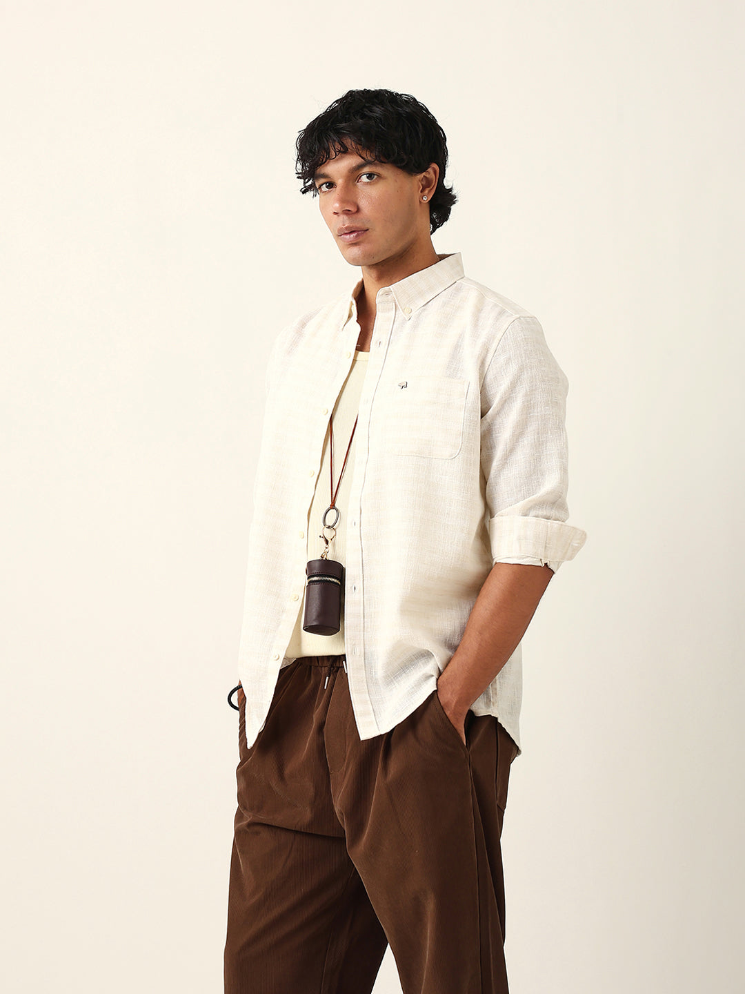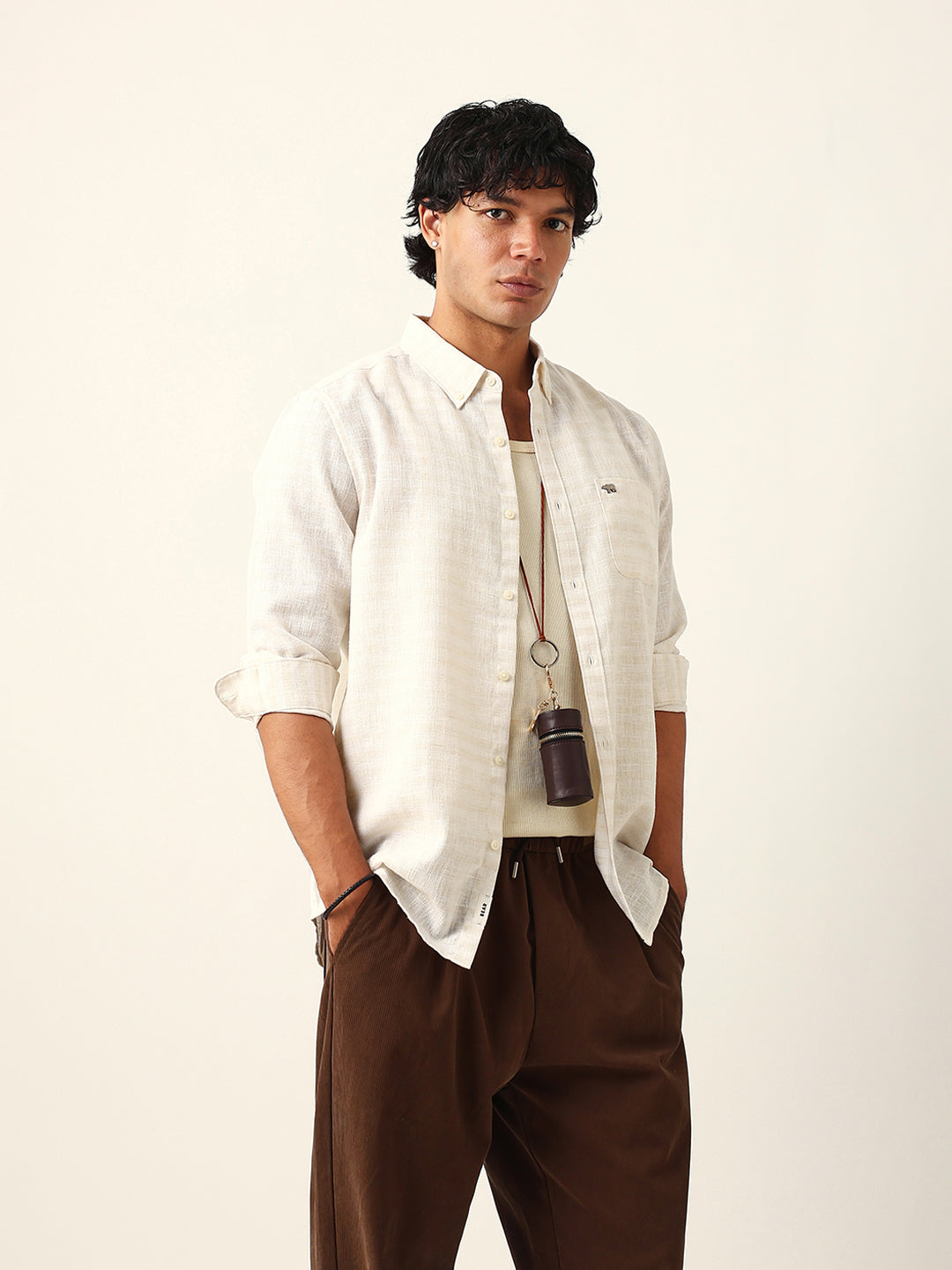 Shop Cream Woven Checked Slim Fit Casual Shirt with Button-Down Collar Online.