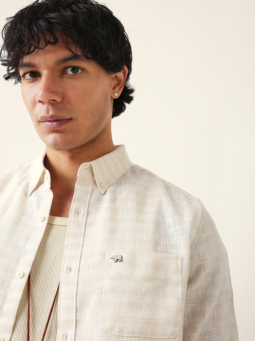 Cream Woven Checked Slim Fit Casual Shirt with Button-Down Collar