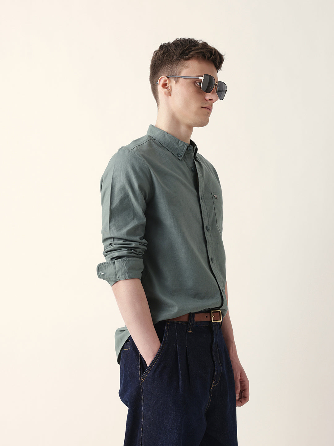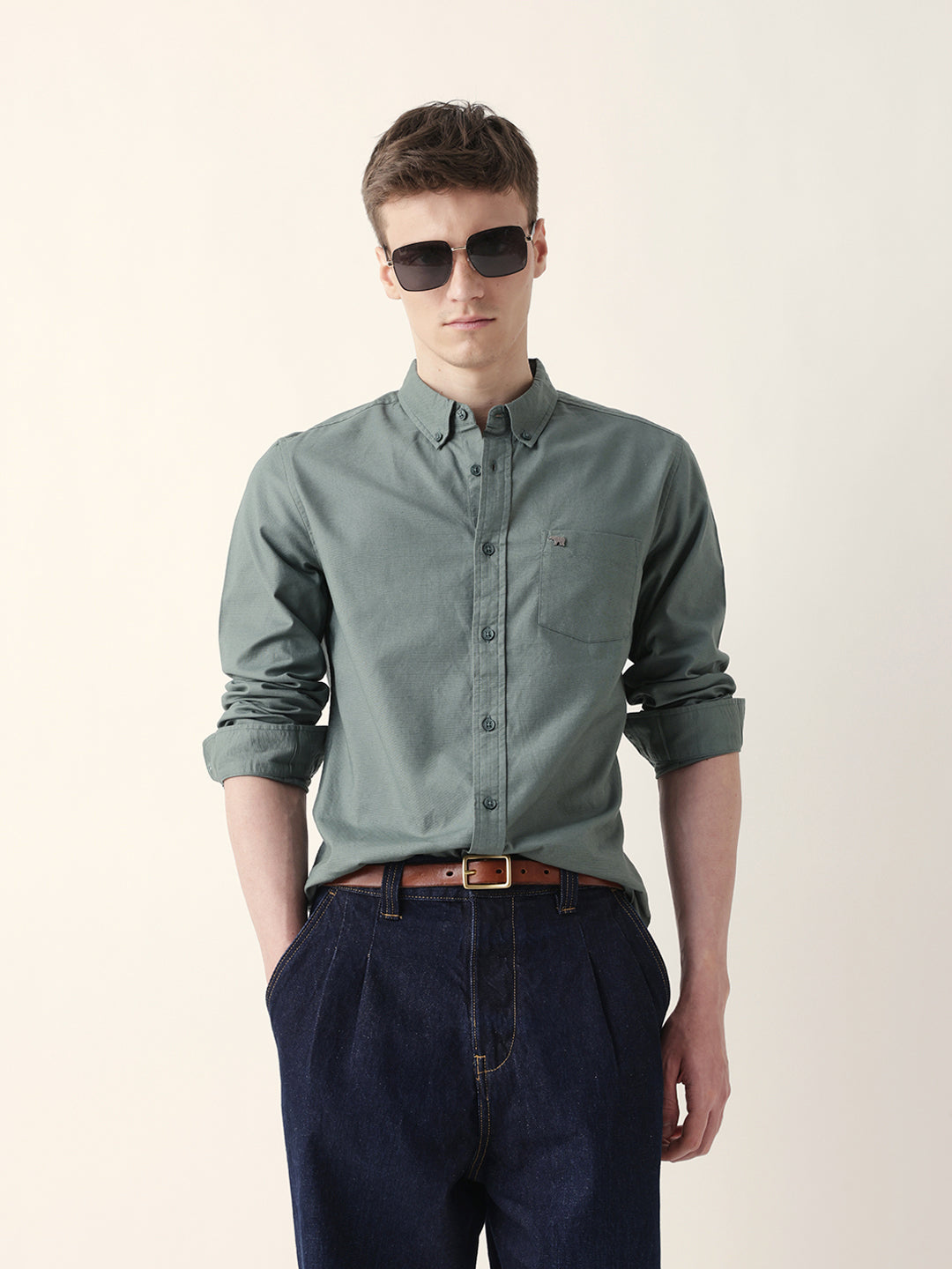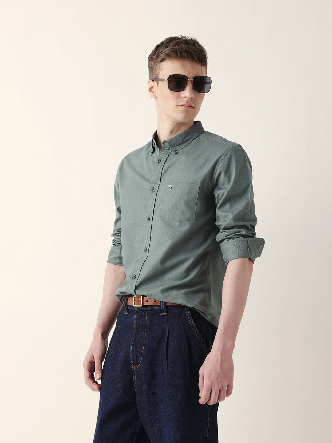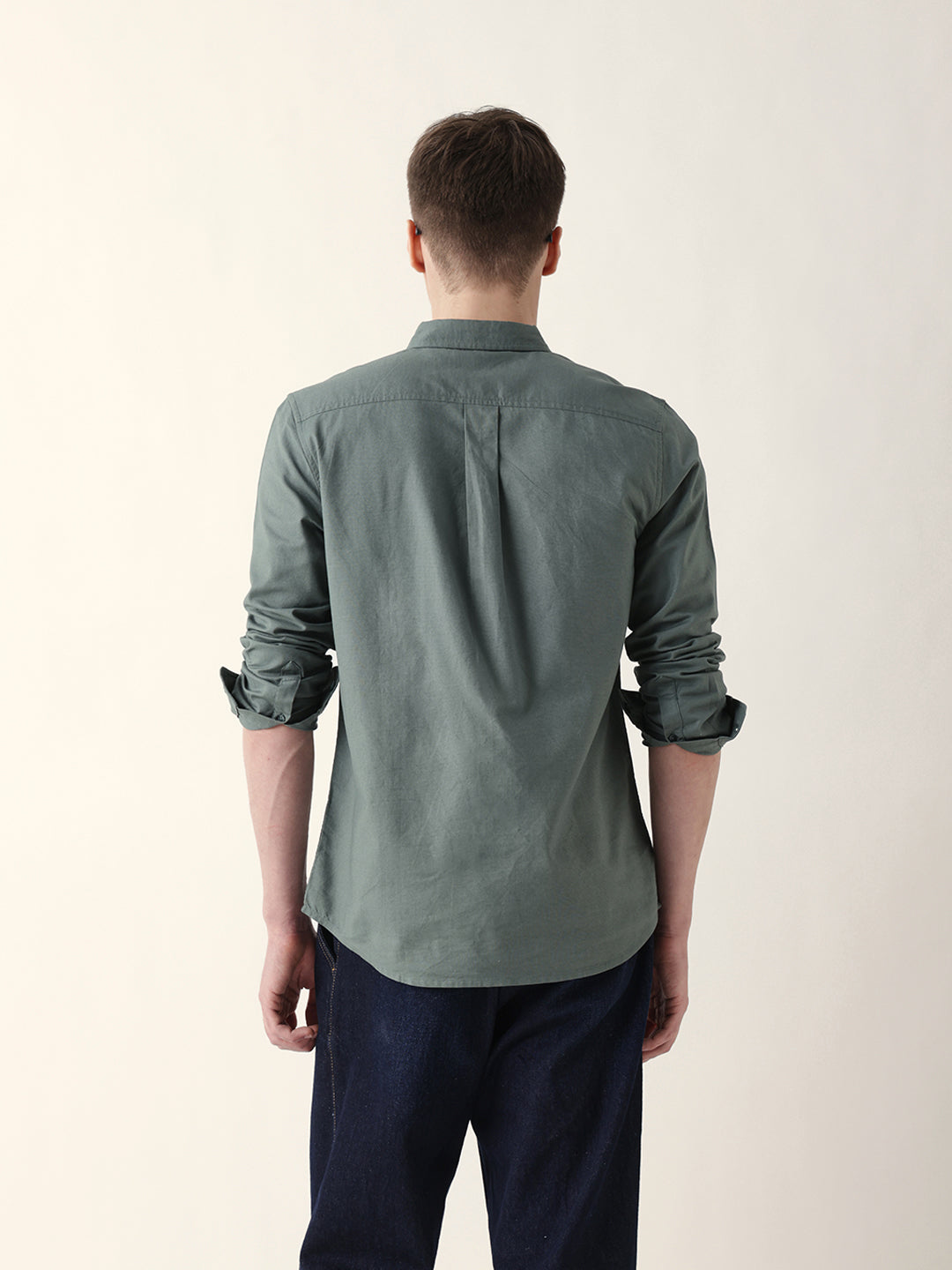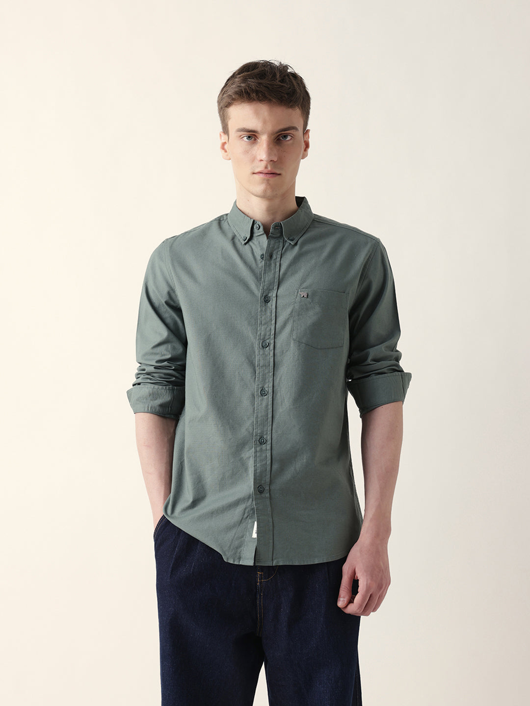 Green Solid Slim-Fit Casual Shirt with Button-Down Collar