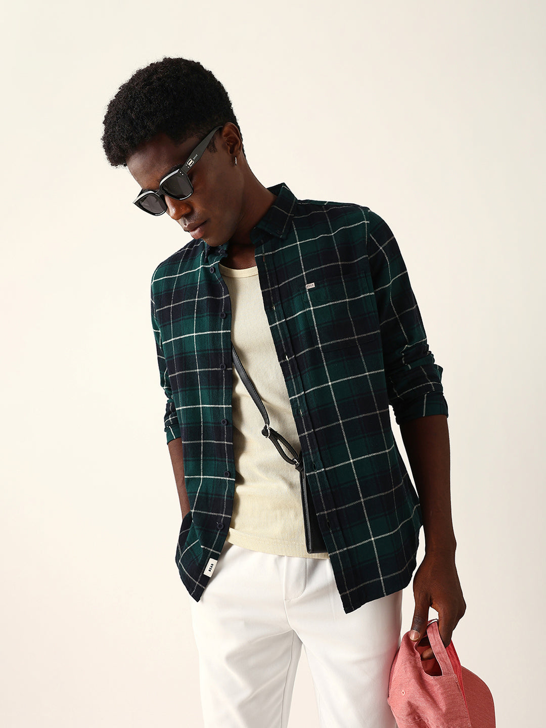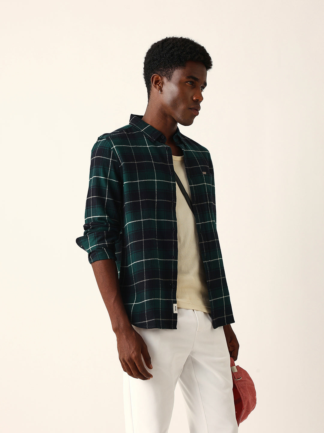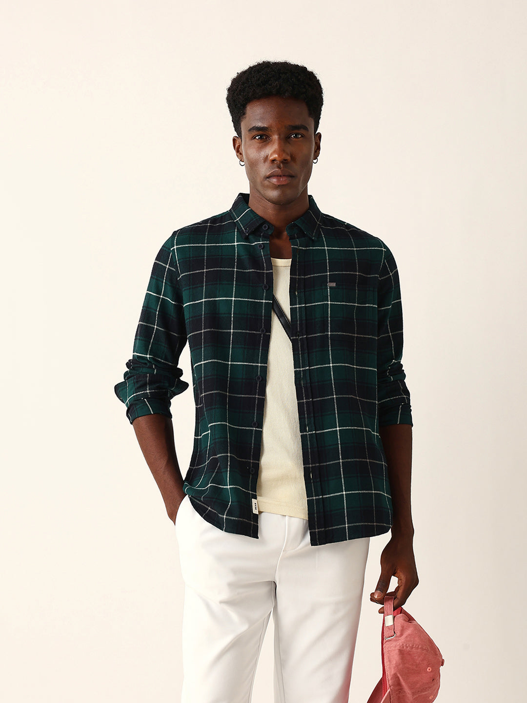 Shop Dark Green & Black Flannel Checked Slim Fit Casual Shirt Online.