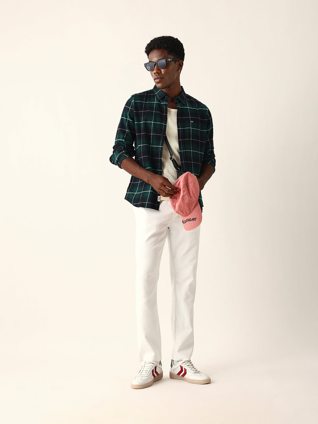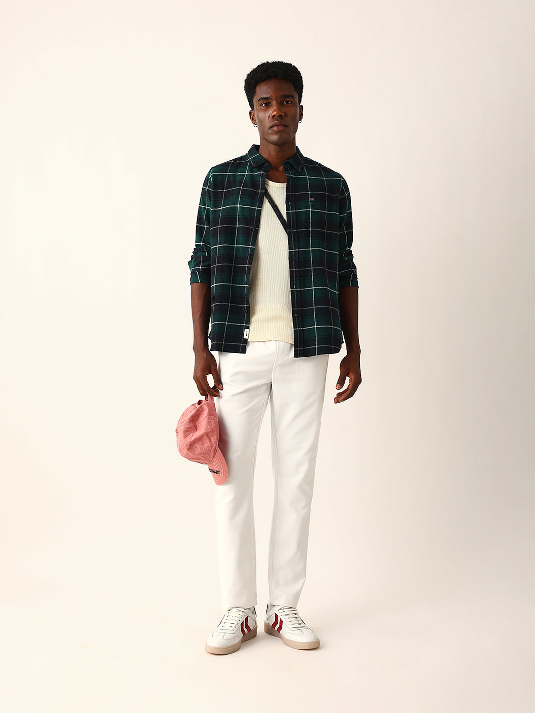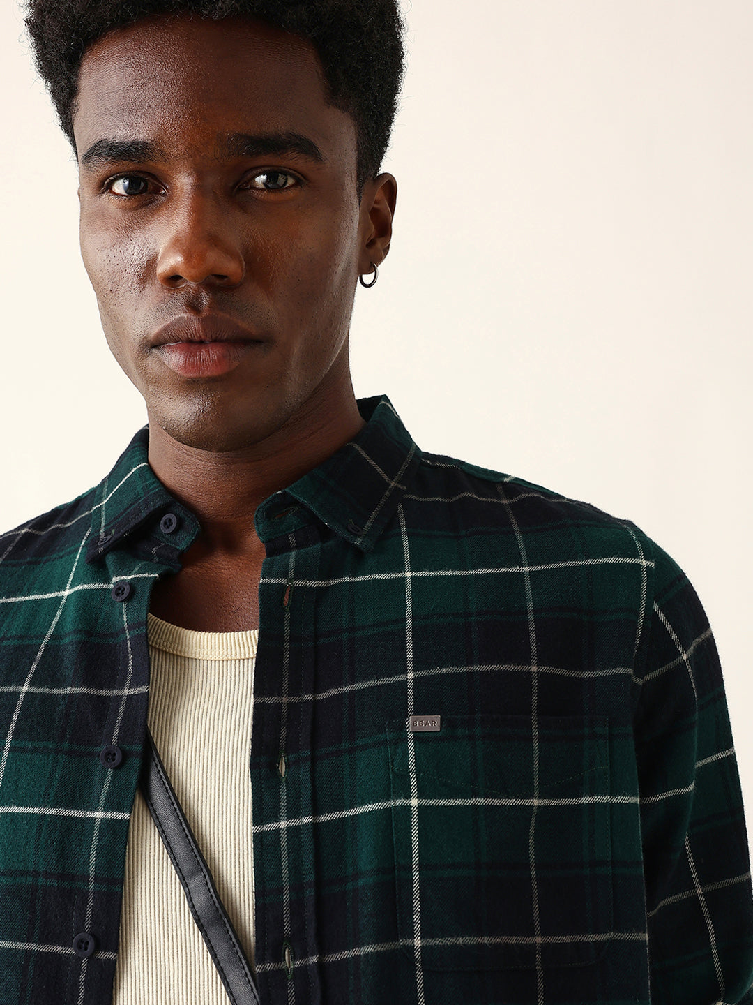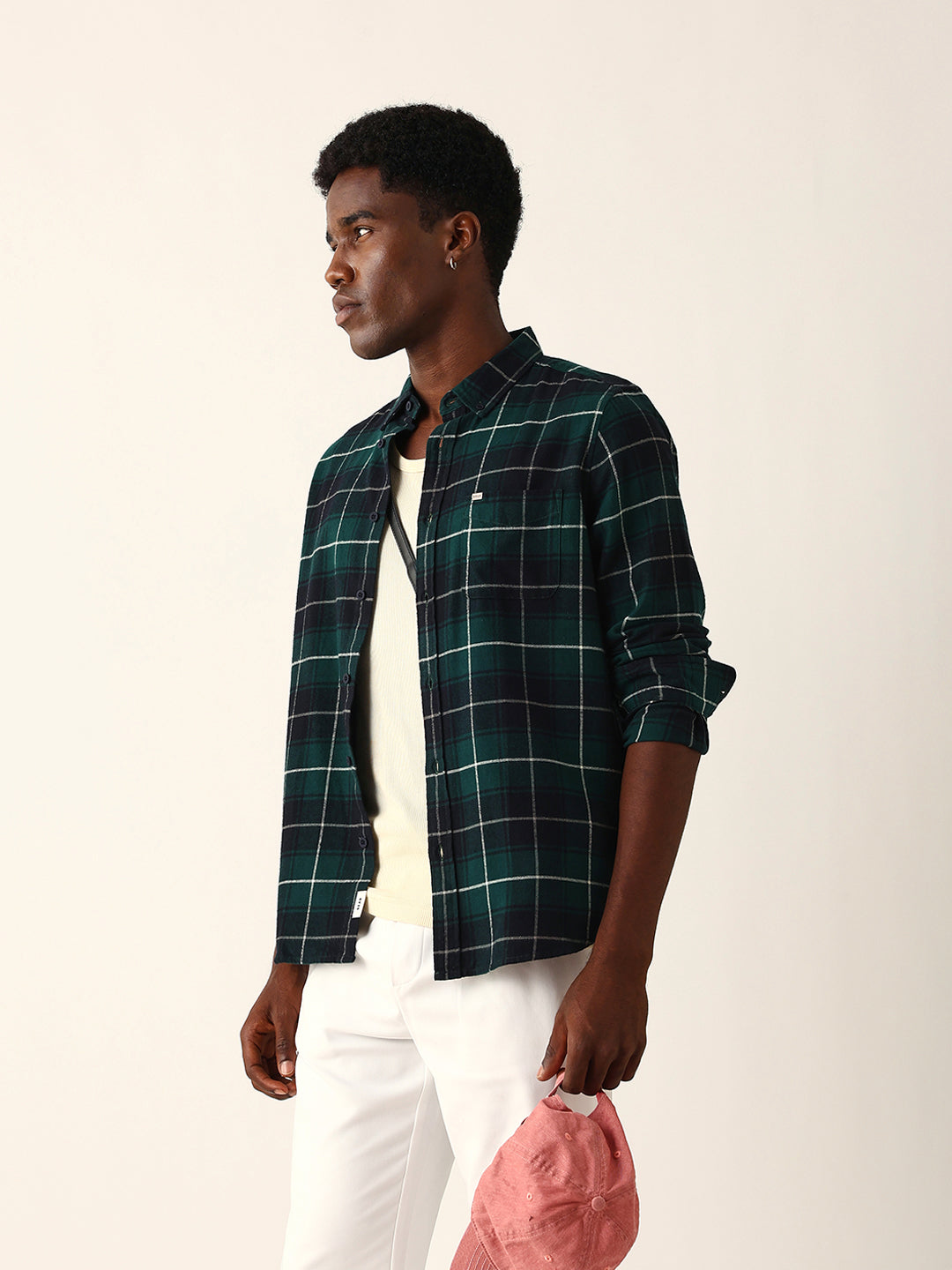 Shop Dark Green & Black Flannel Checked Slim Fit Casual Shirt Online.
