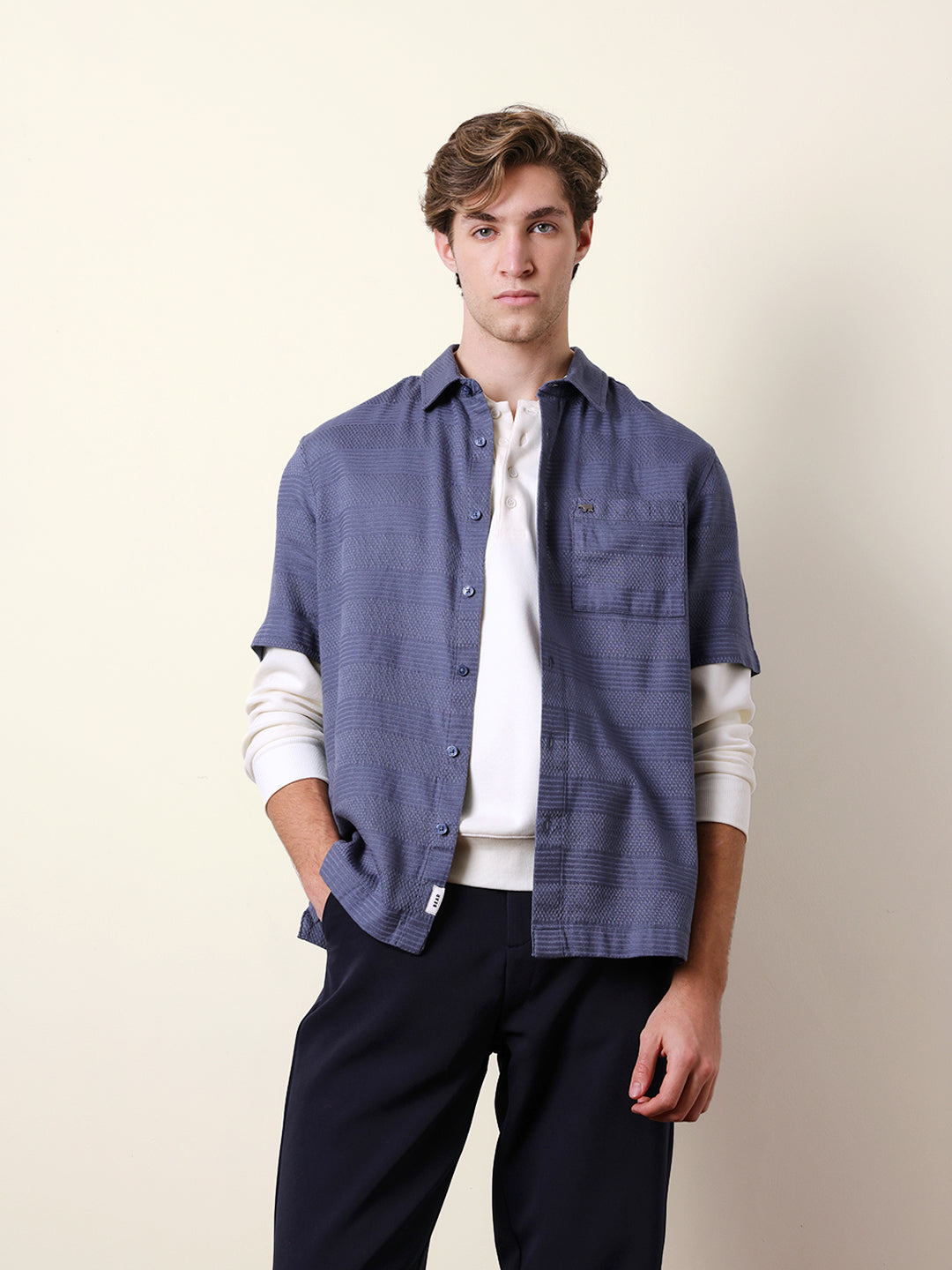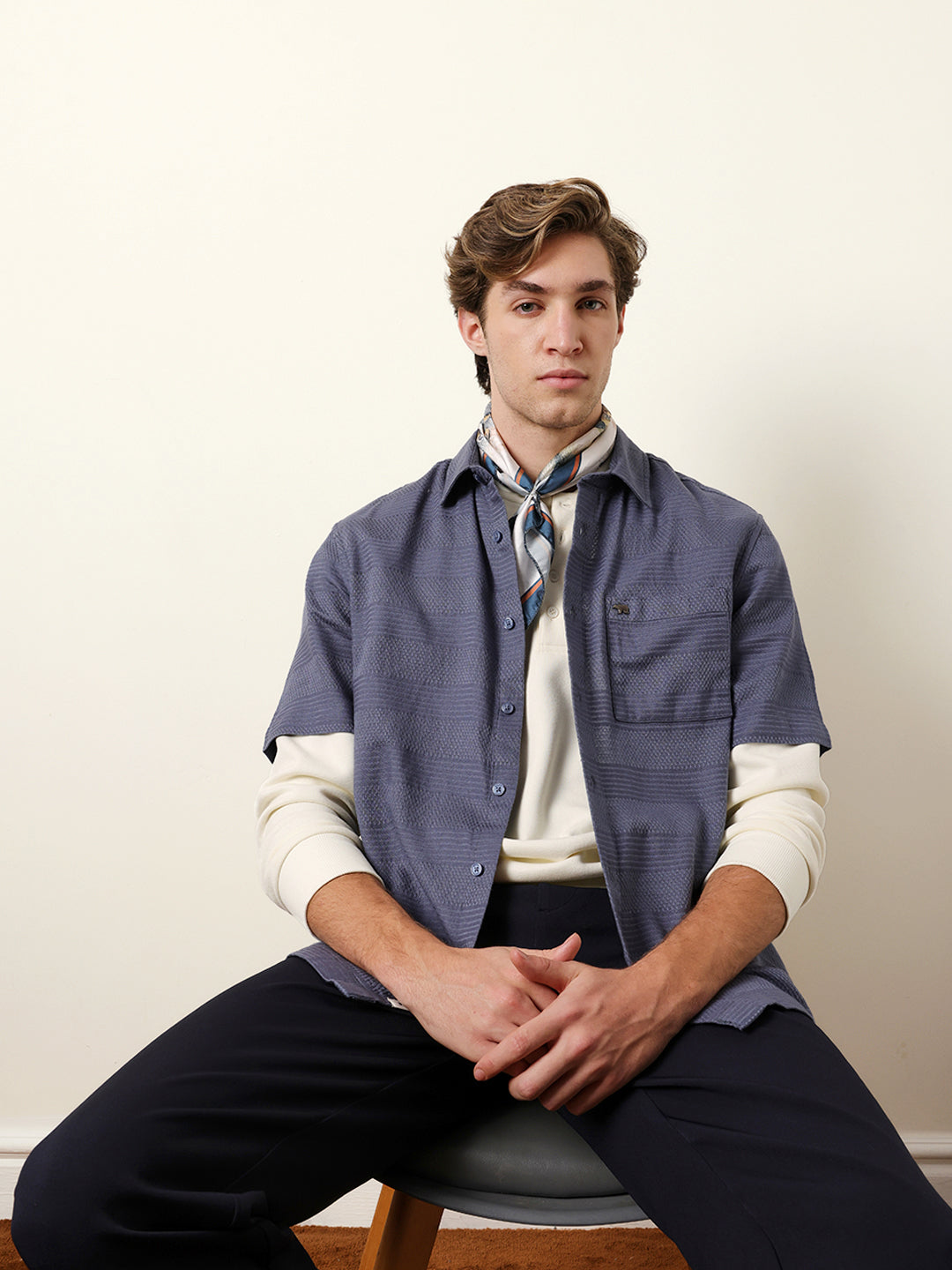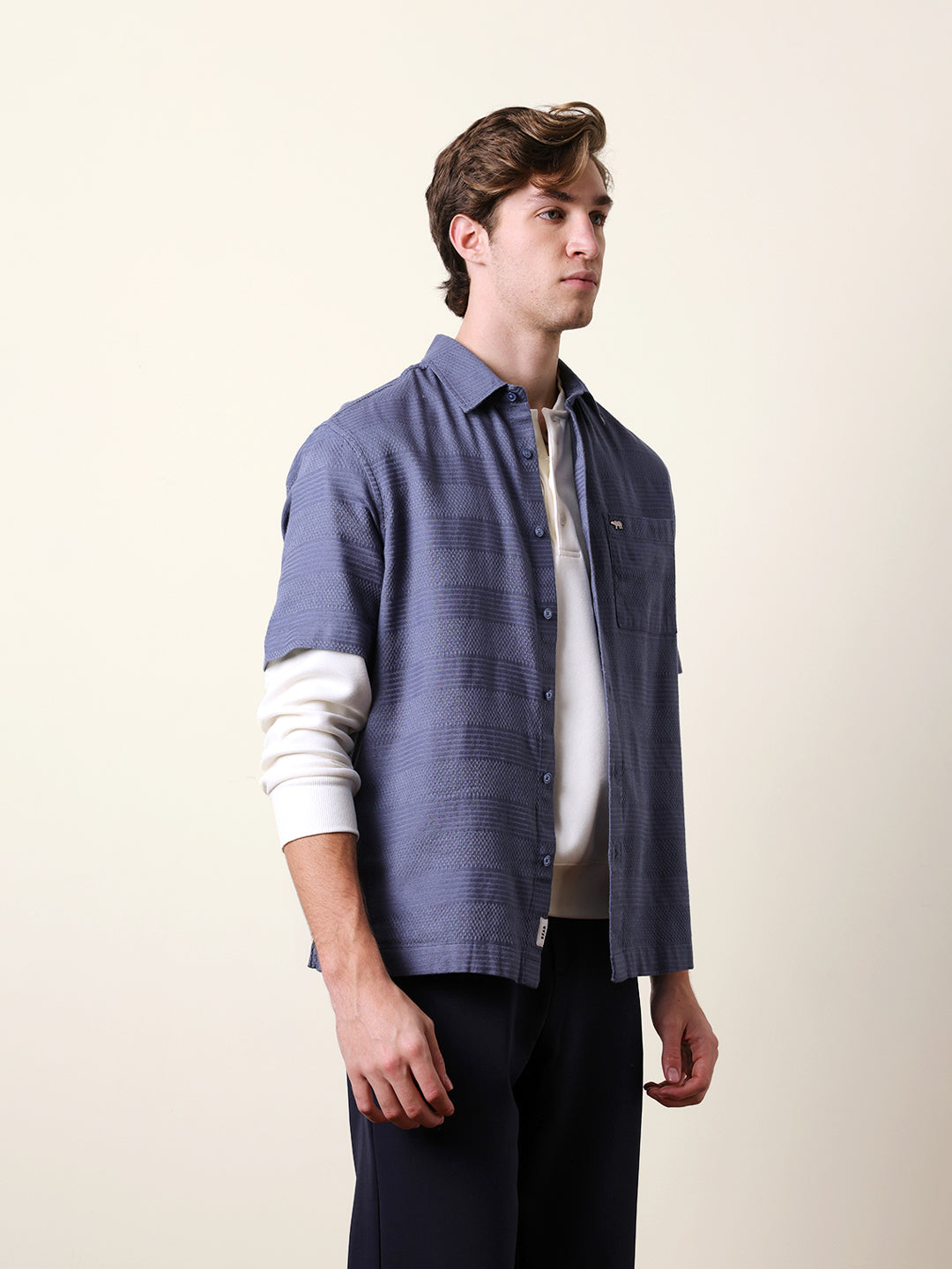 Shop Blue Relaxed Fit Casual Half Sleeve Shirt with Textured Horizontal Stripes Online.