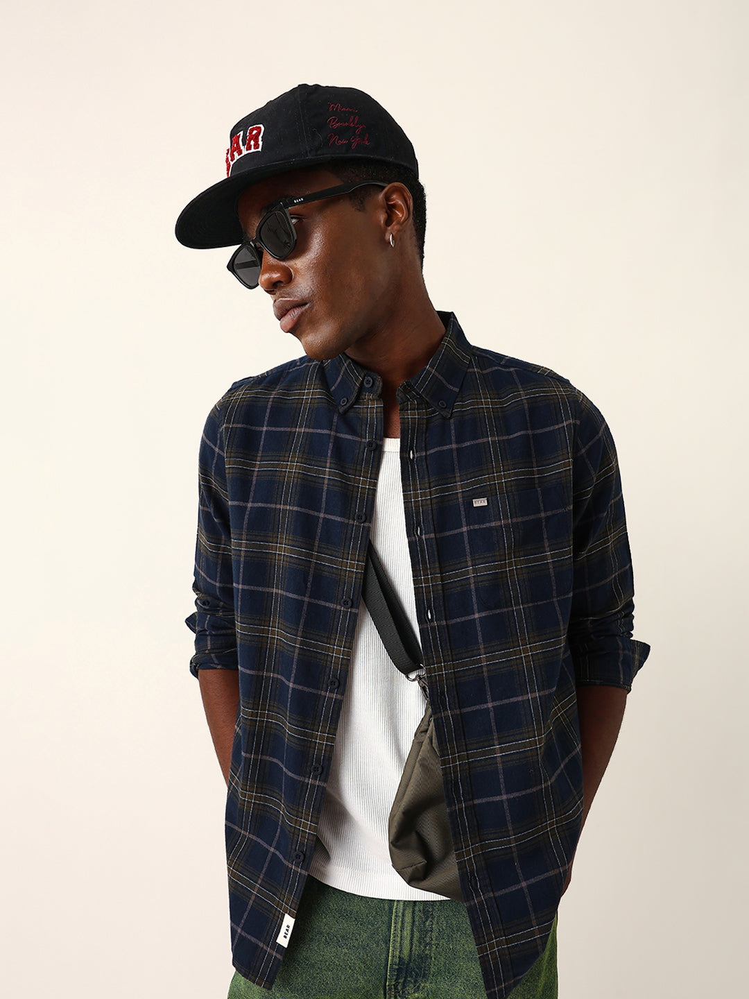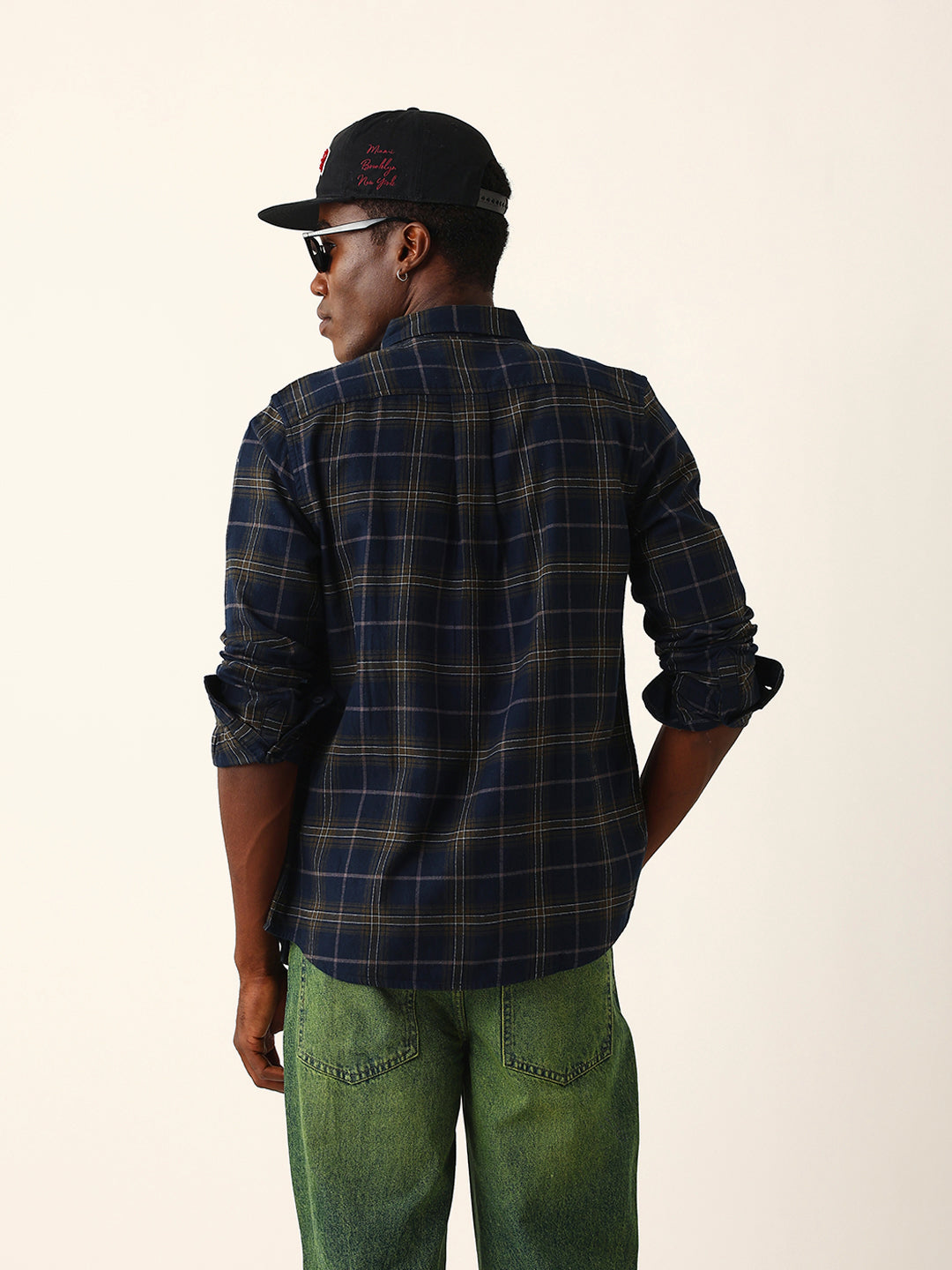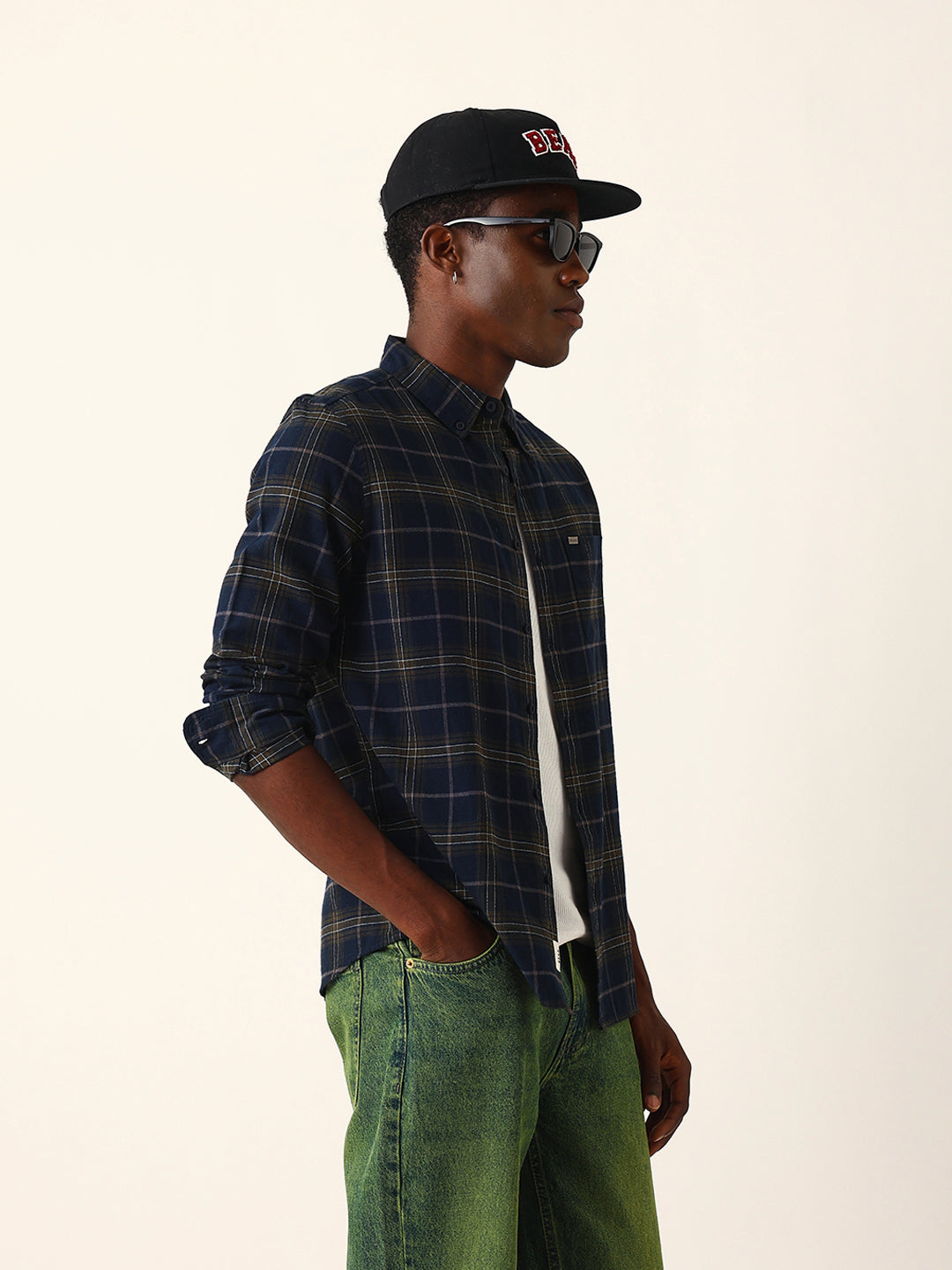 Blue & Mustard Woven Checked Slim Fit Casual Shirt