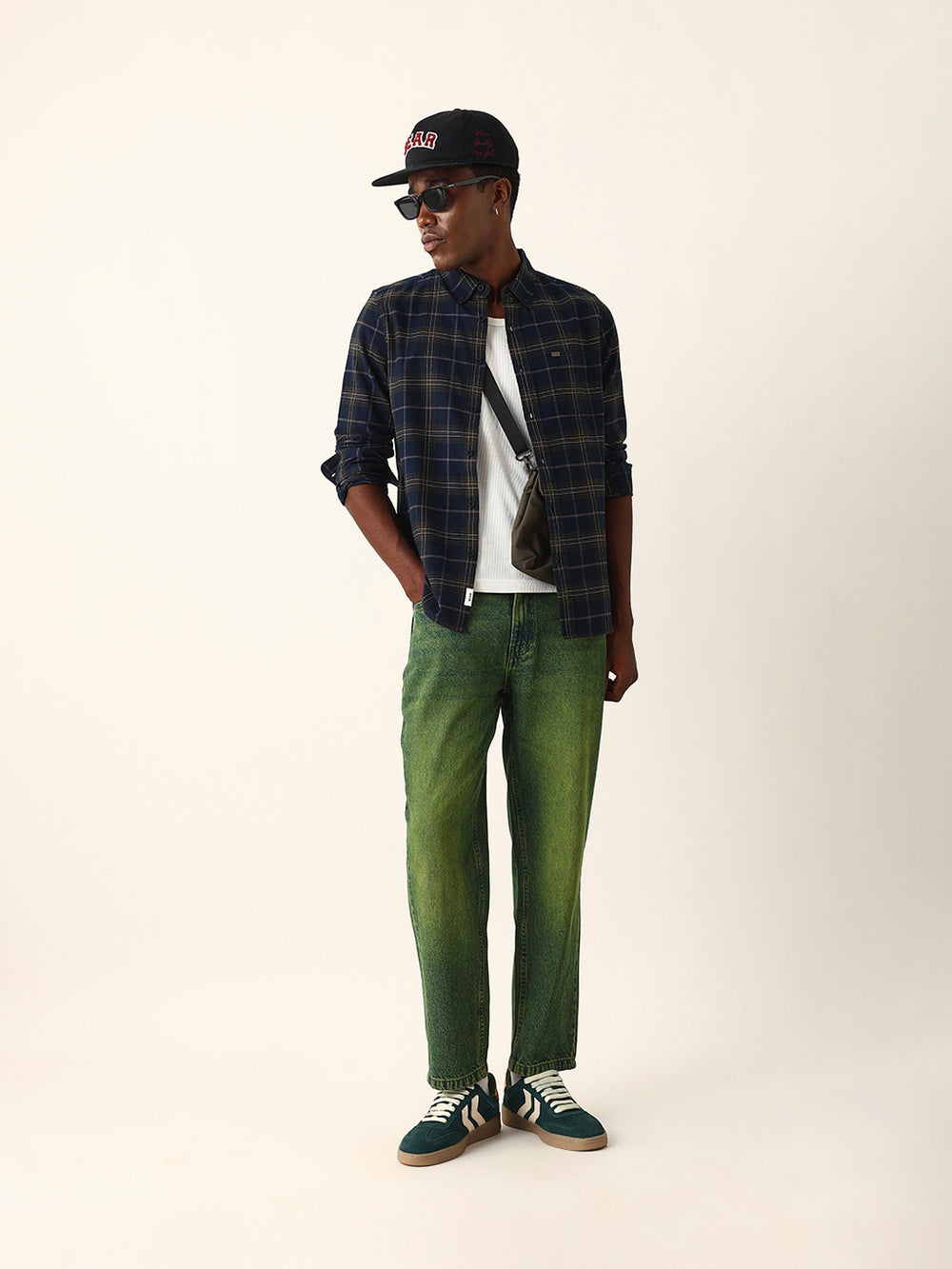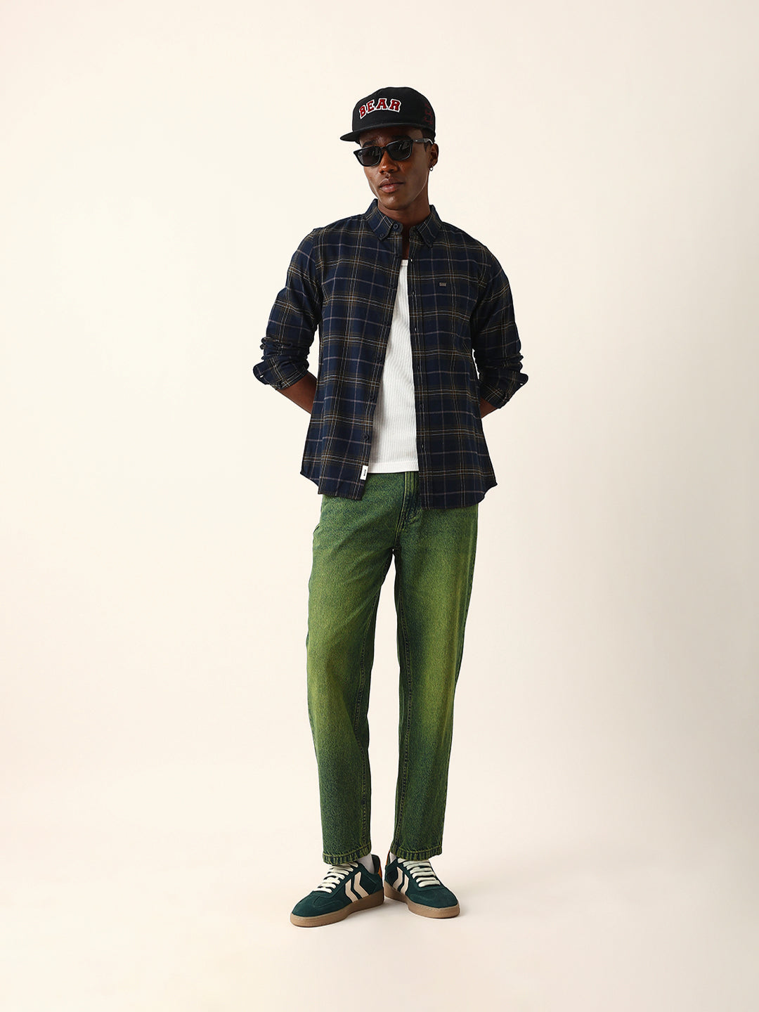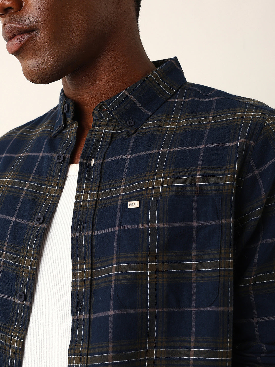 Blue & Mustard Woven Checked Slim Fit Casual Shirt