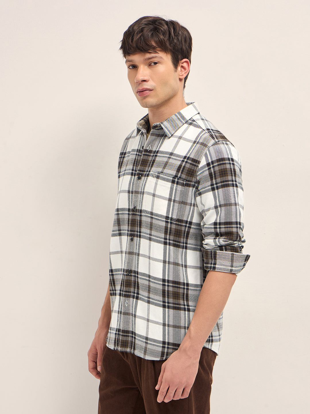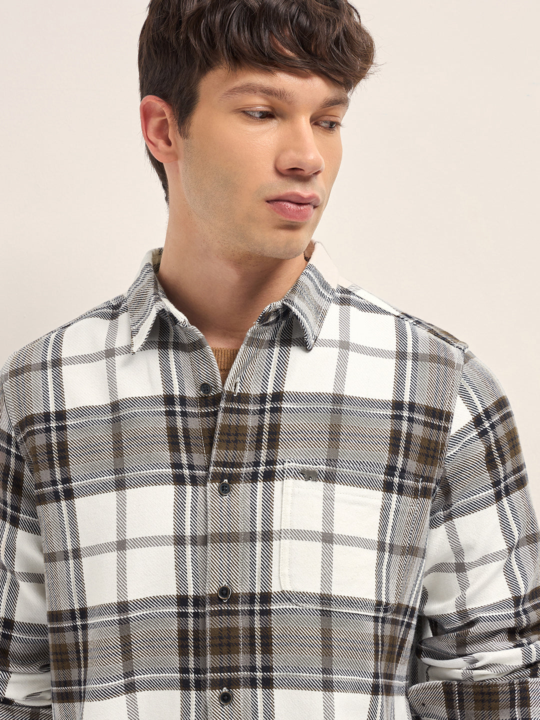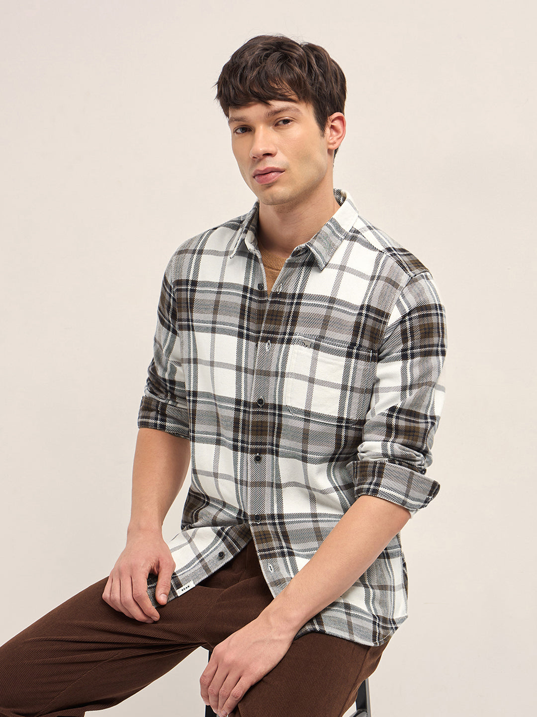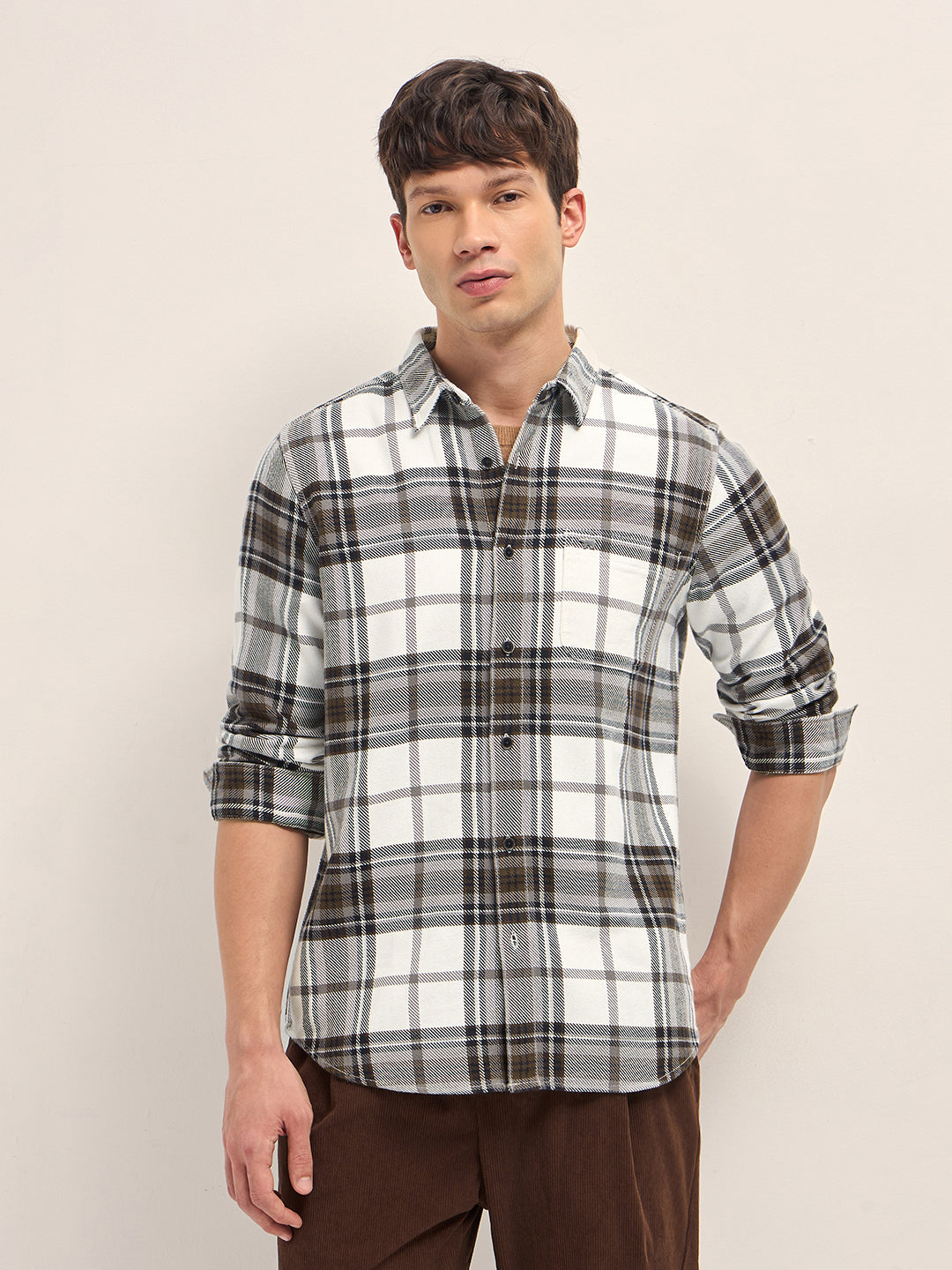 Shop Cream & Brown Woven Check Regular Fit Casual Shirt Online.