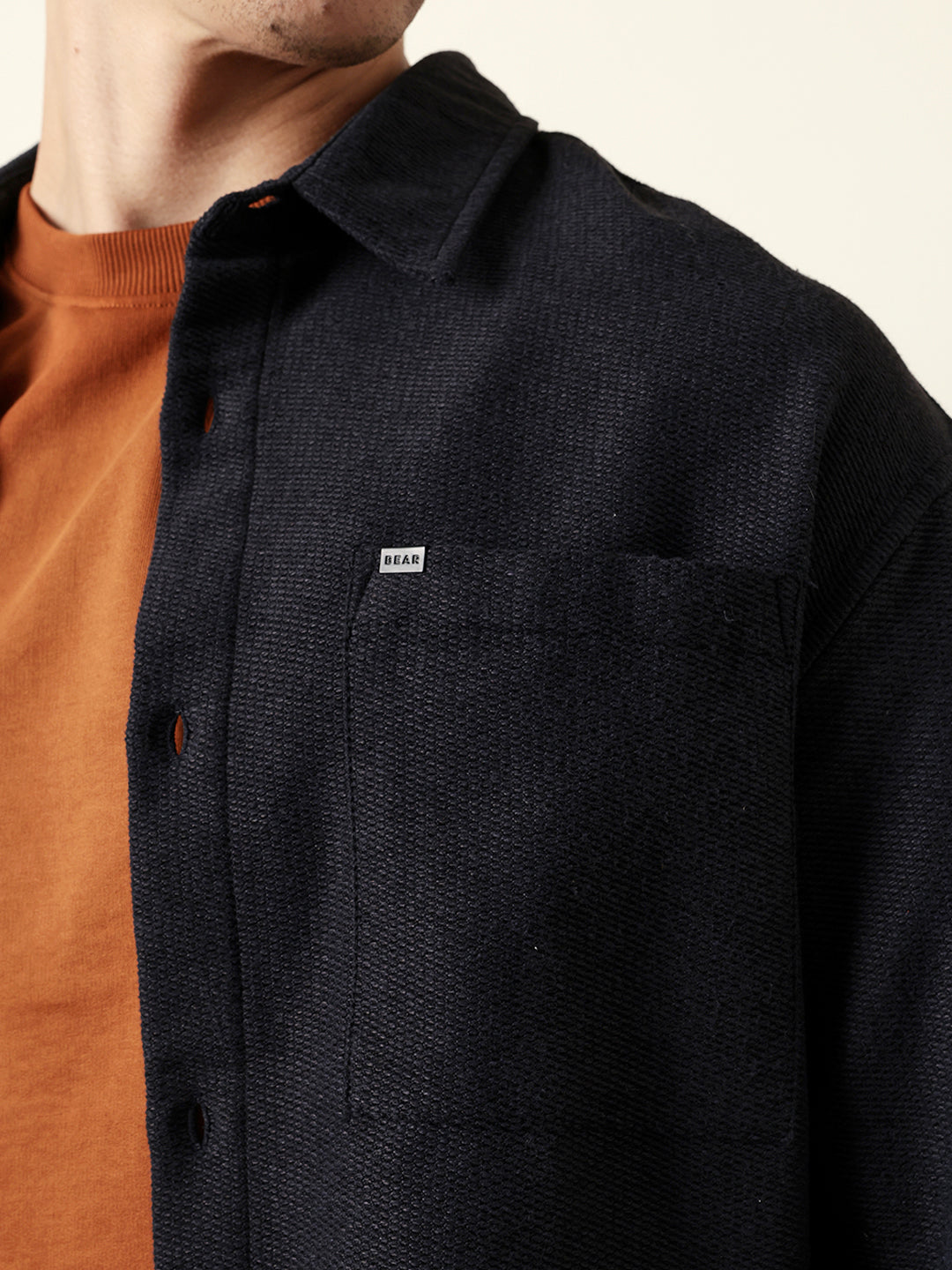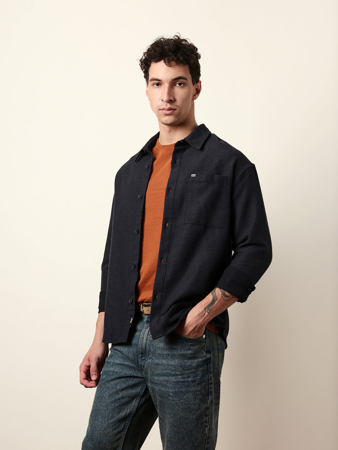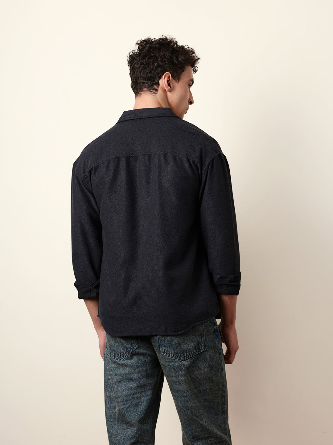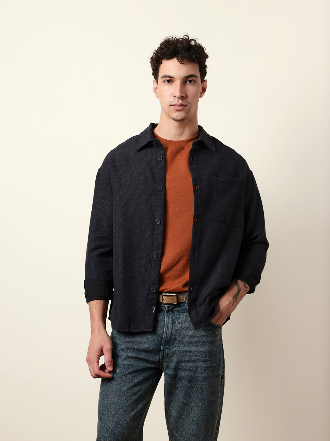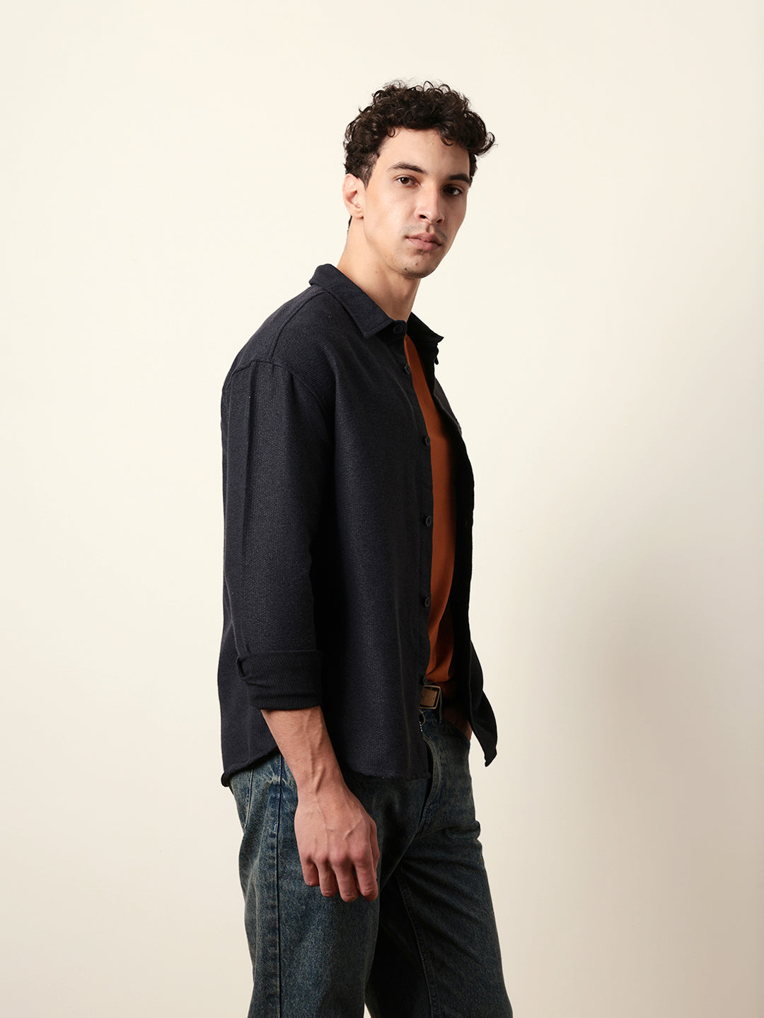 Dark Blue Textured Crepe Relaxed Fit Overshirt