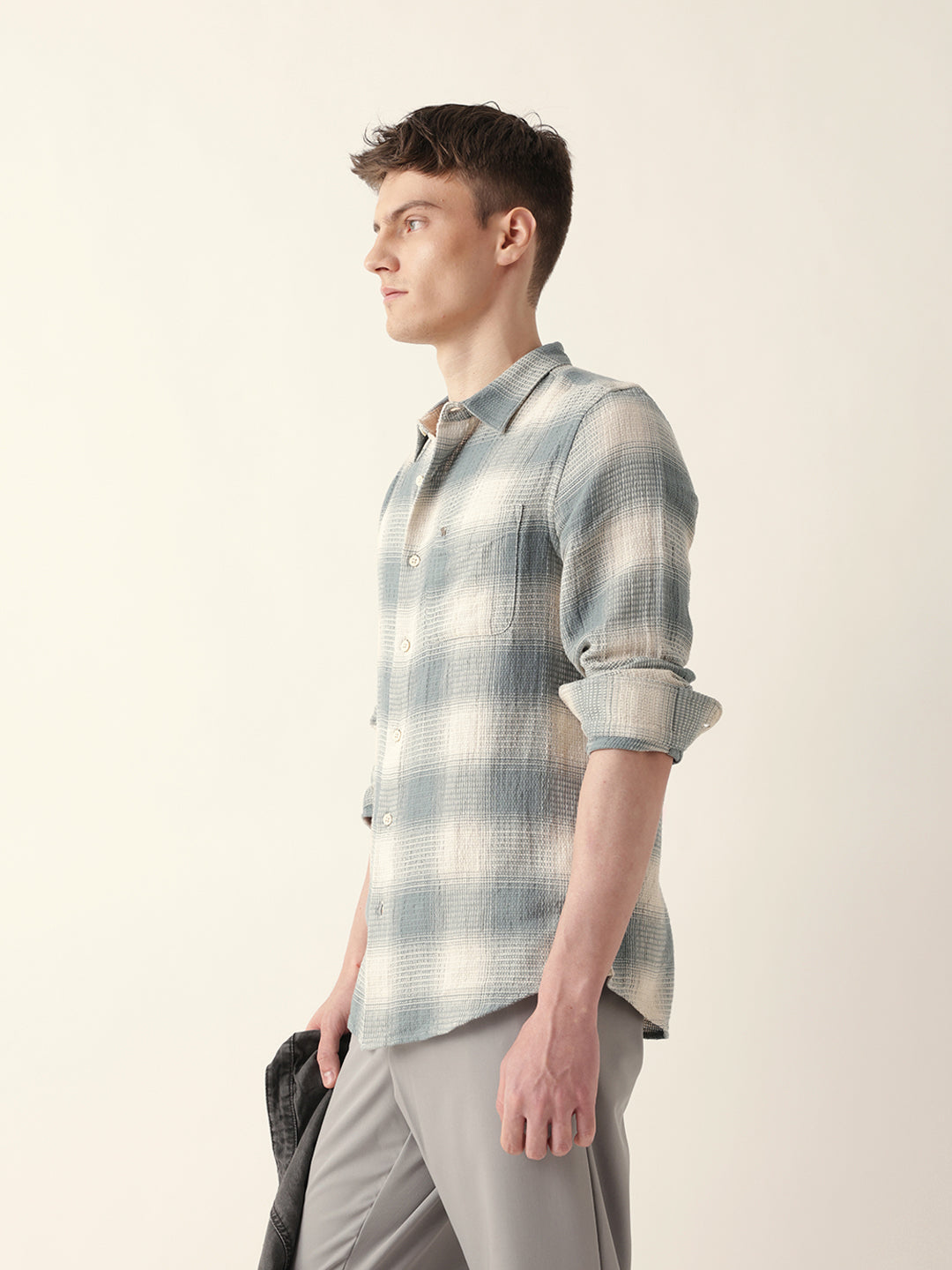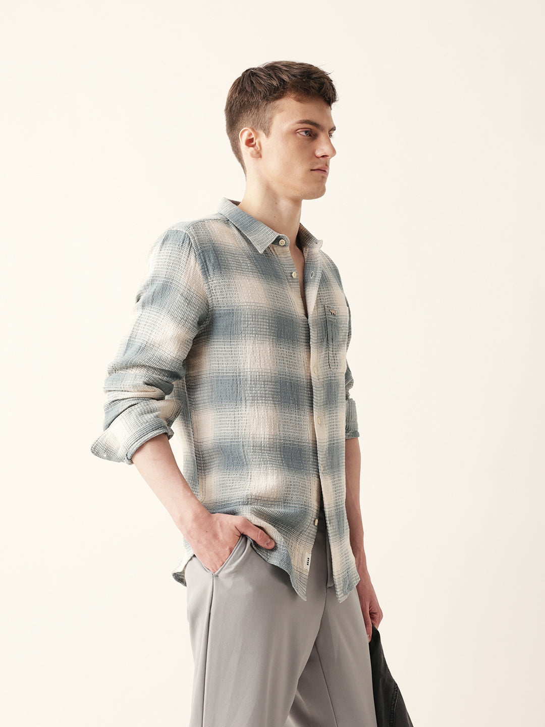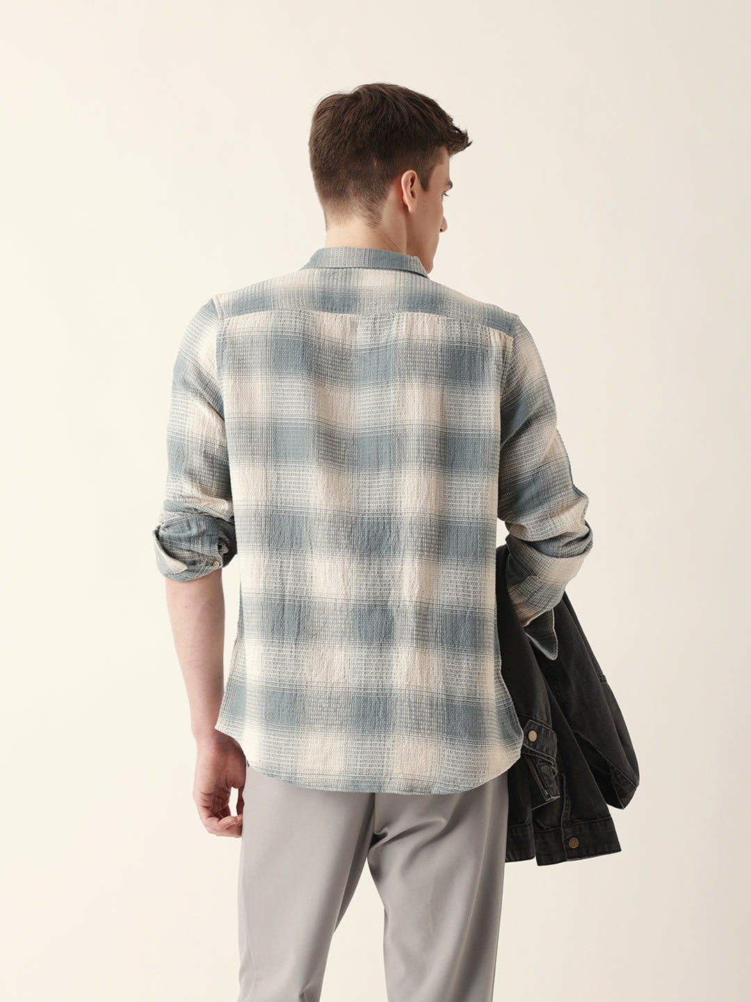 Teal & Cream Woven Textured Checks Regular Fit Casual Shirt