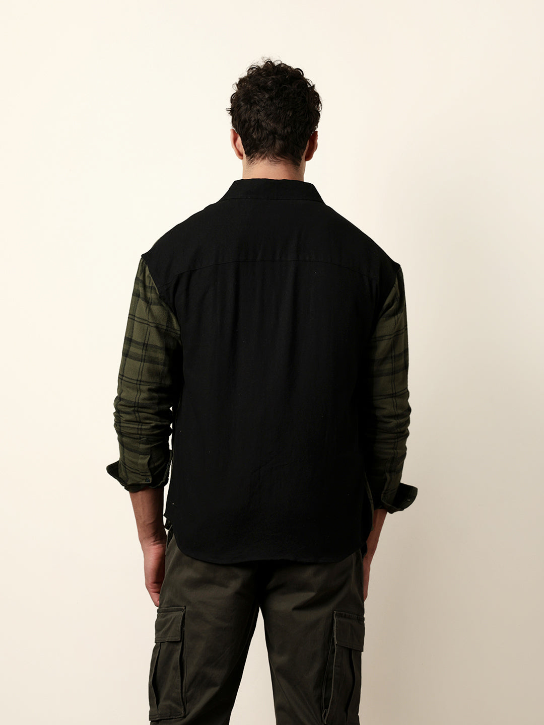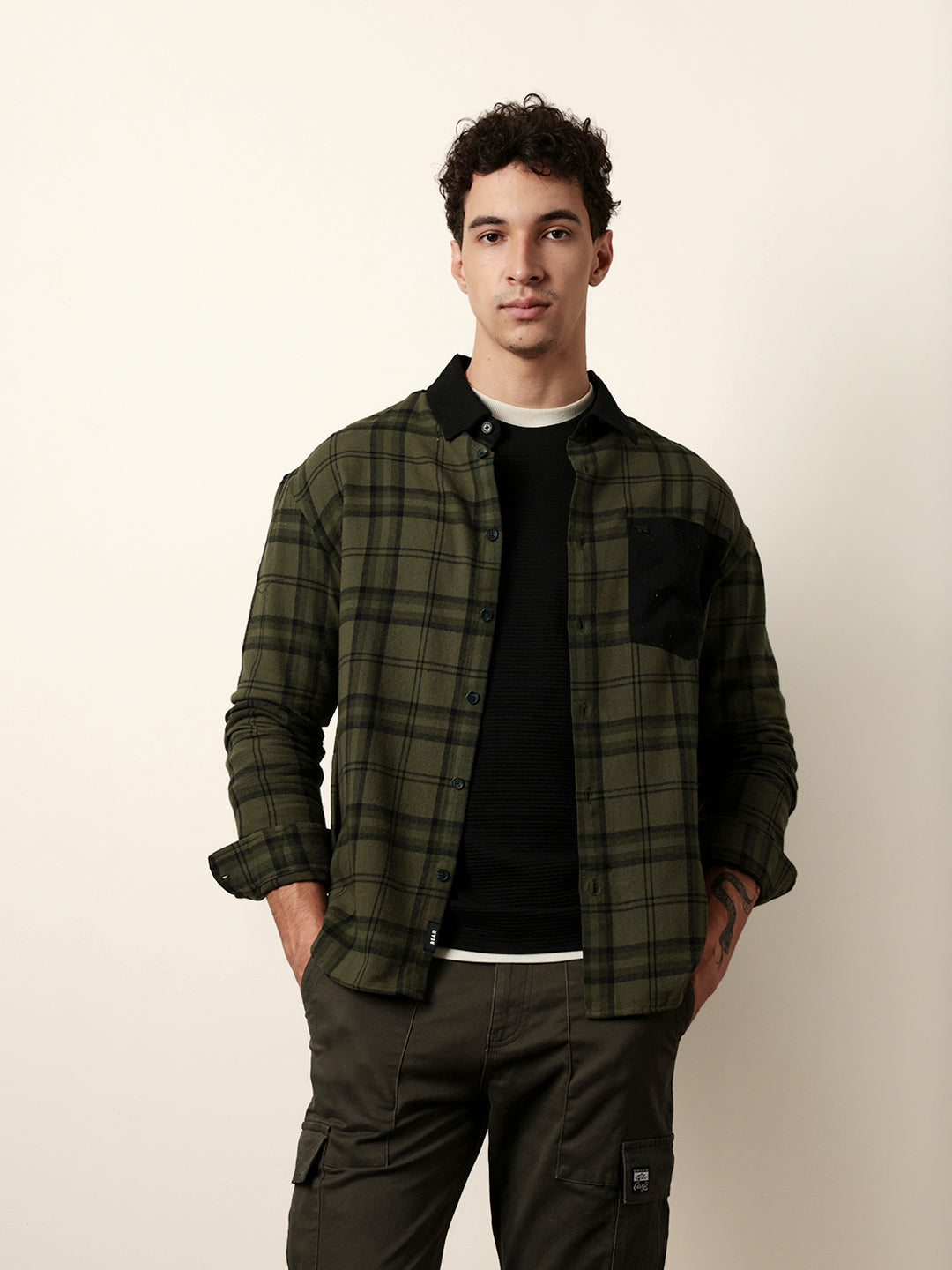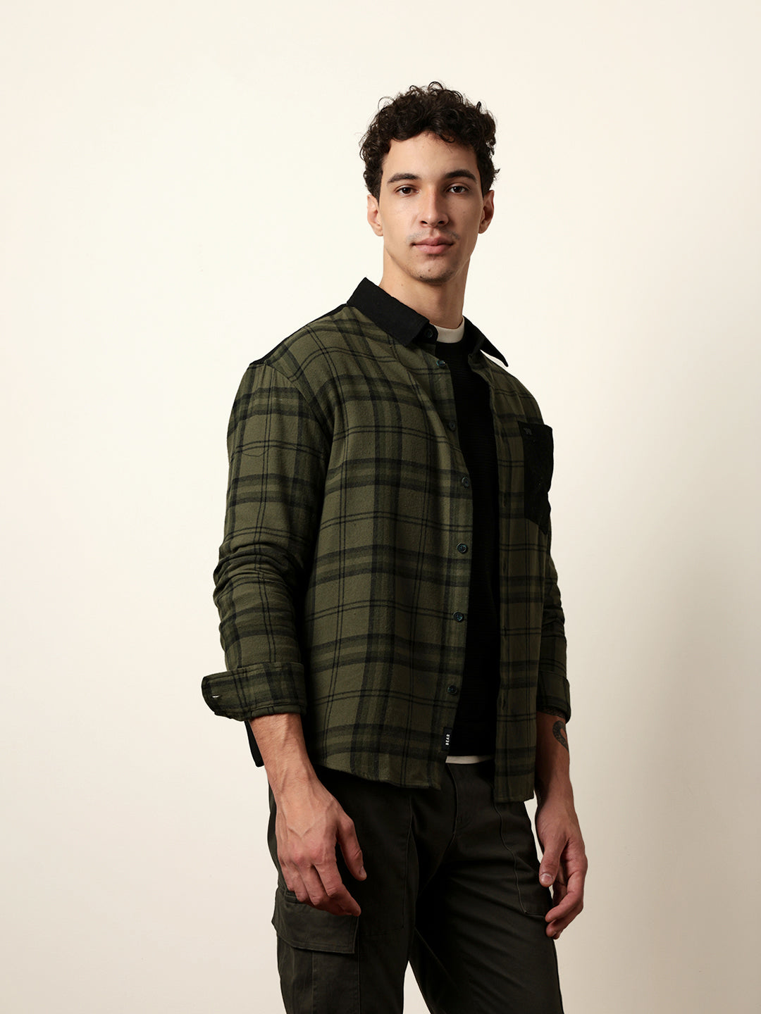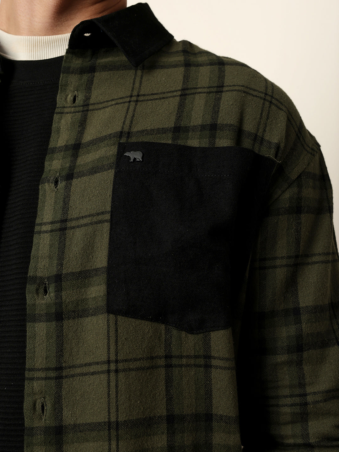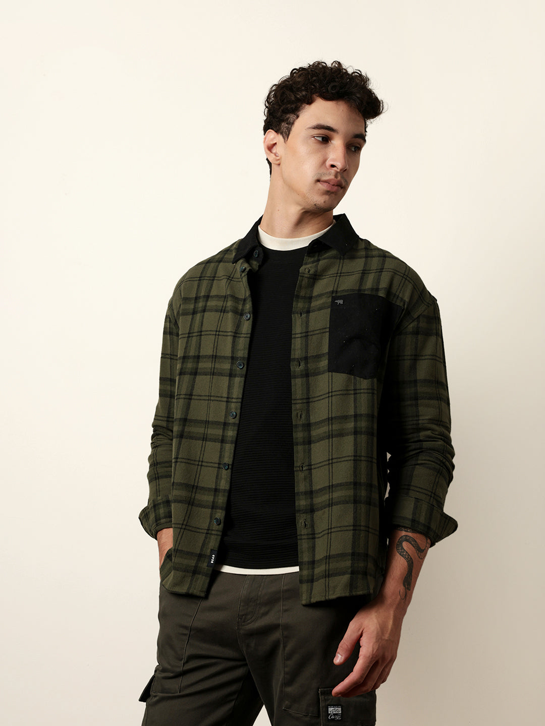 Olive Checked Relaxed Fit Overshirt with Solid Back