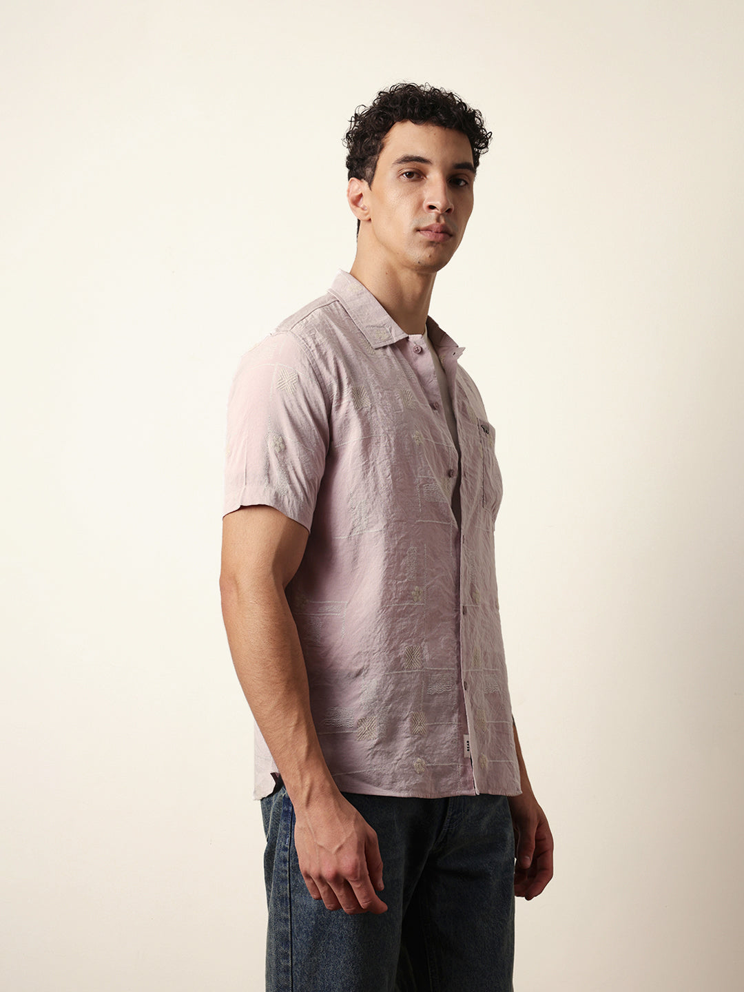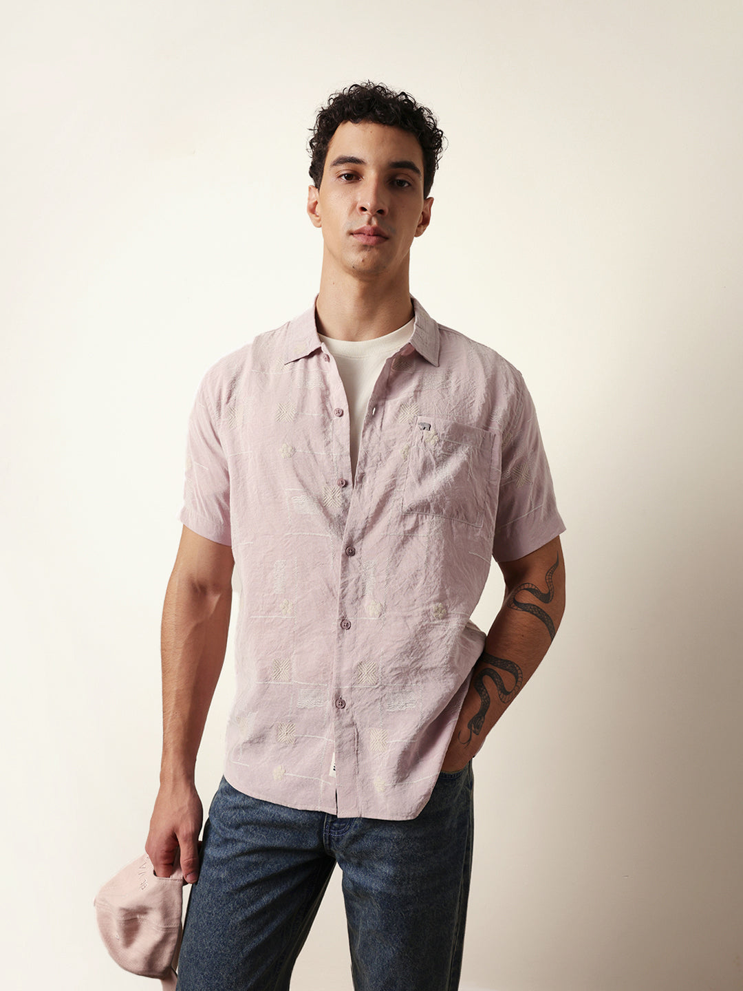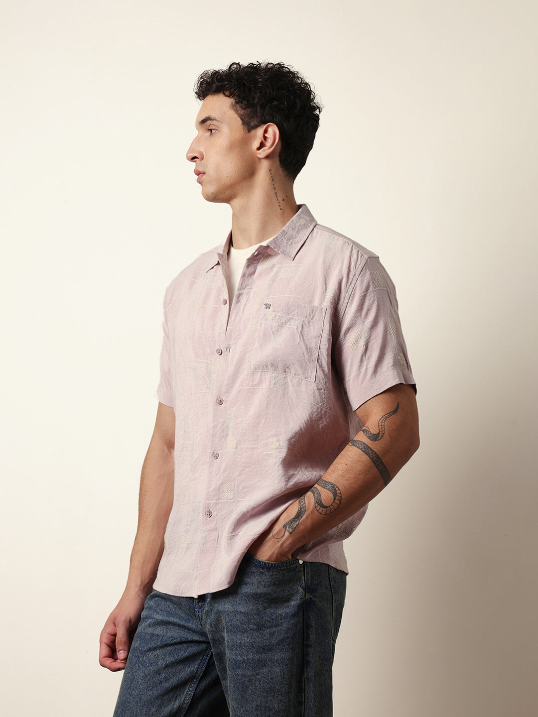 Pink Embroidered Motif Regular Fit Casual Shirt