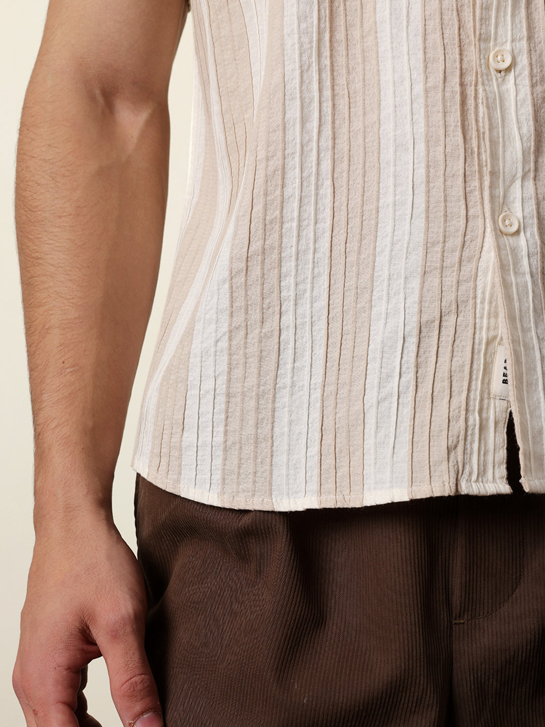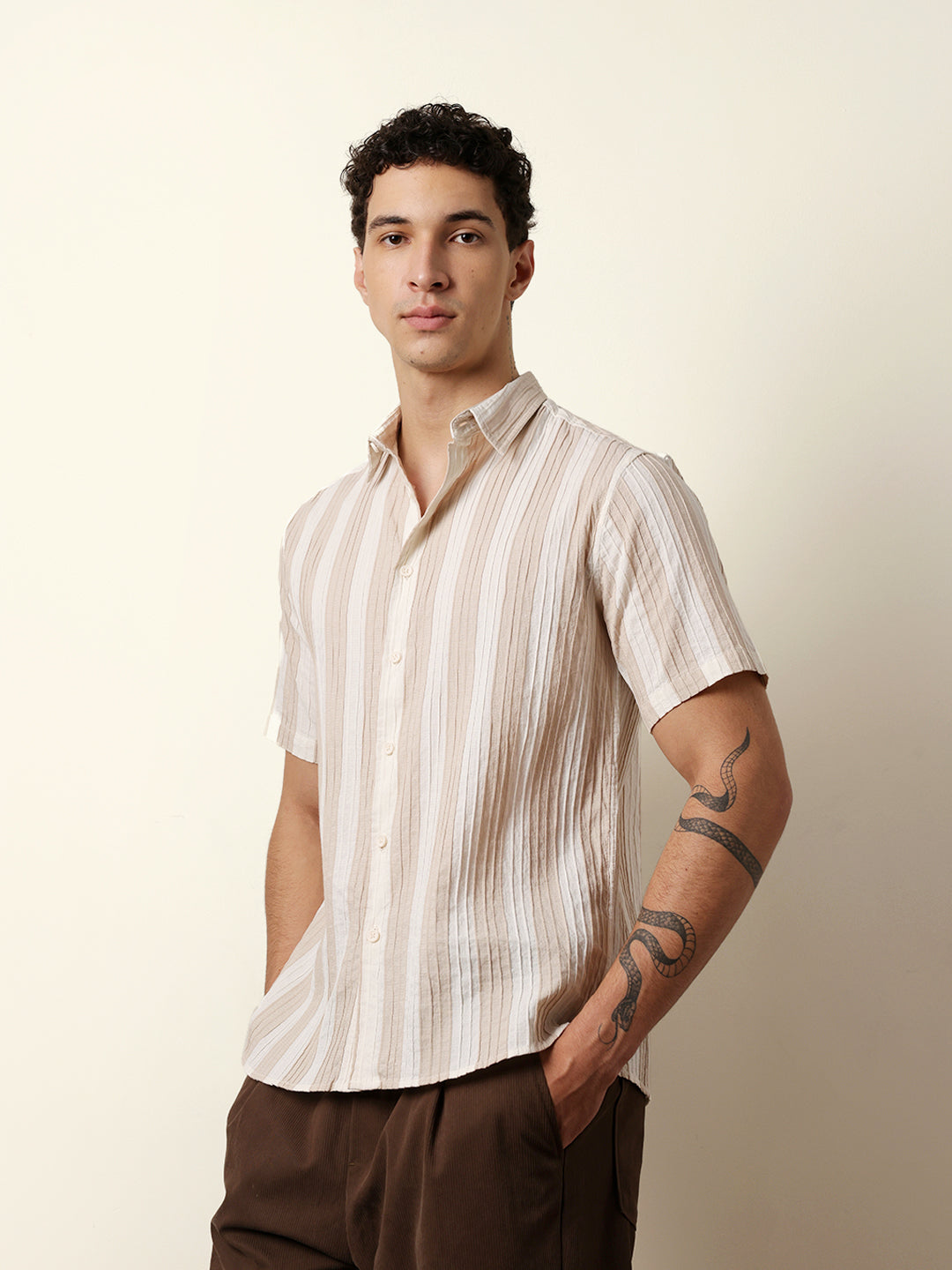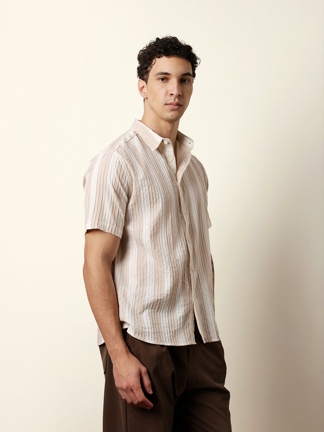 Beige & Cream Vertical Striped Regular Fit Half Sleeve Shirt