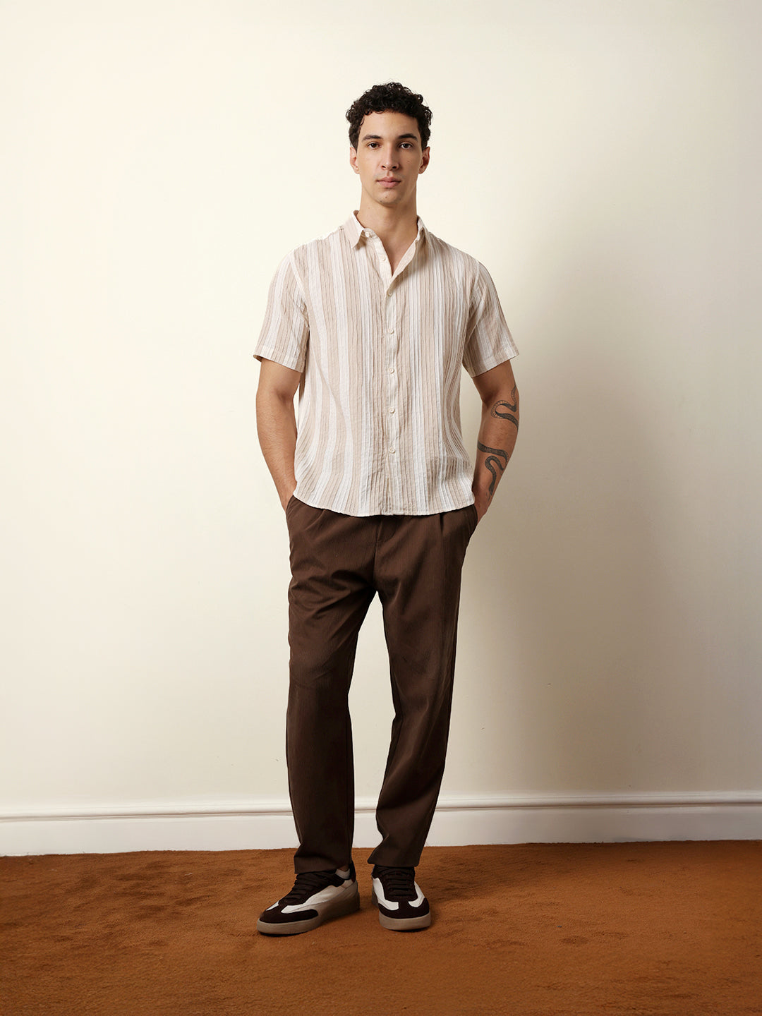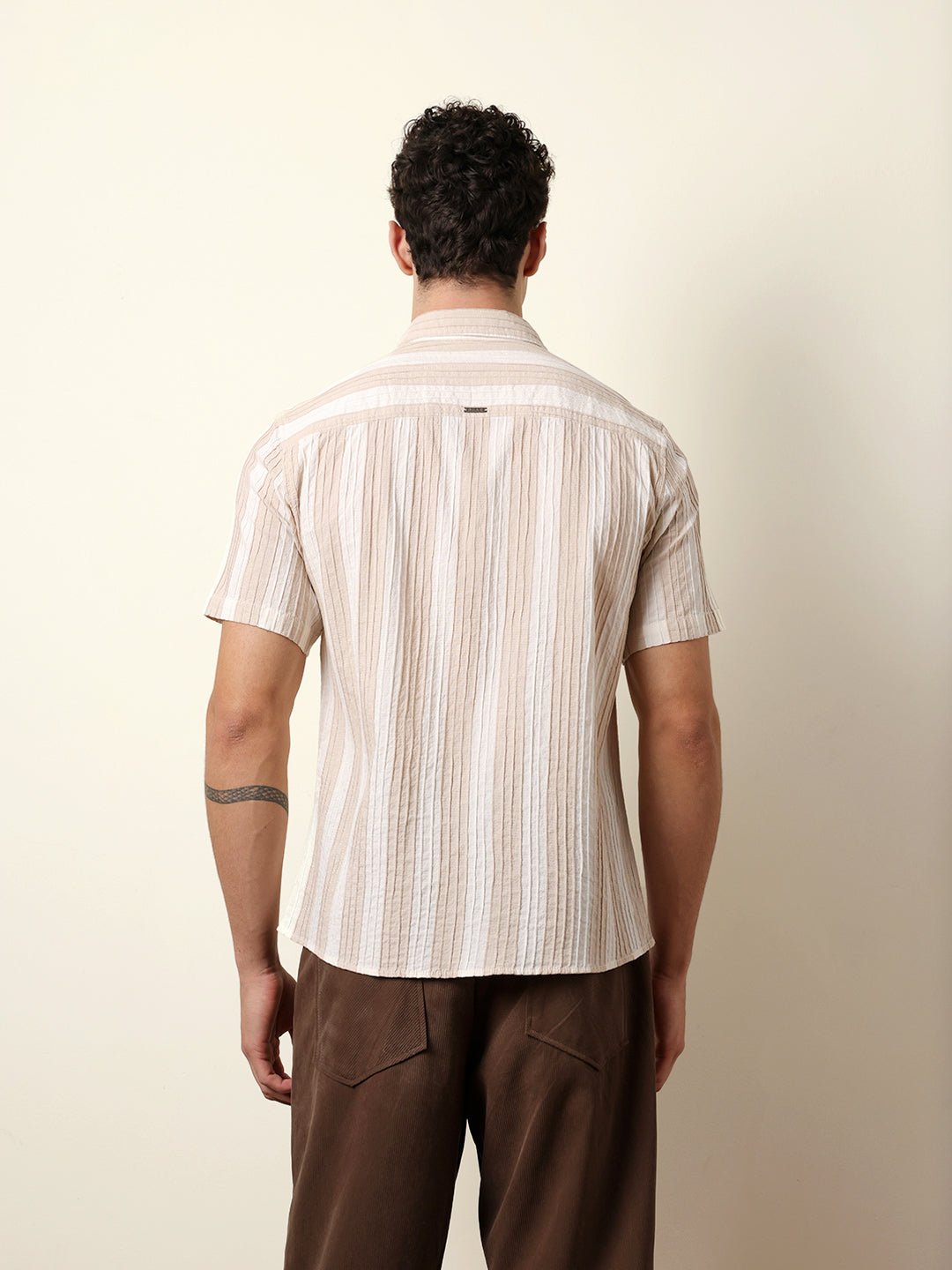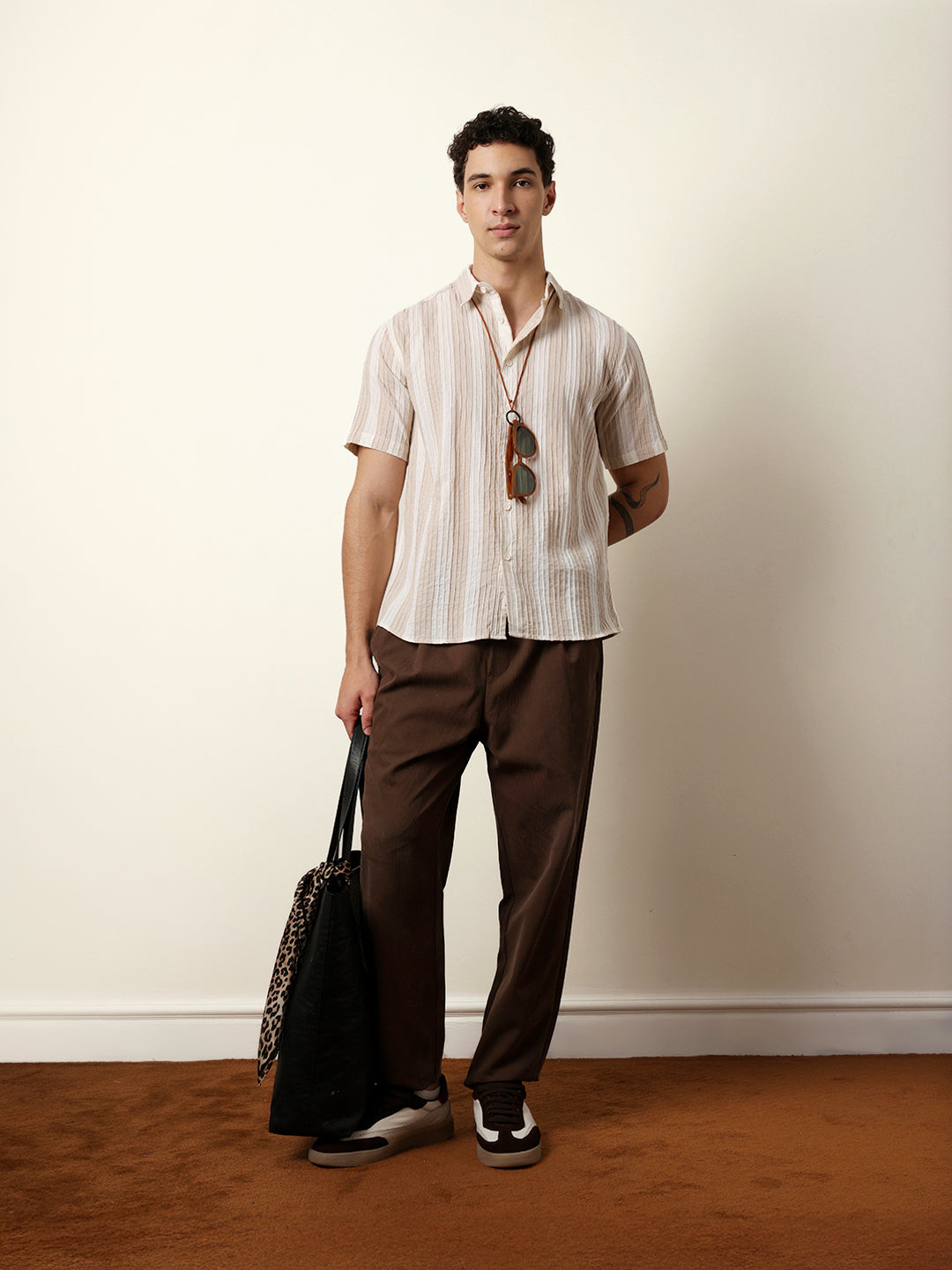 Beige & Cream Vertical Striped Regular Fit Half Sleeve Shirt