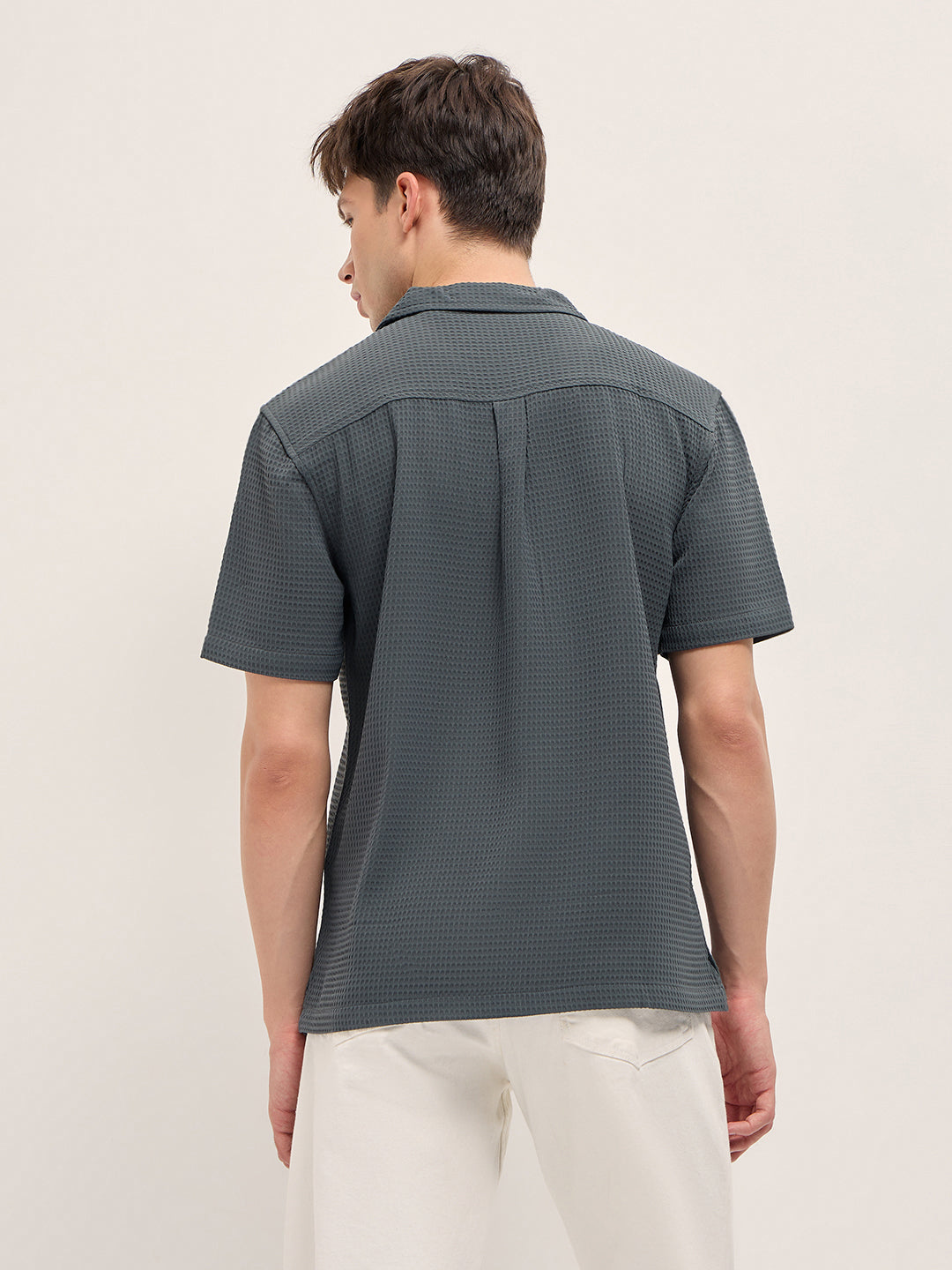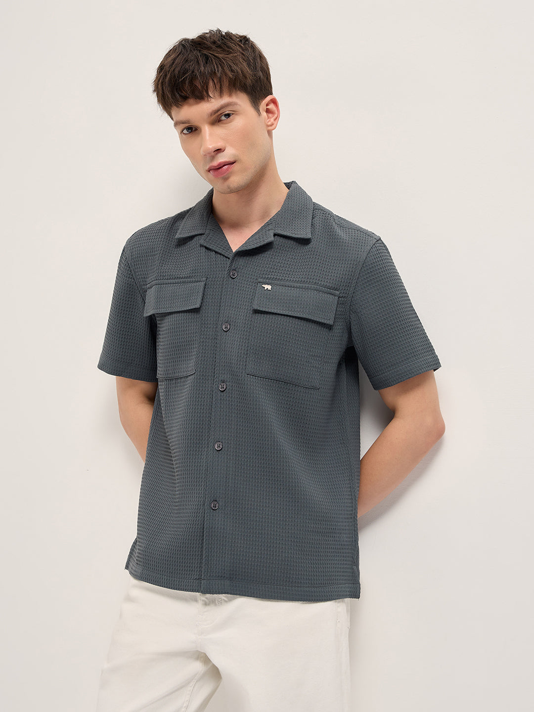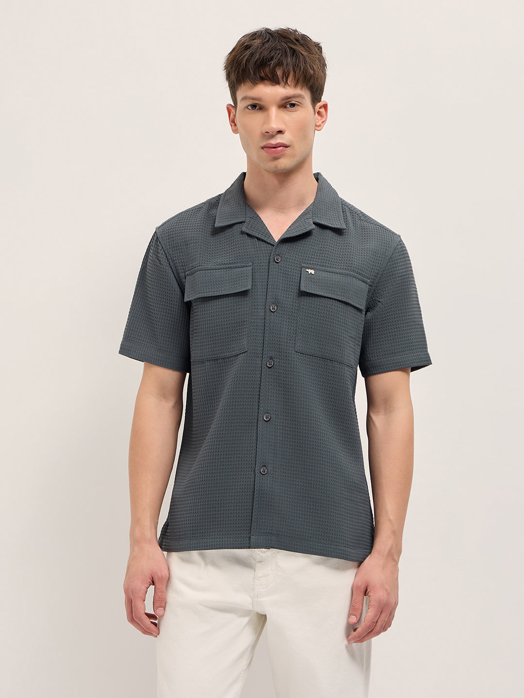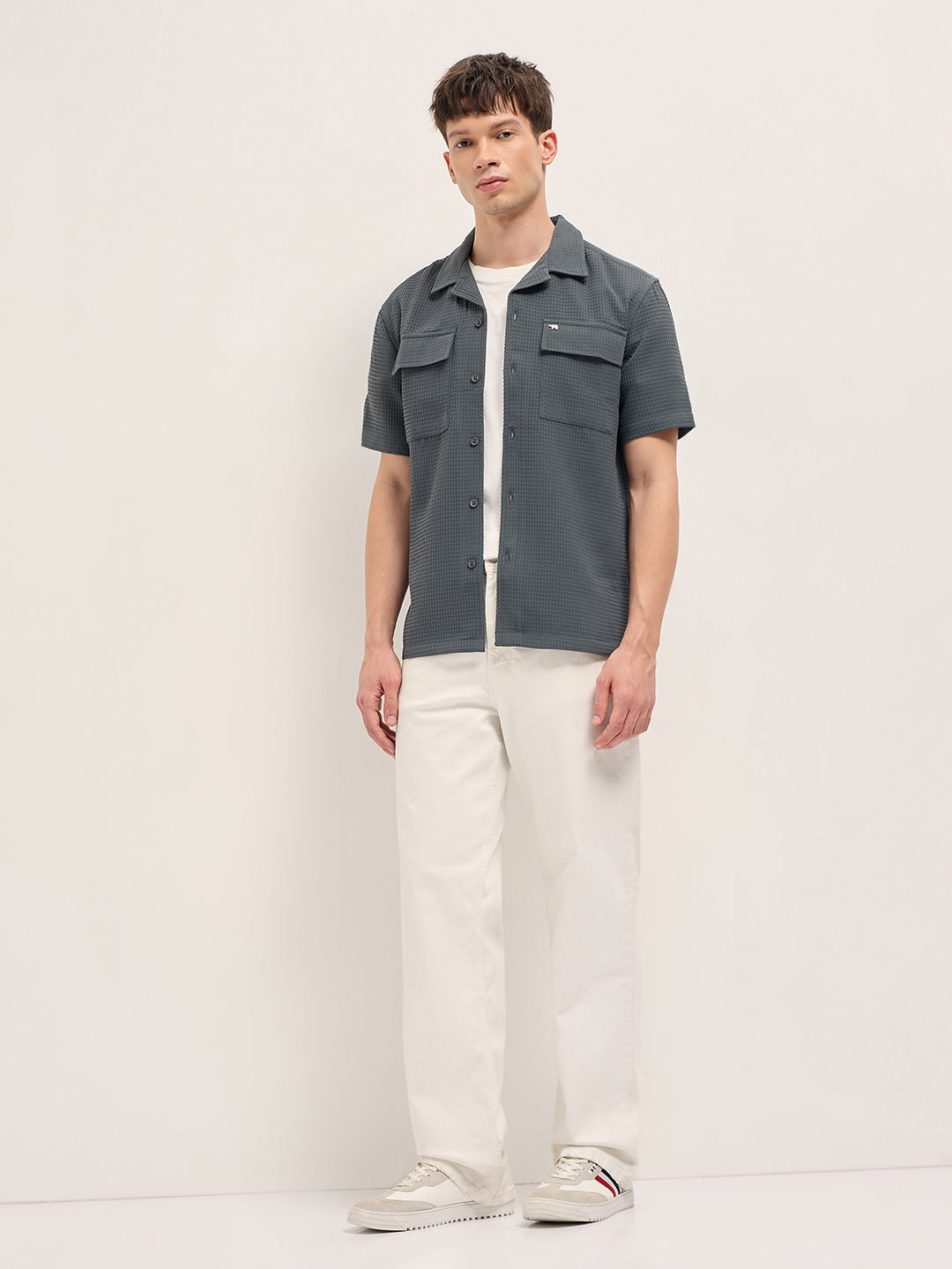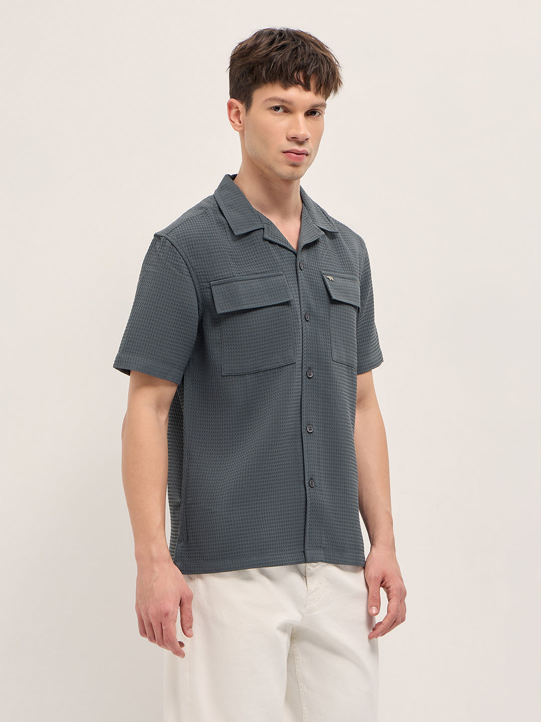 Shop Grey Textured Woven Relaxed Fit Casual Shirt with Flap Pockets Online.
