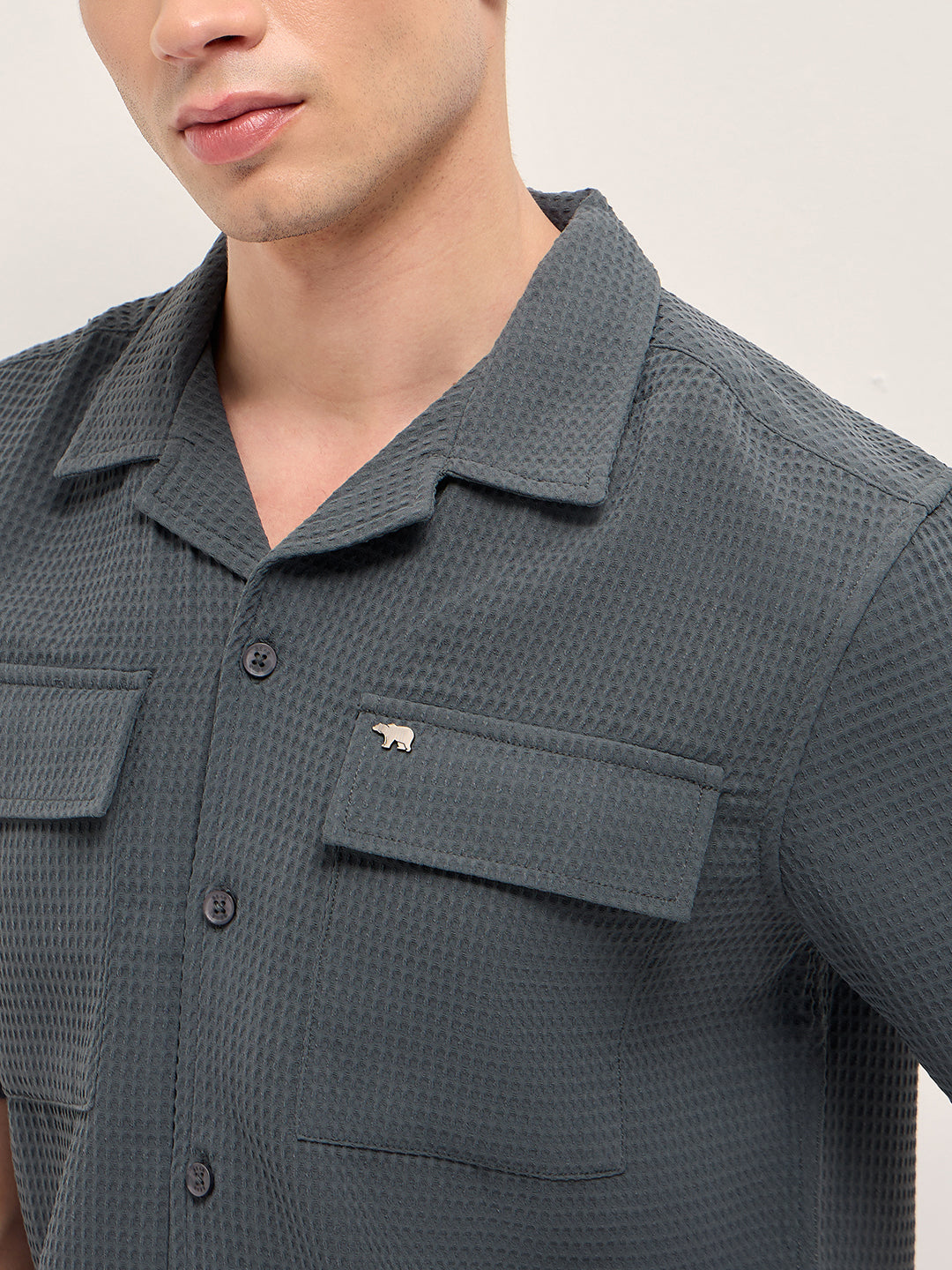 Grey Textured Woven Relaxed Fit Casual Shirt with Flap Pockets