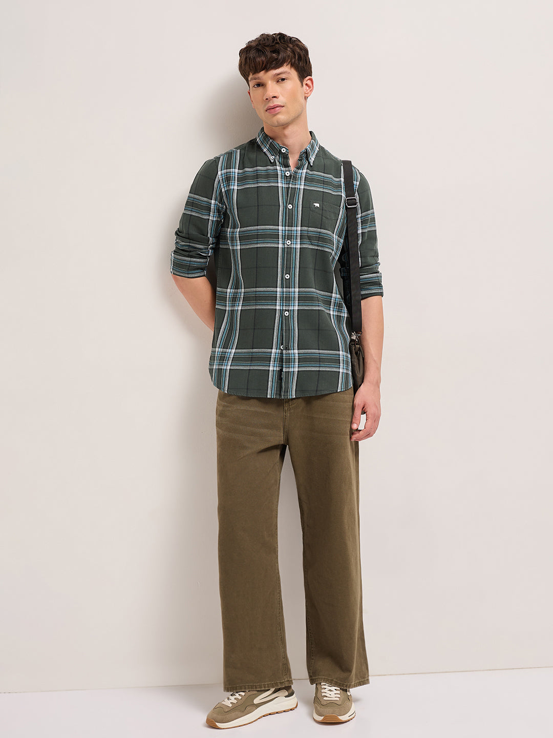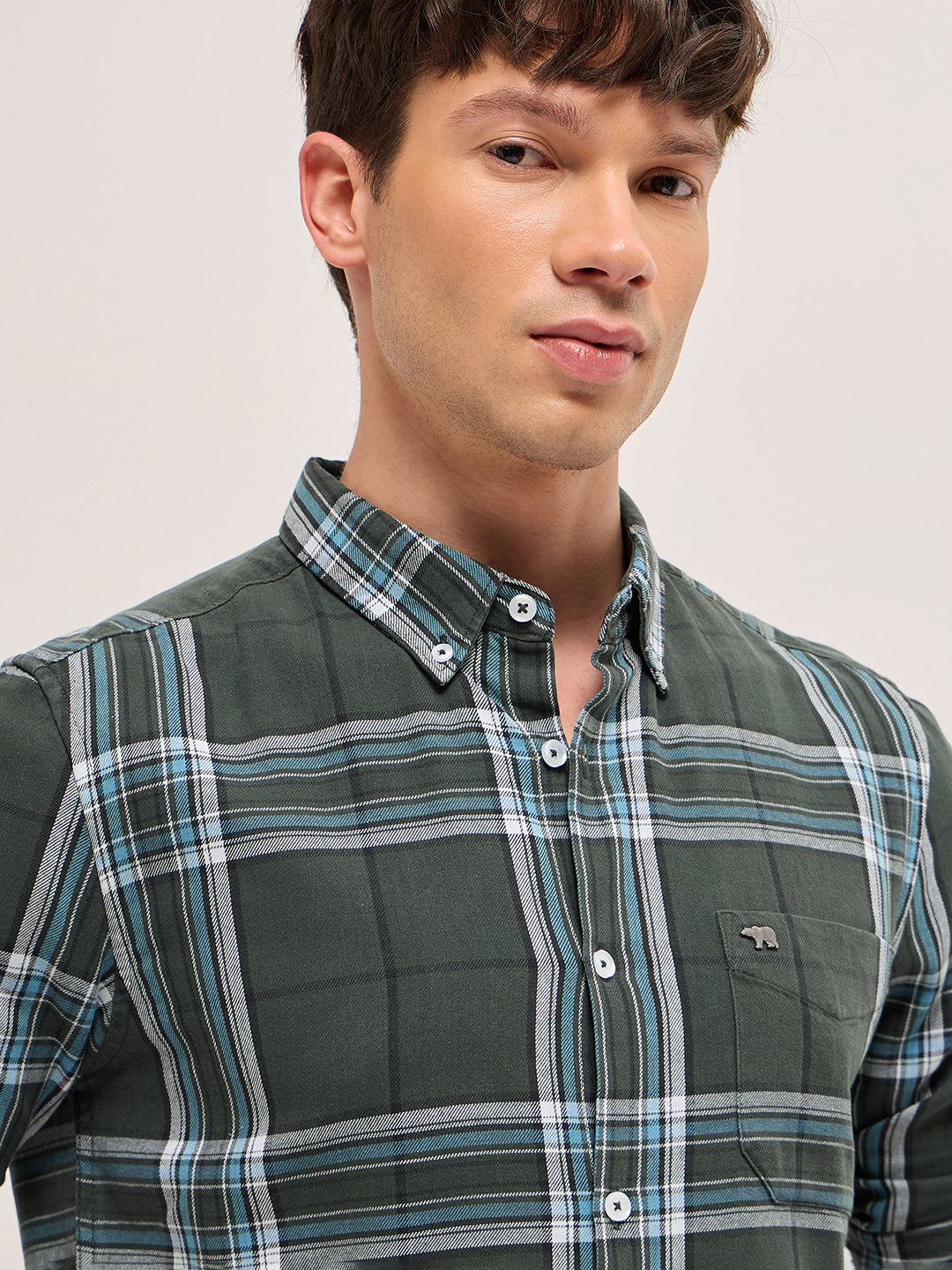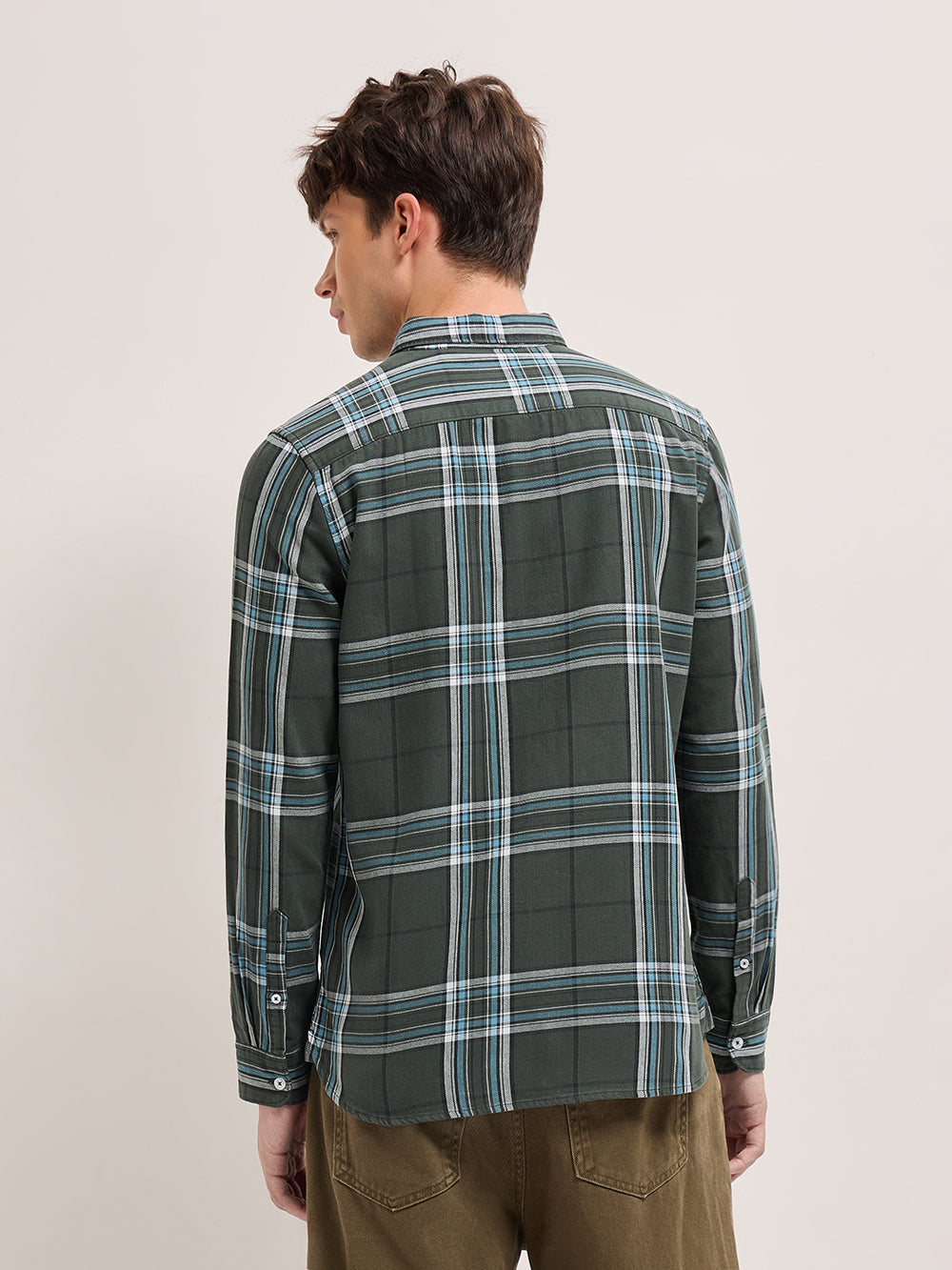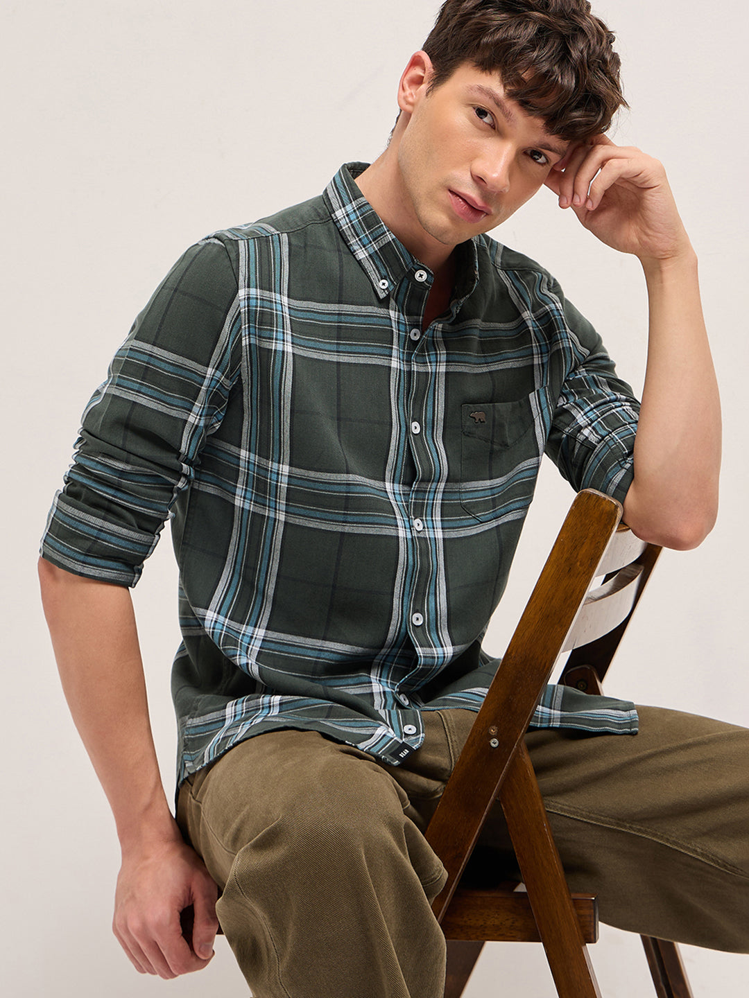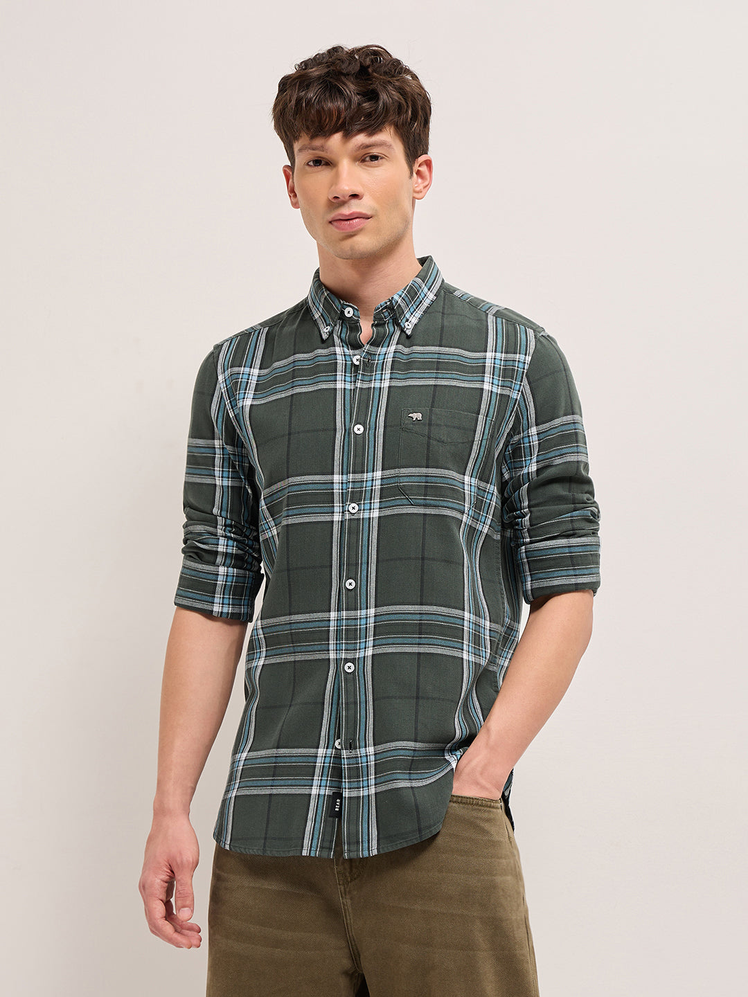 Olive Woven Check Slim Fit Casual Shirt with Button-Down Collar