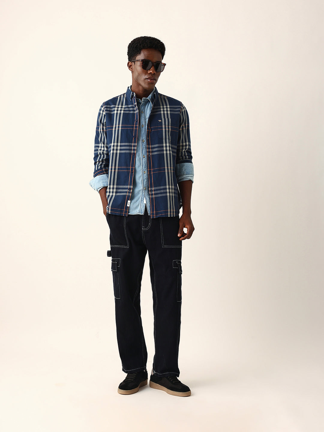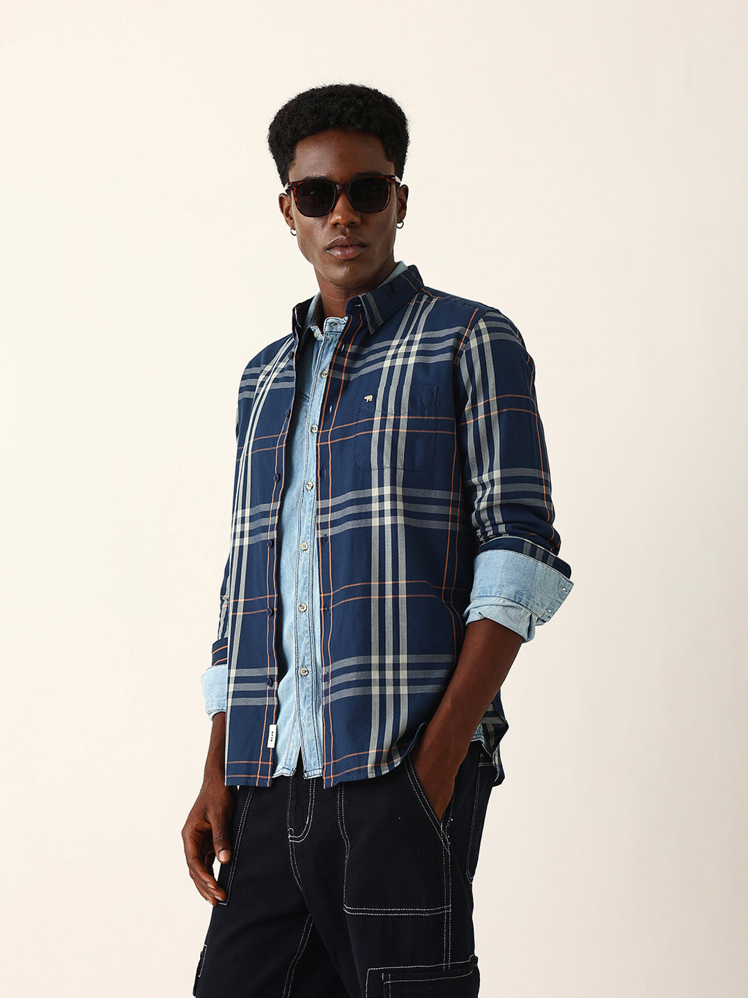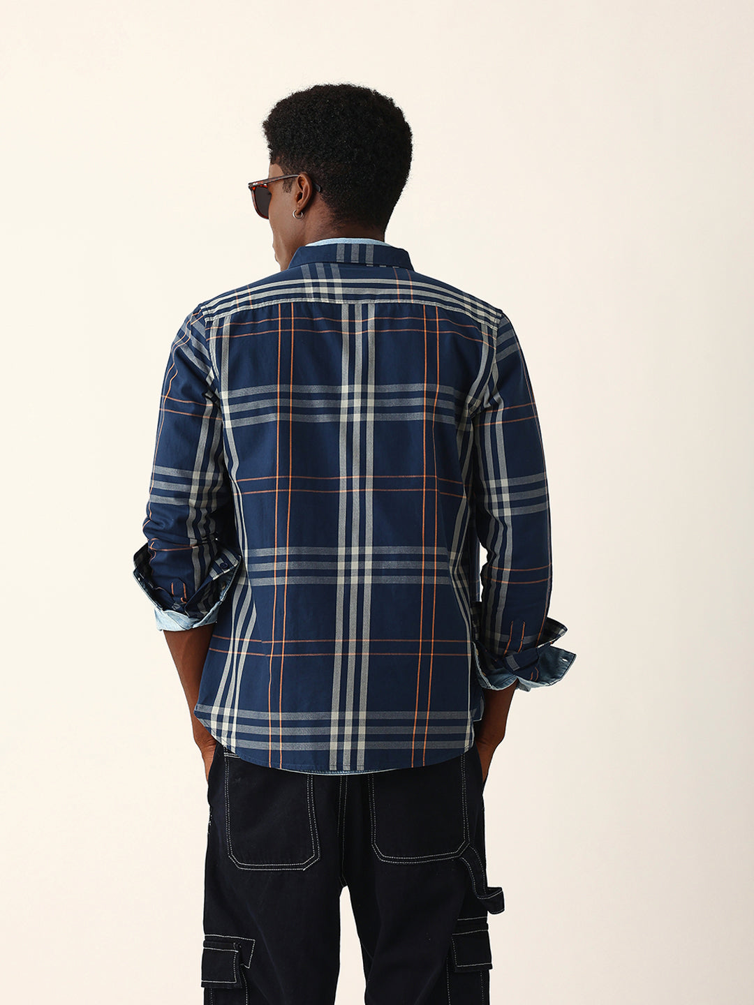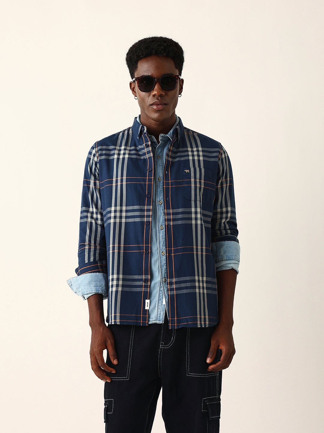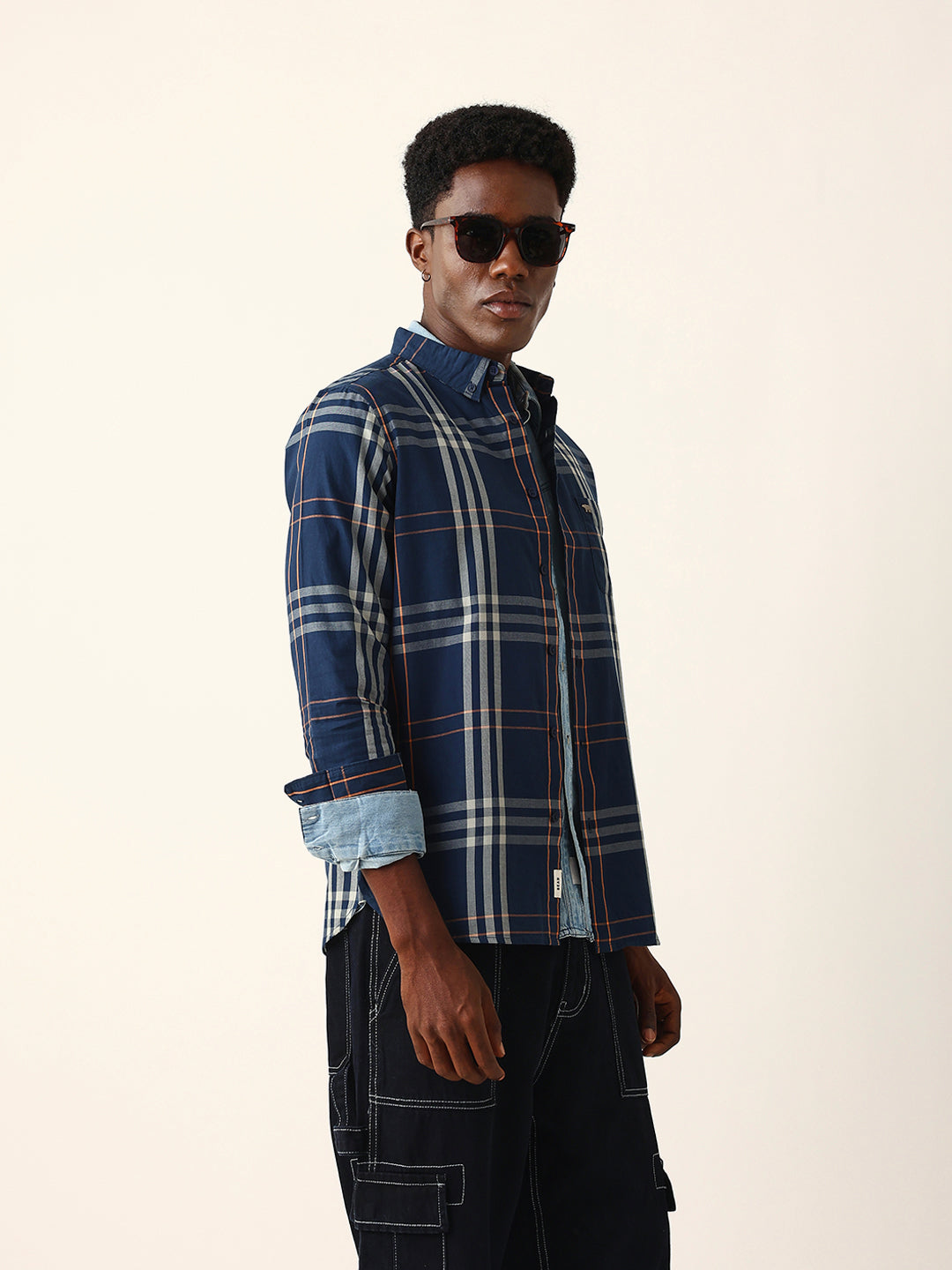 Shop Blue & Beige Windowpane Checked Slim Fit Woven Casual Shirt Online.