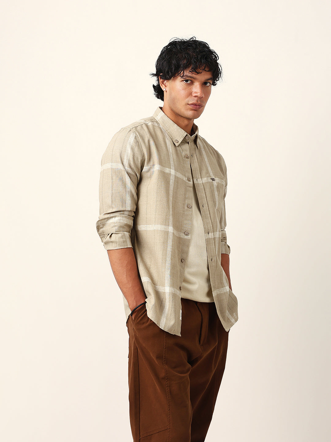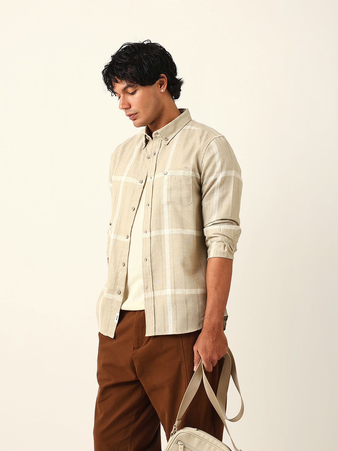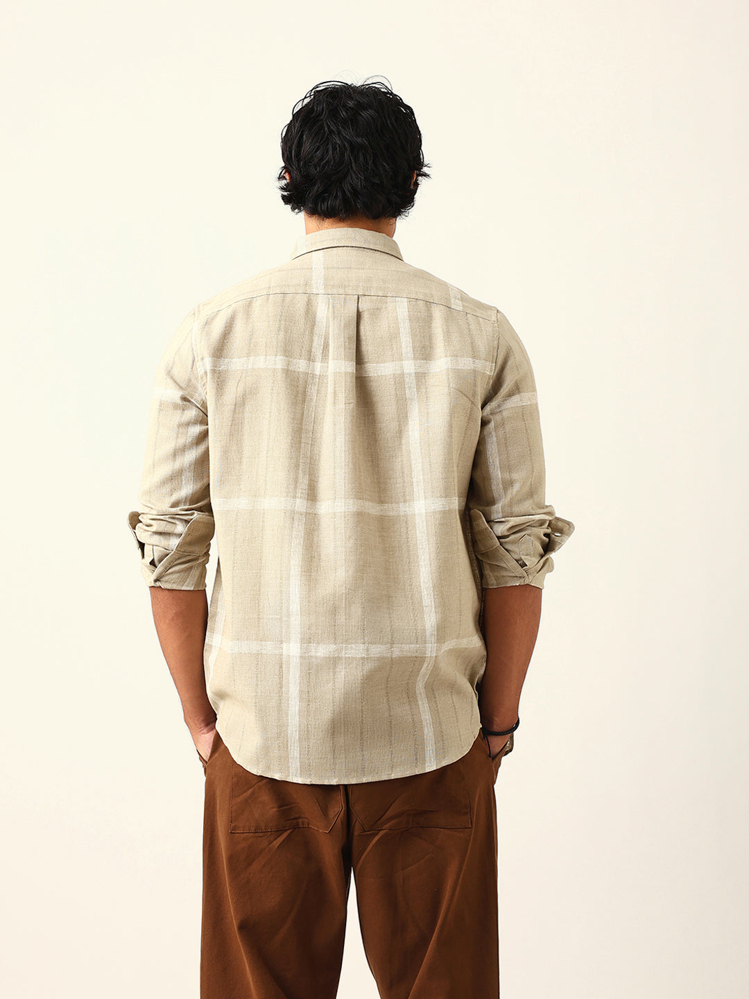 Shop Beige & White Woven Checked Slim Fit Casual Shirt with Button-Down Collar Online.