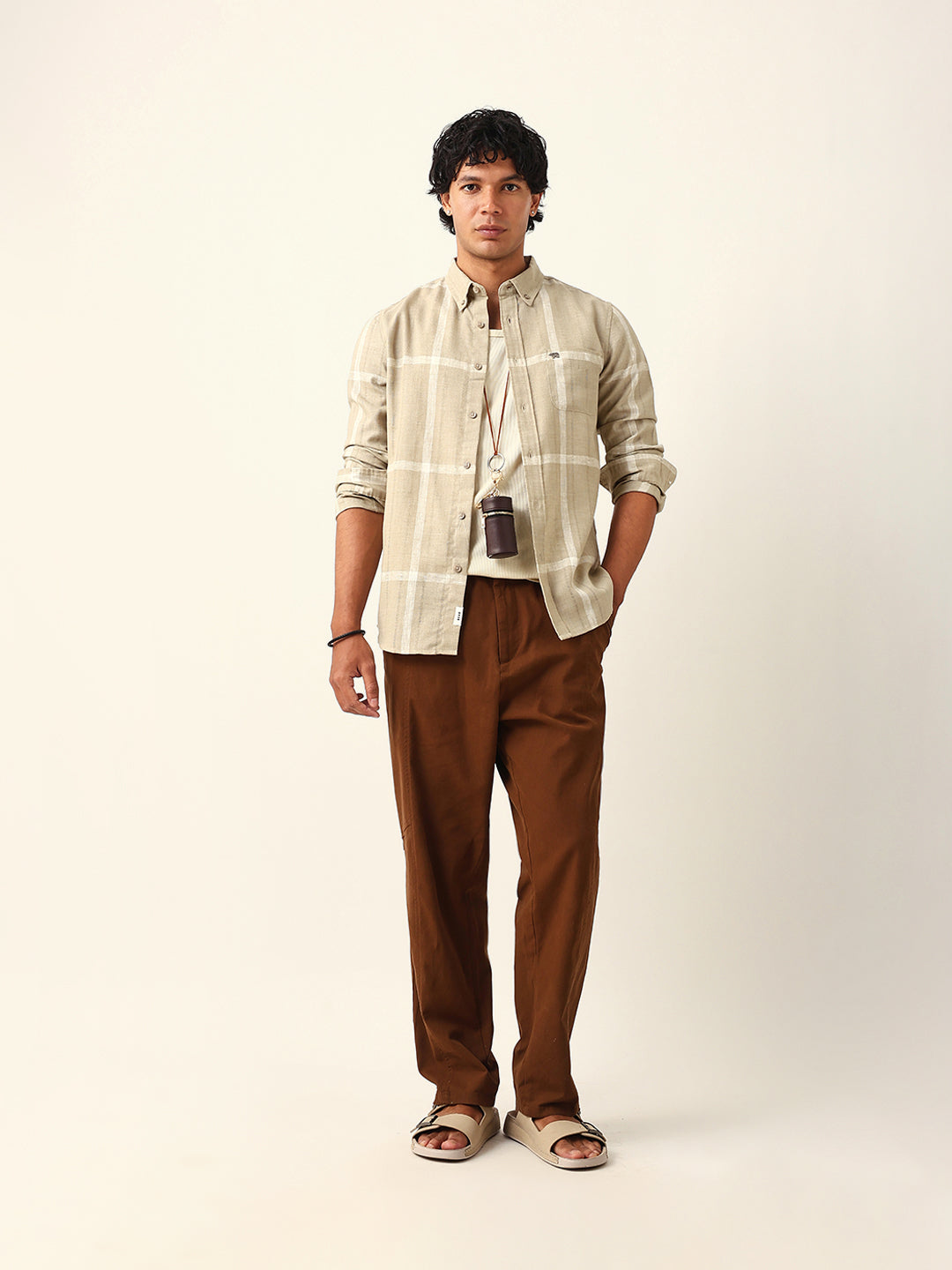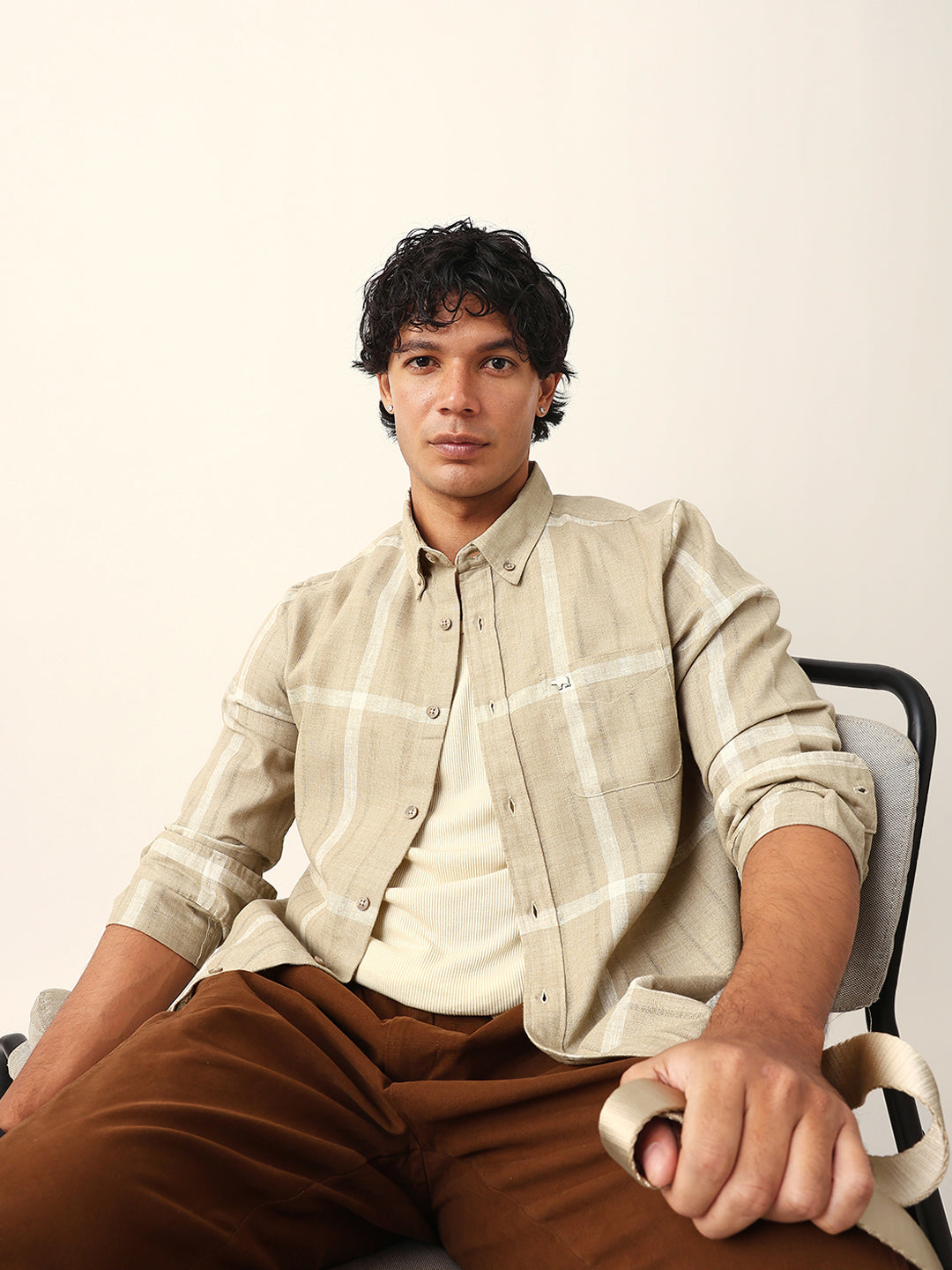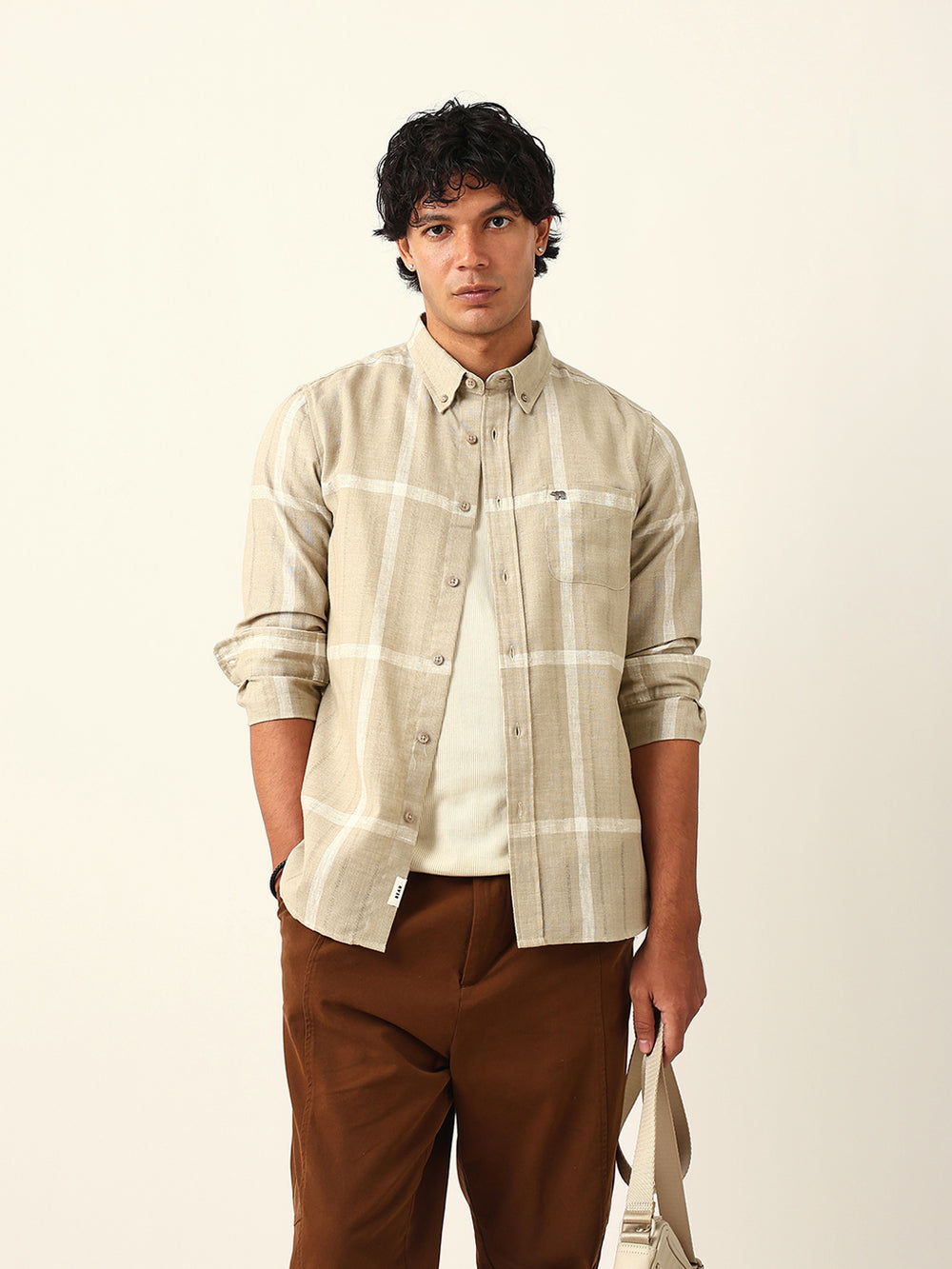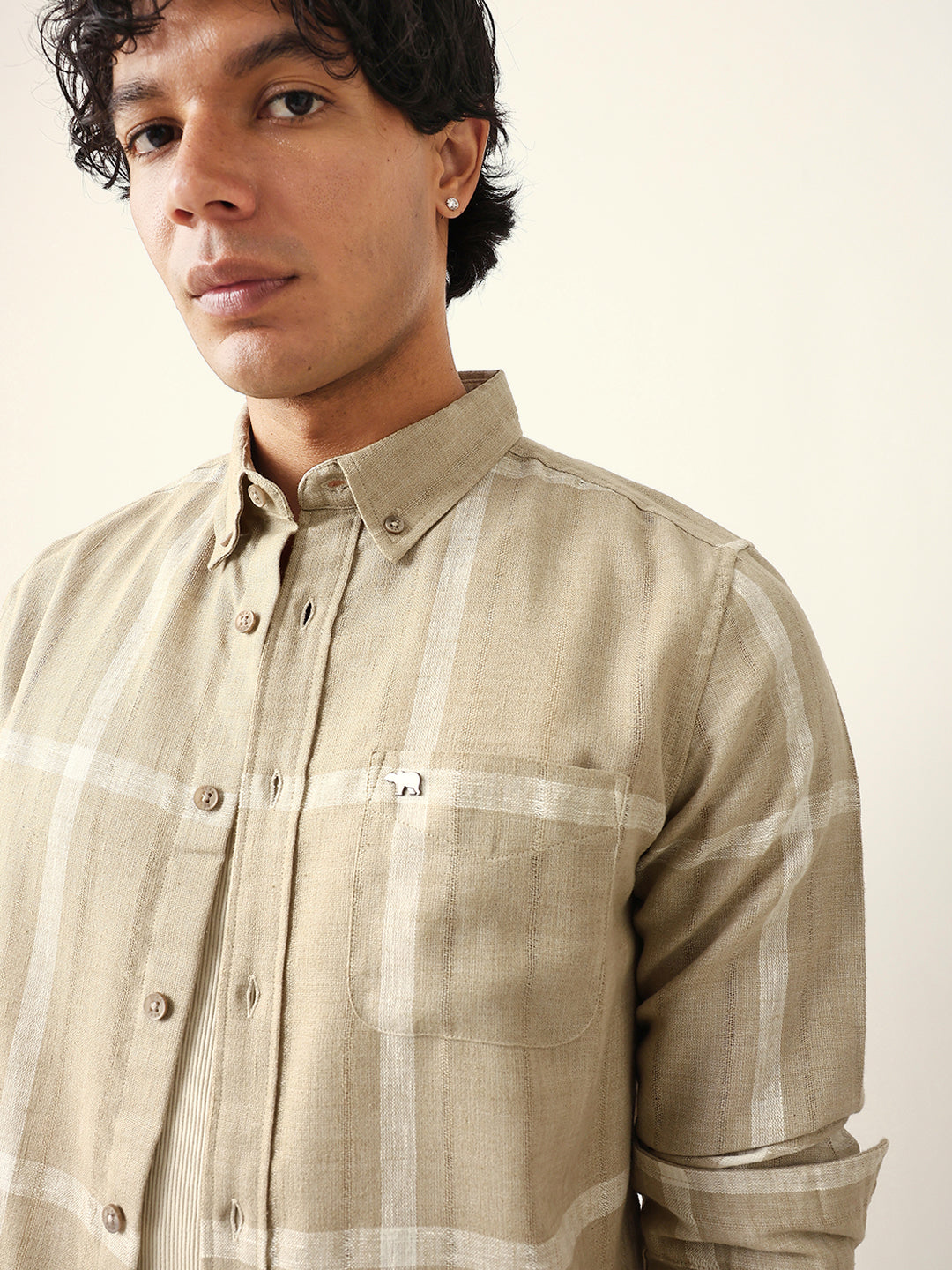 Shop Beige & White Woven Checked Slim Fit Casual Shirt with Button-Down Collar Online.