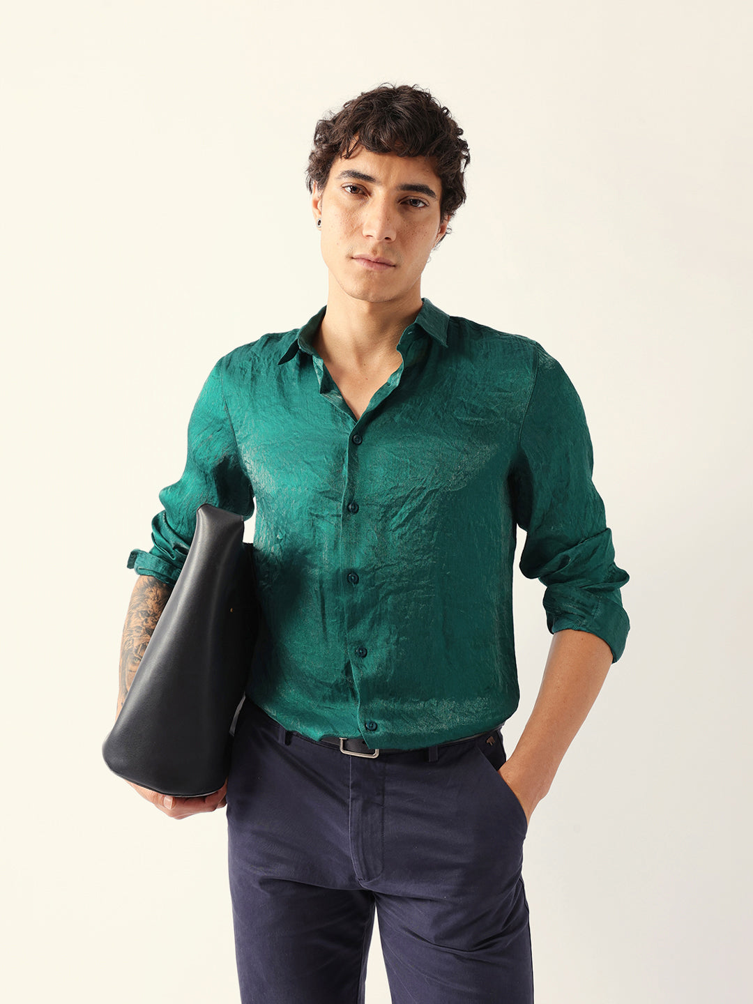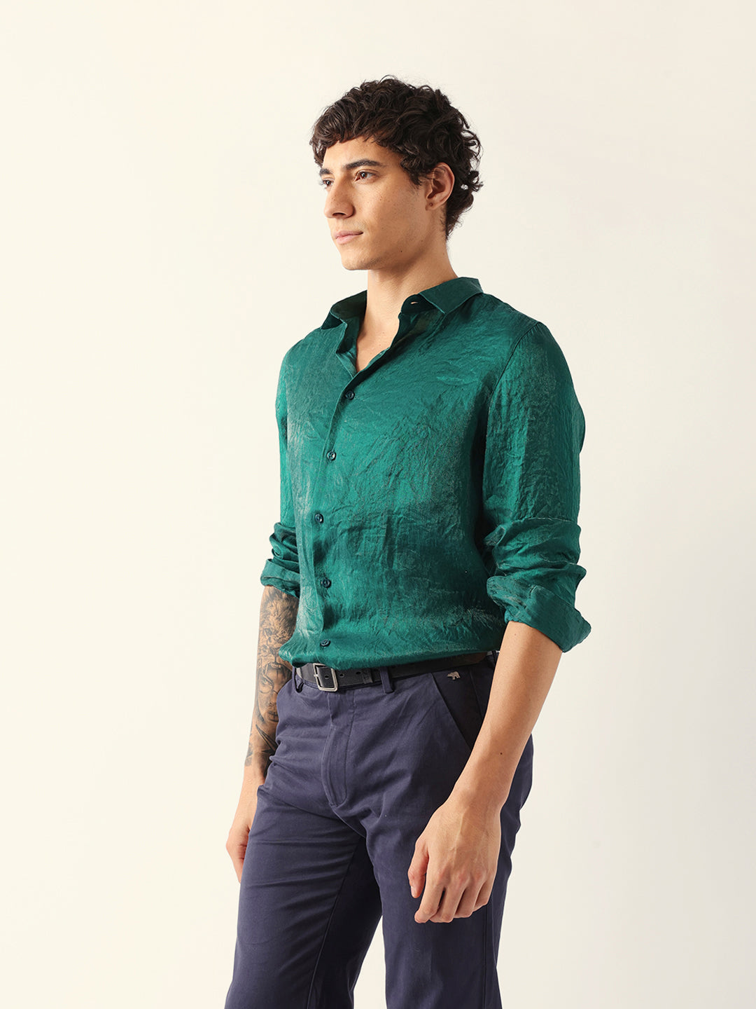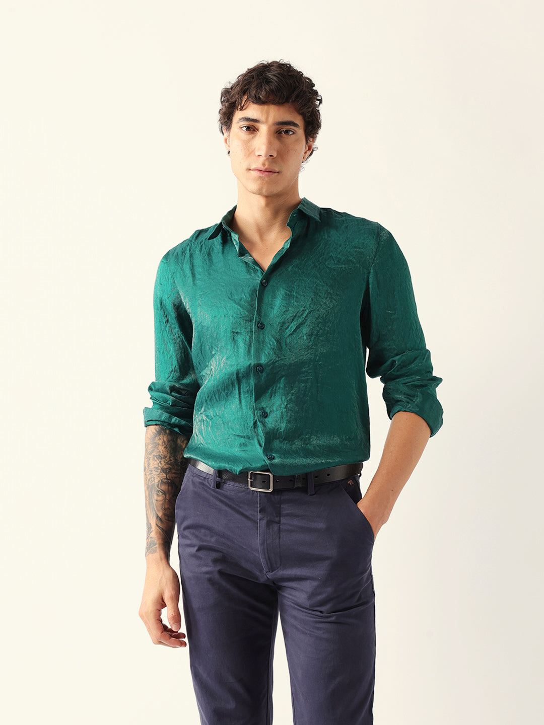 Green Regular Fit Casual Shirt with Crinkle Effect & Subtle Sheen Finish