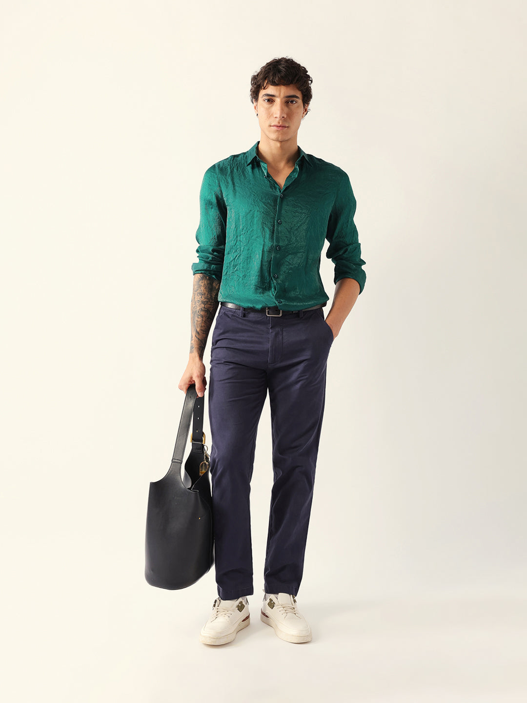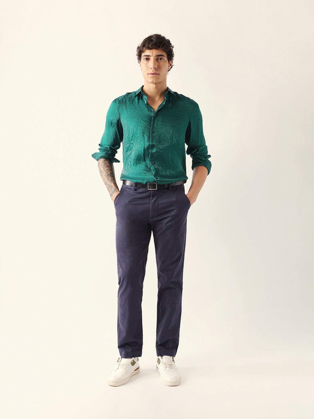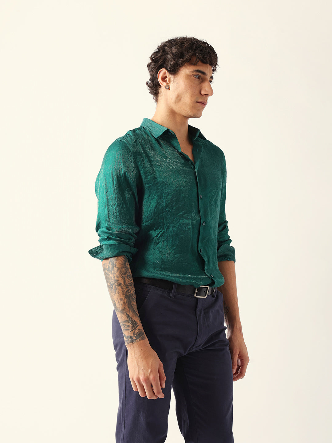 Green Regular Fit Casual Shirt with Crinkle Effect & Subtle Sheen Finish