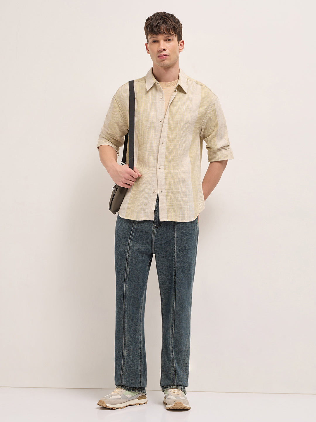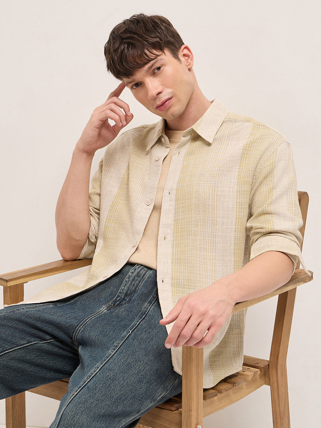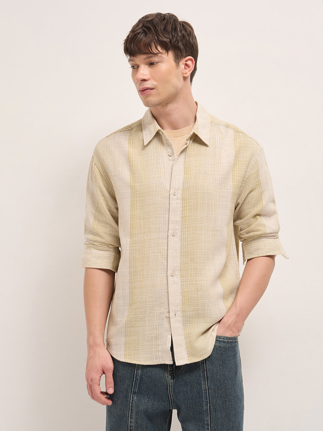Shop Green Relaxed Fit Overshirt with Woven Pinstripe Design Online.