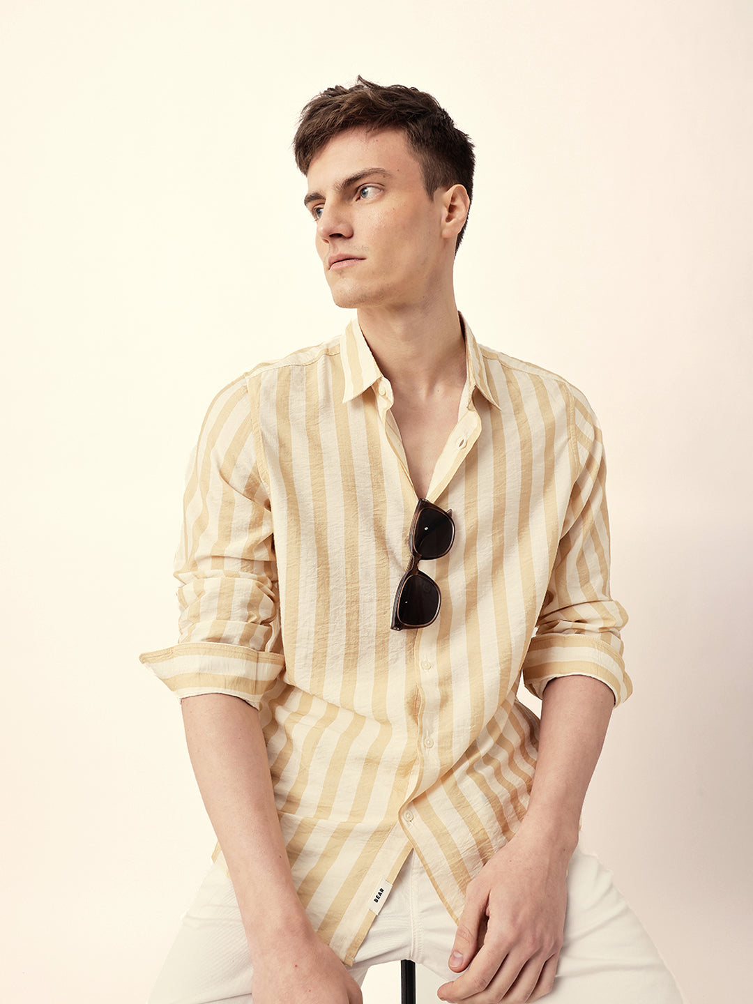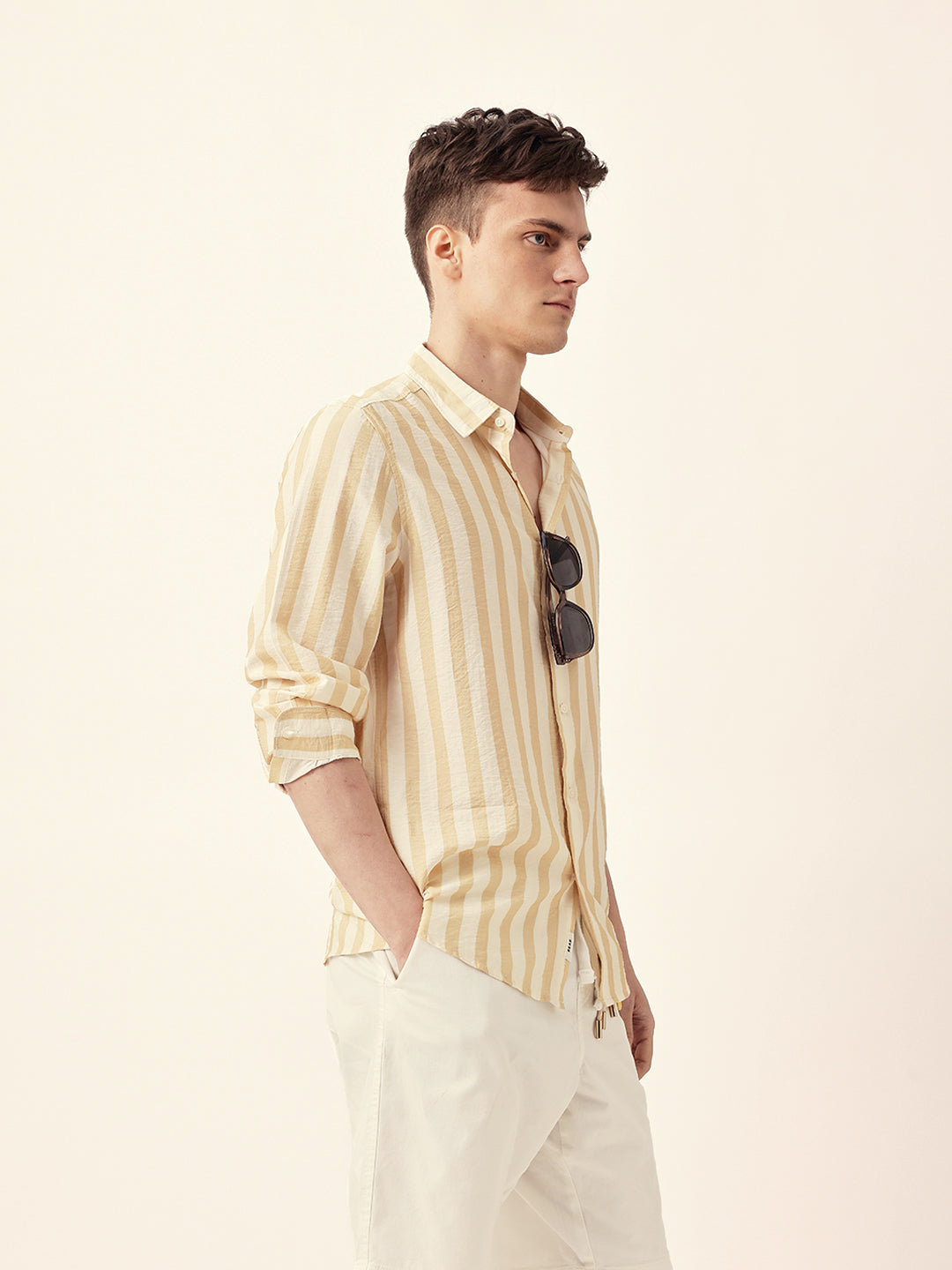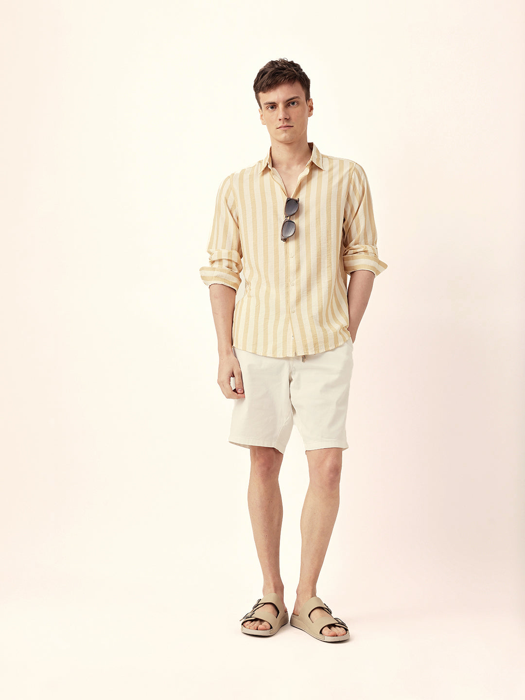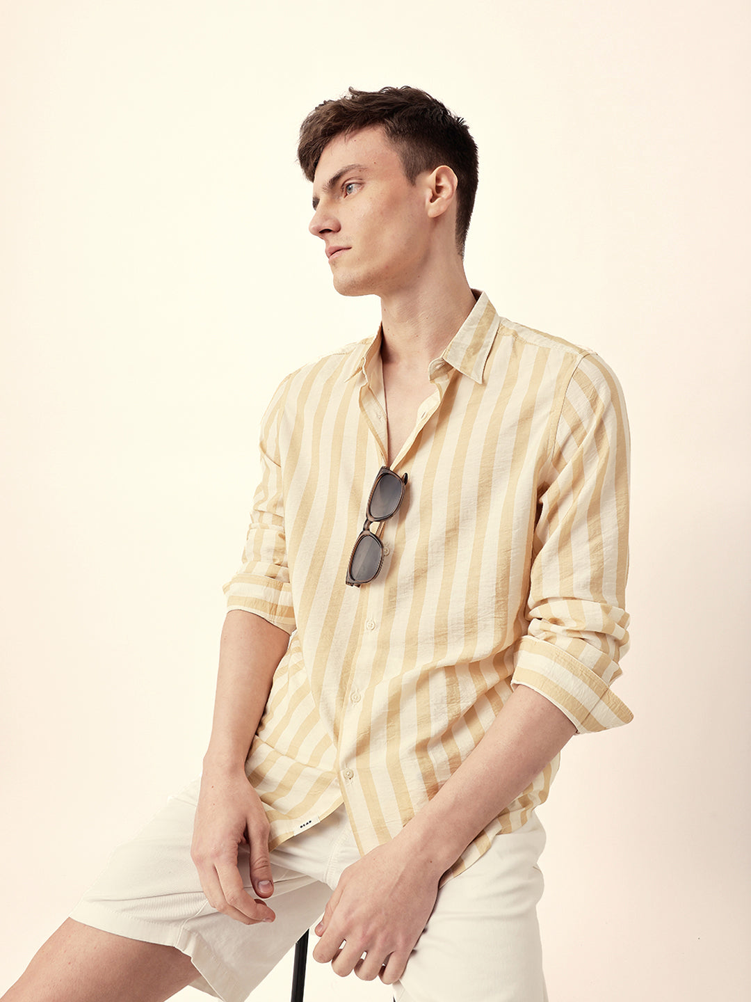 Shop Yellow & Off-White Vertical Stripe Regular Fit Casual Shirt Online.
