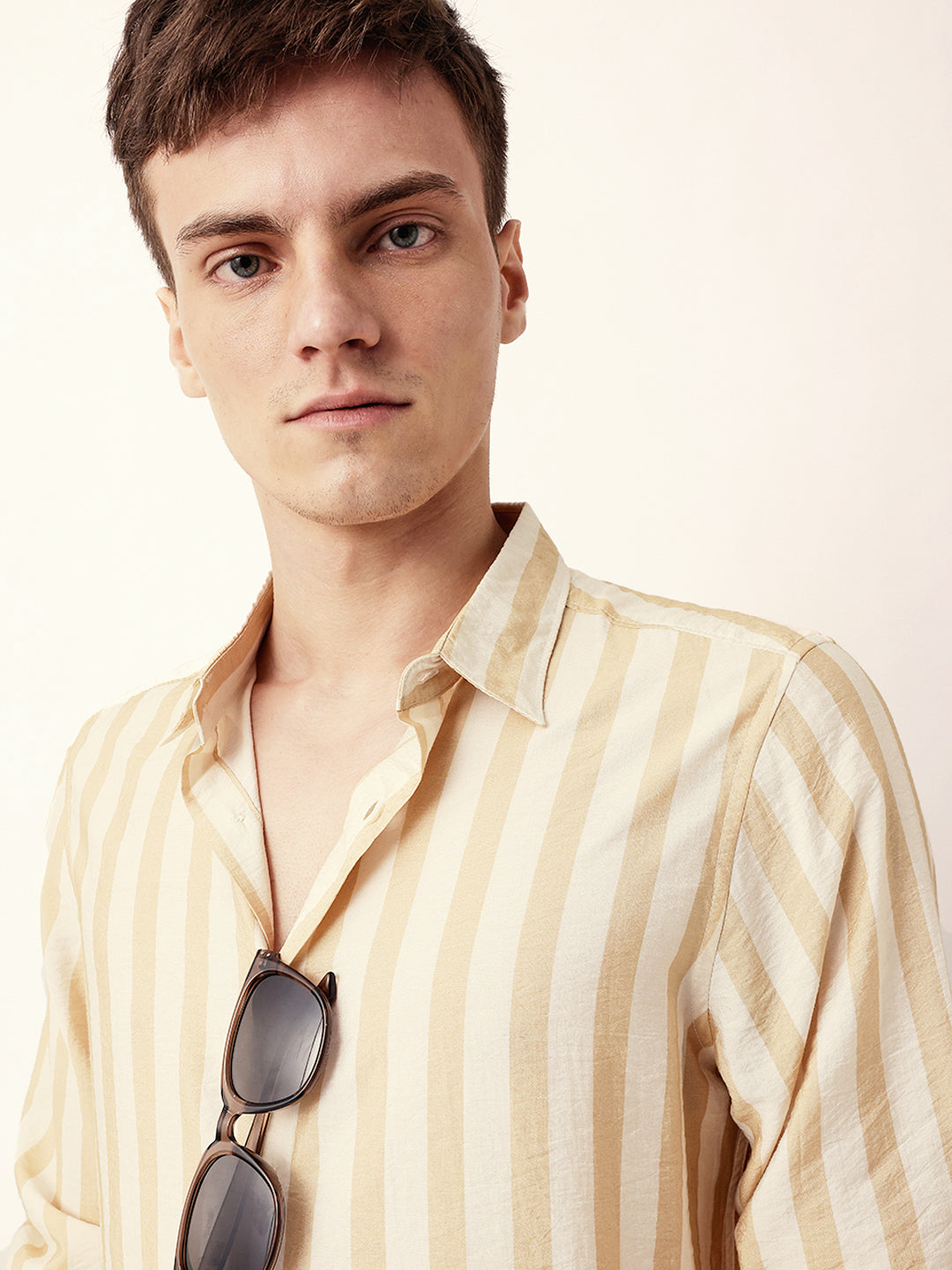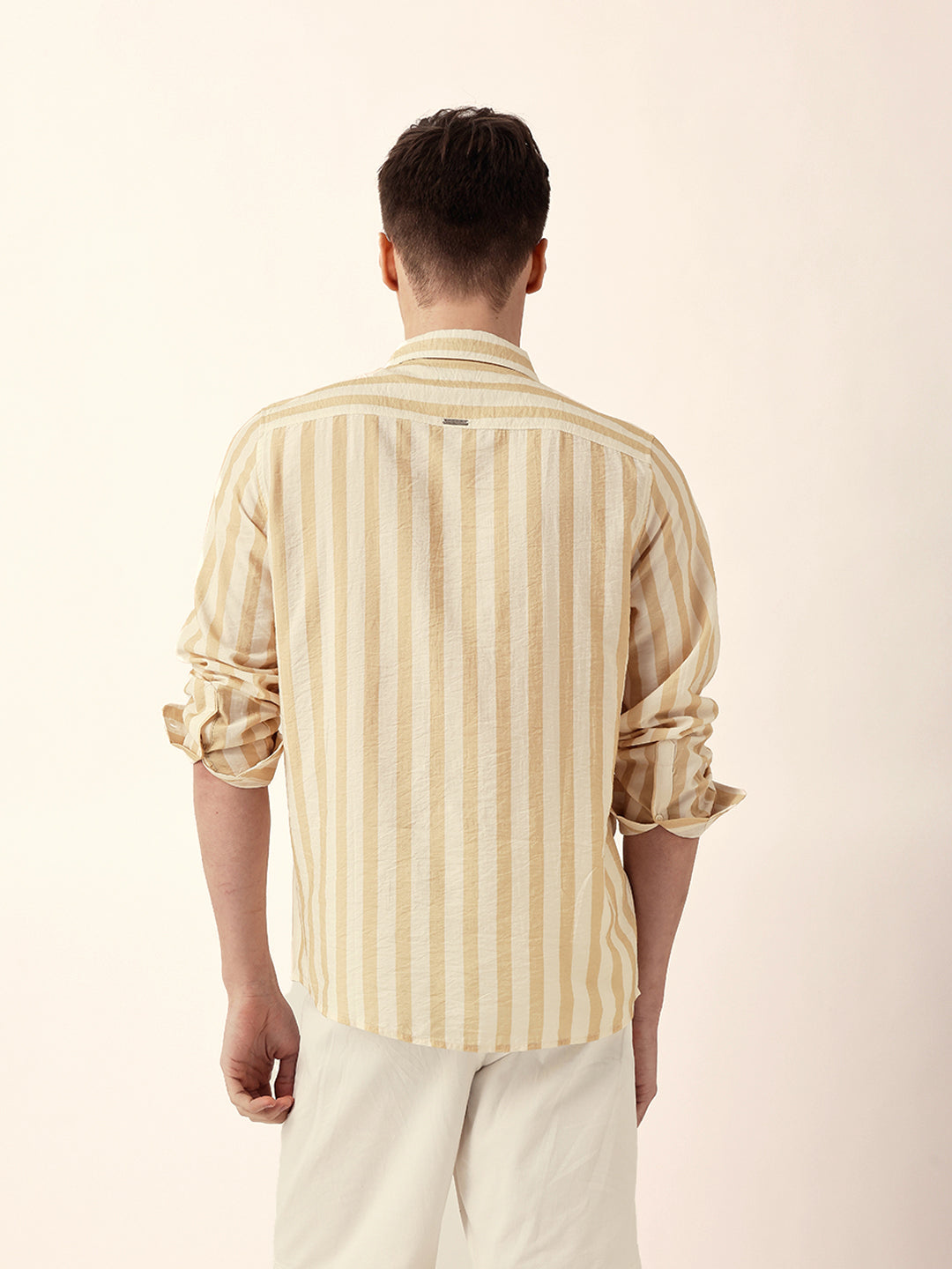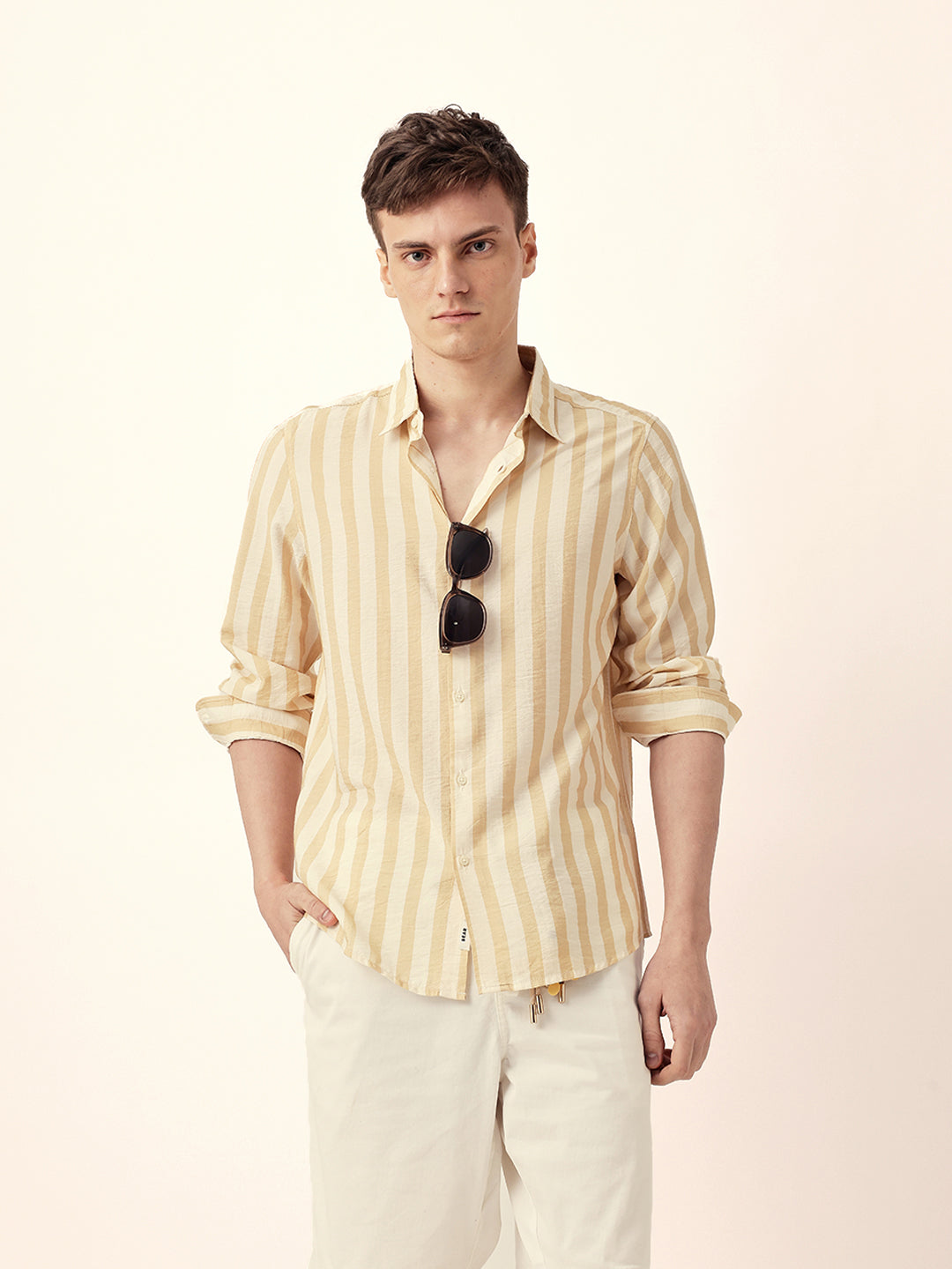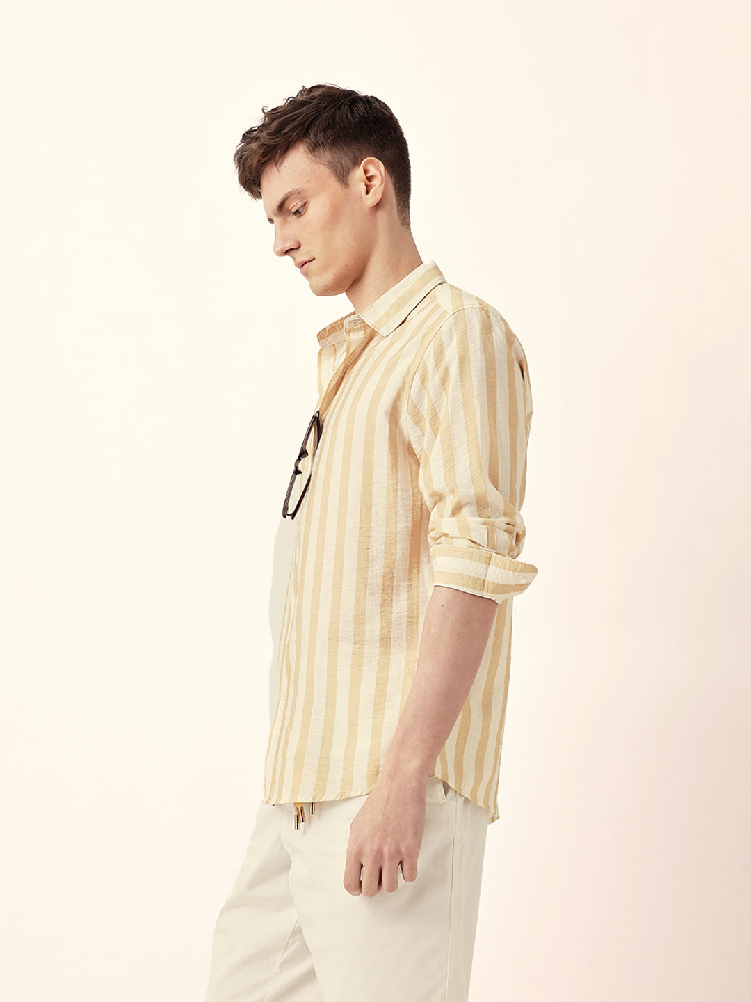 Yellow & Off-White Vertical Stripe Regular Fit Casual Shirt