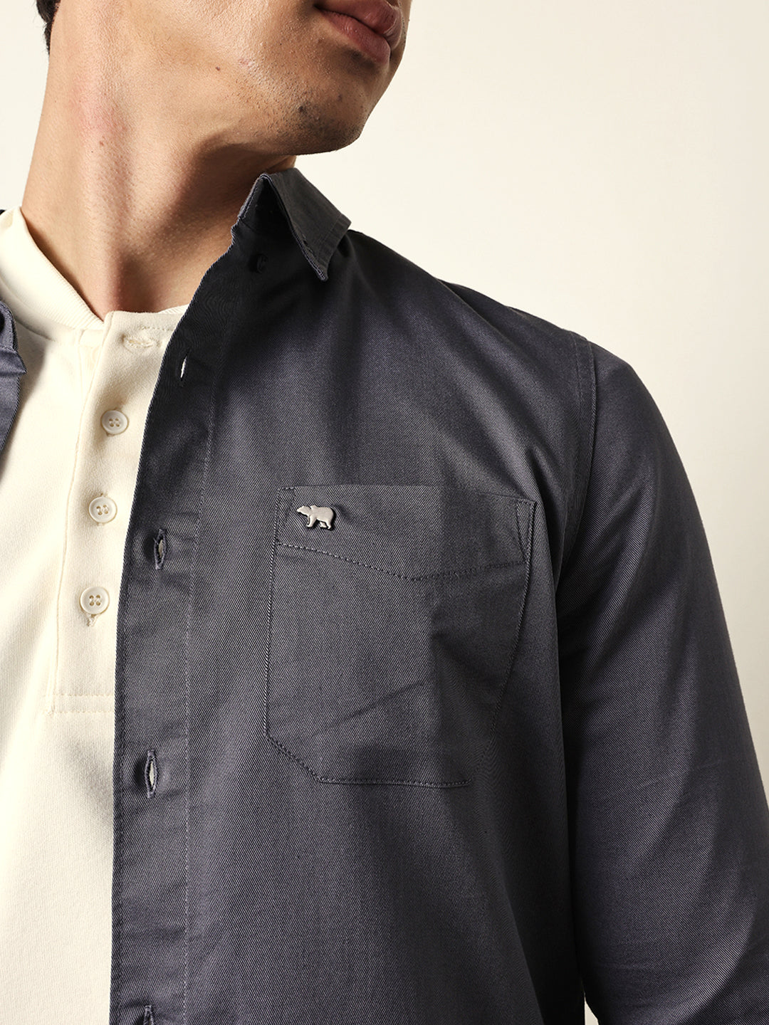 Grey Solid Slim-Fit Casual Shirt with Button-Down Collar