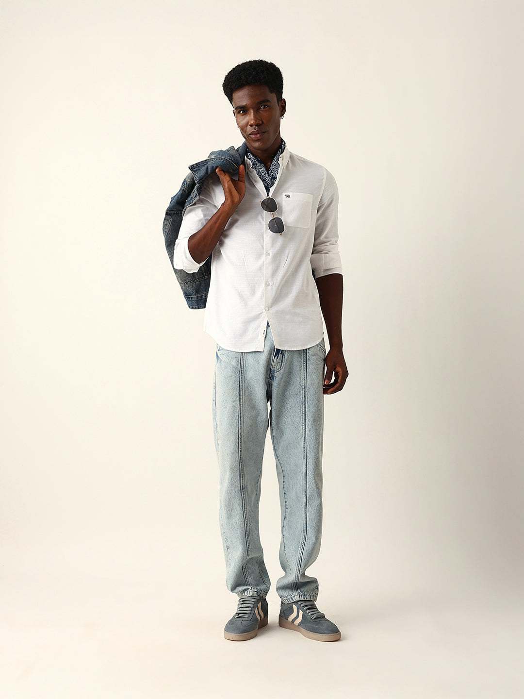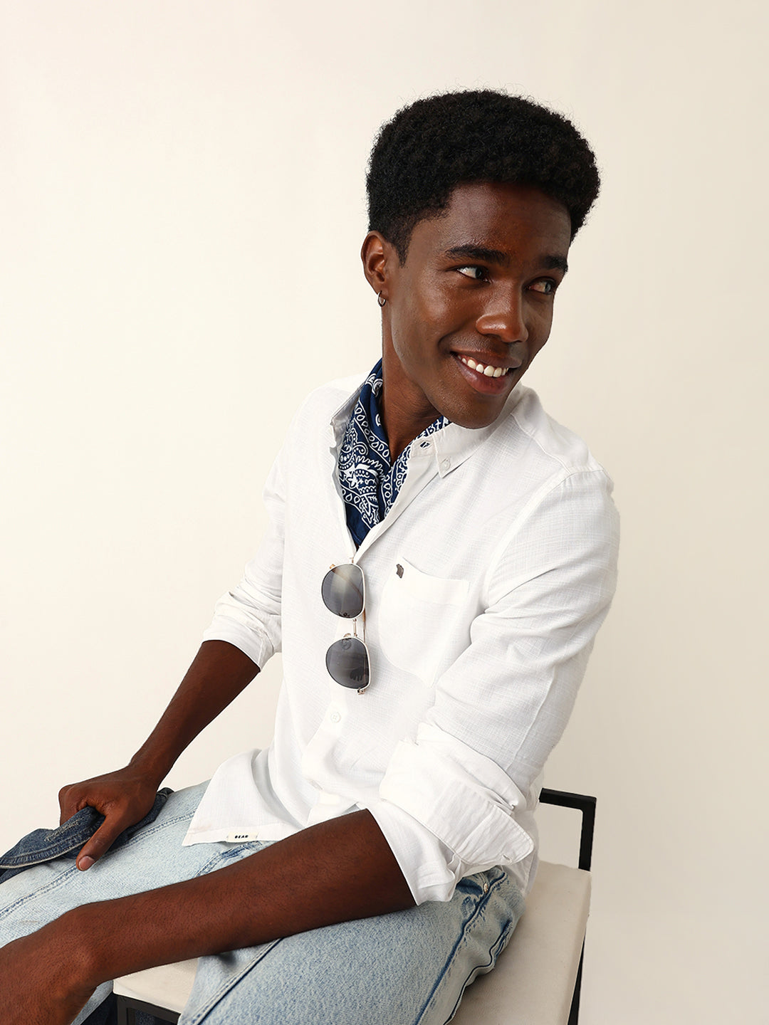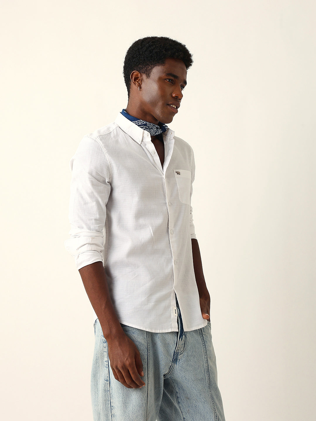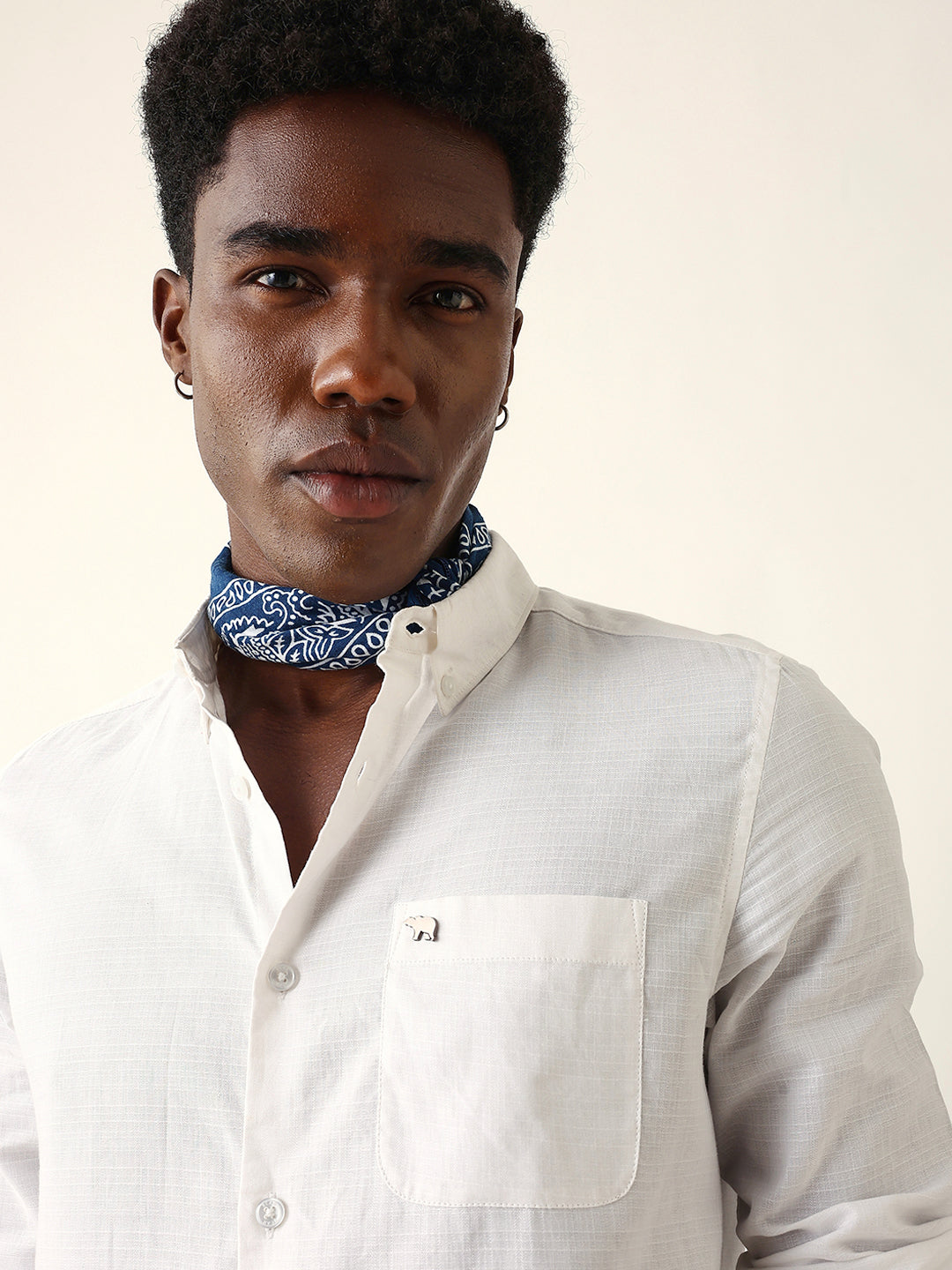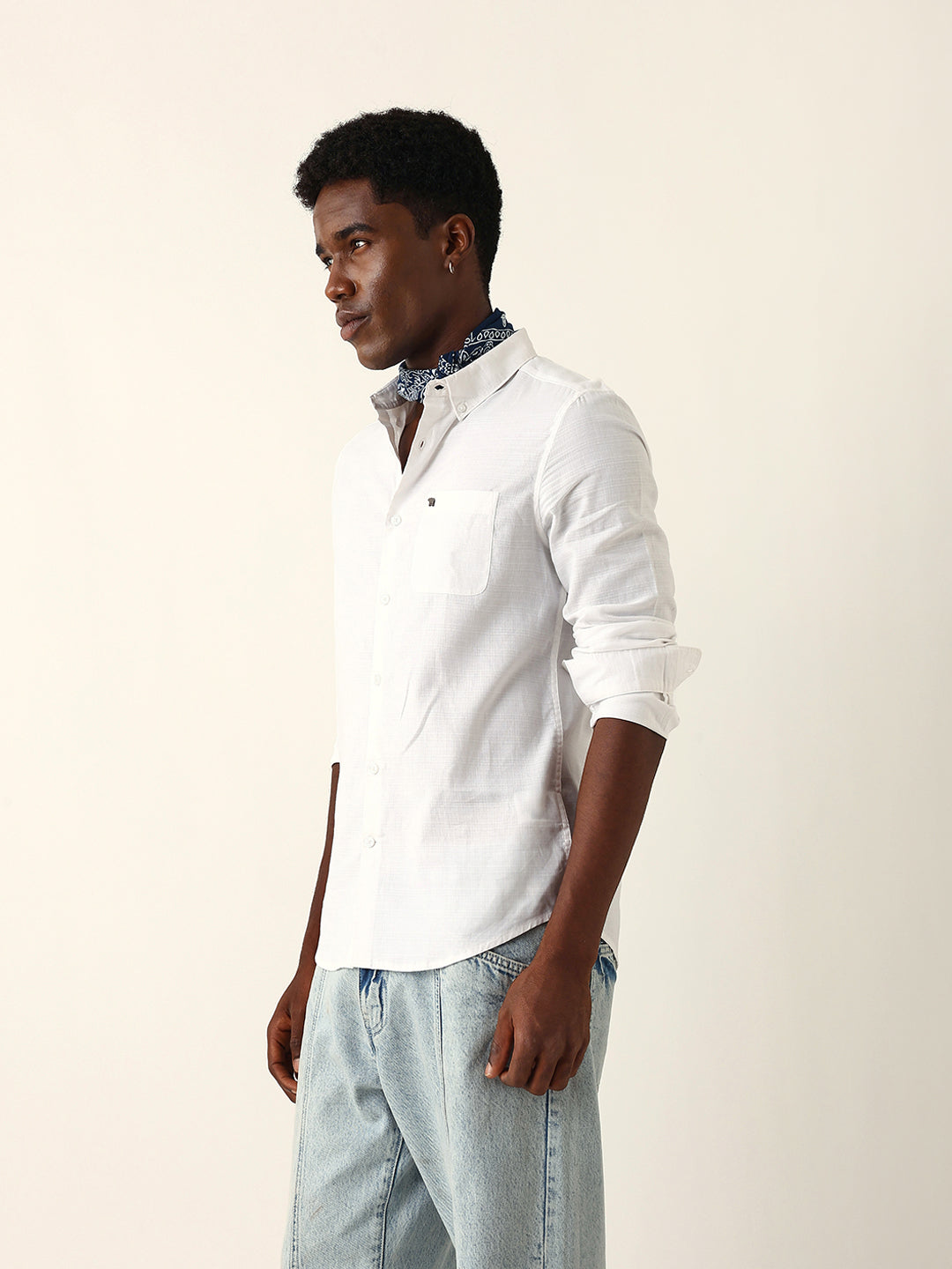 Shop White Woven Crosshatch Textured Slim Fit Casual Shirt Online.