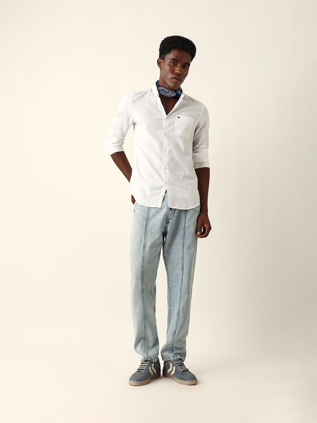 White Woven Crosshatch Textured Slim Fit Casual Shirt