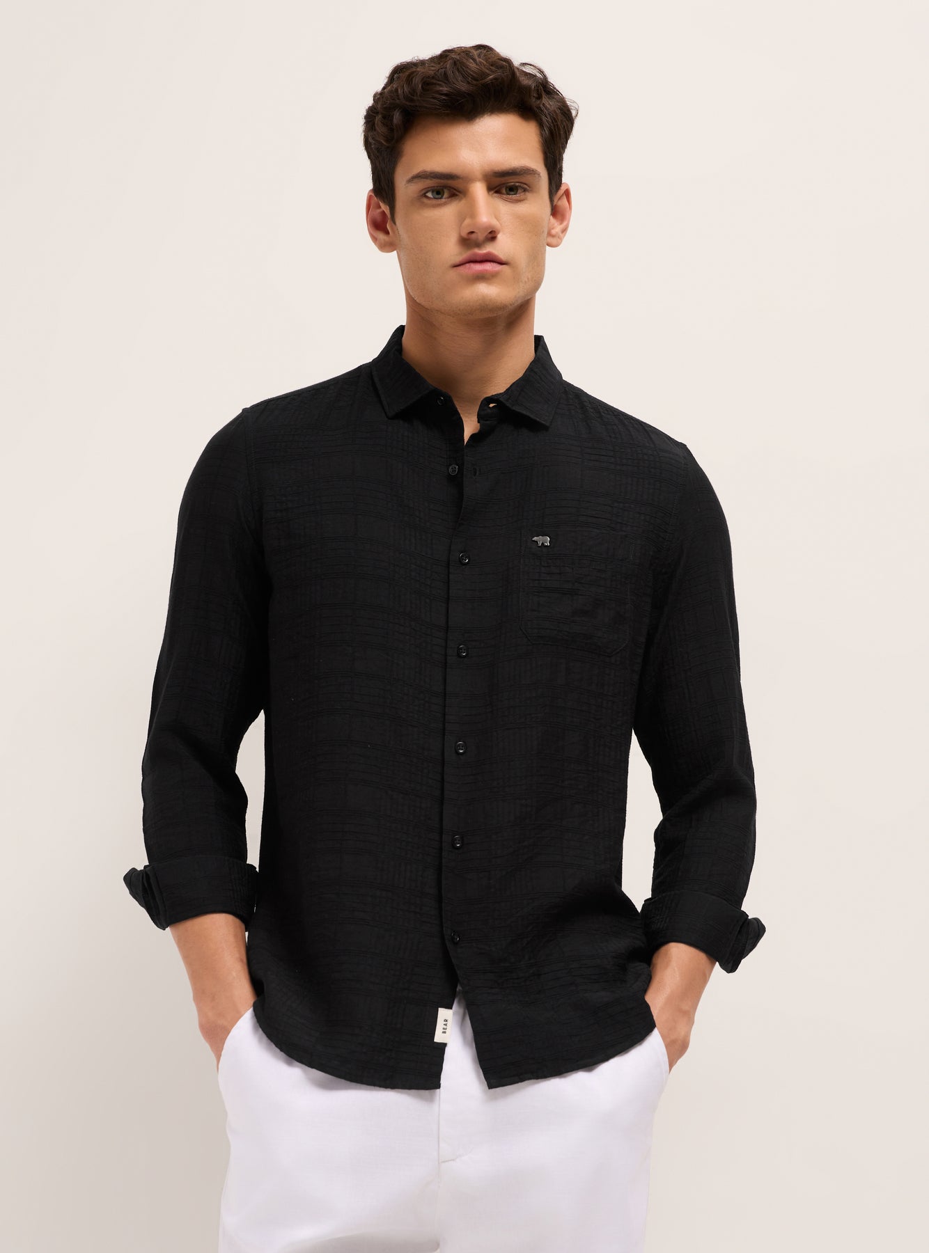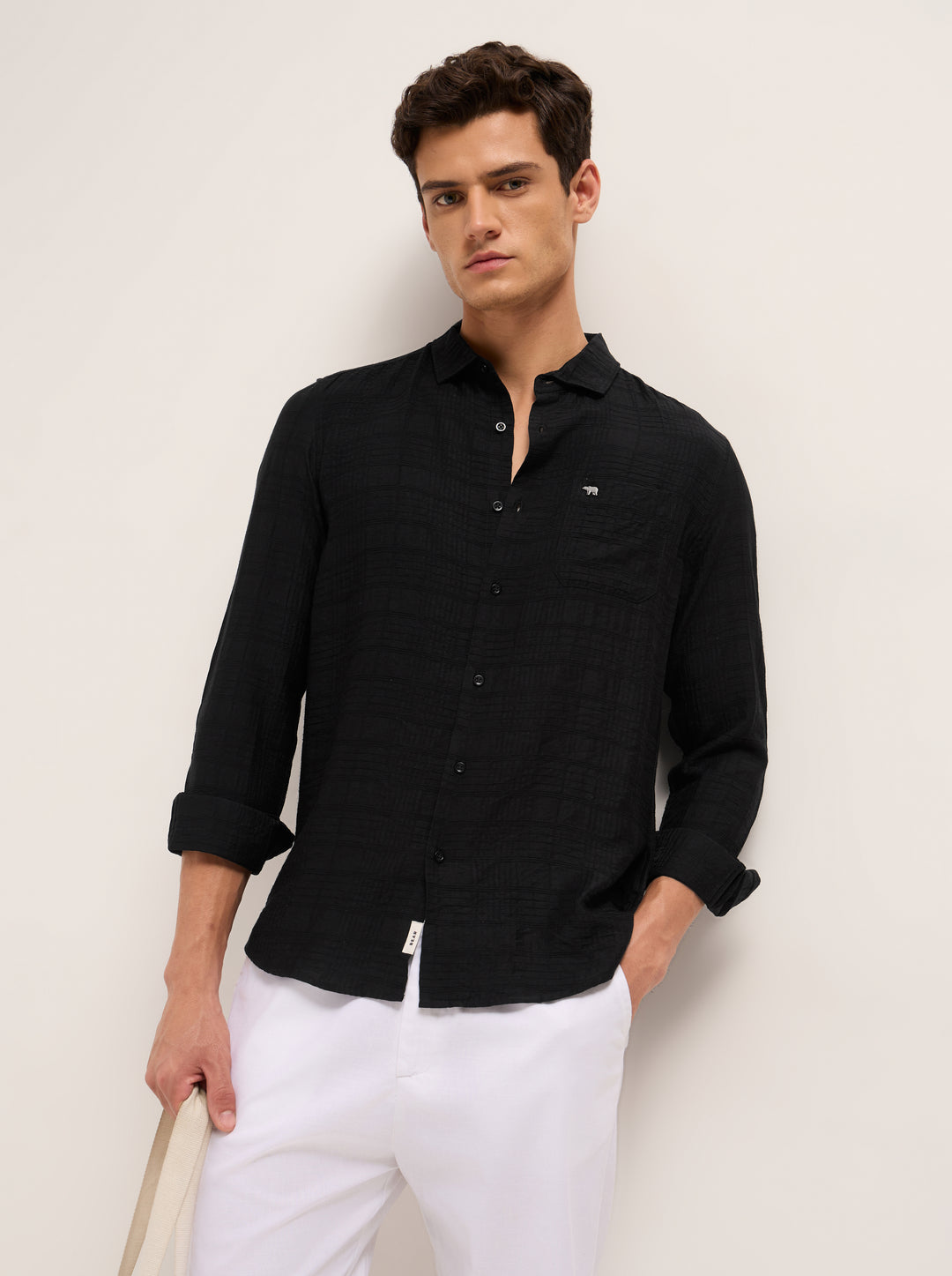 Black Slim Fit Casual Shirt with Woven Textured Check Design