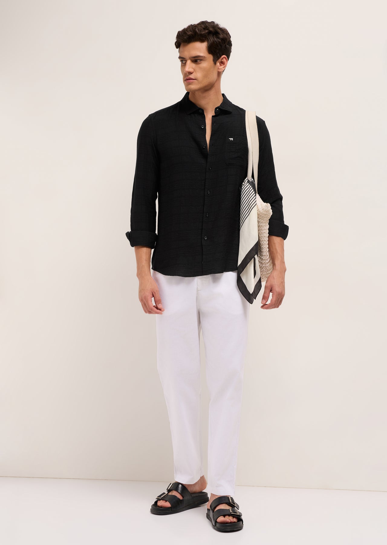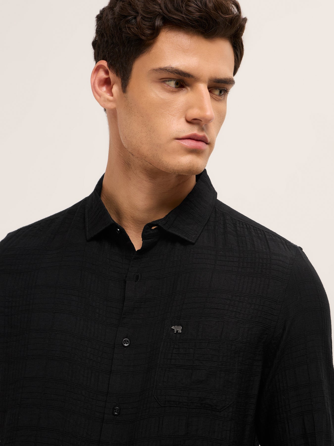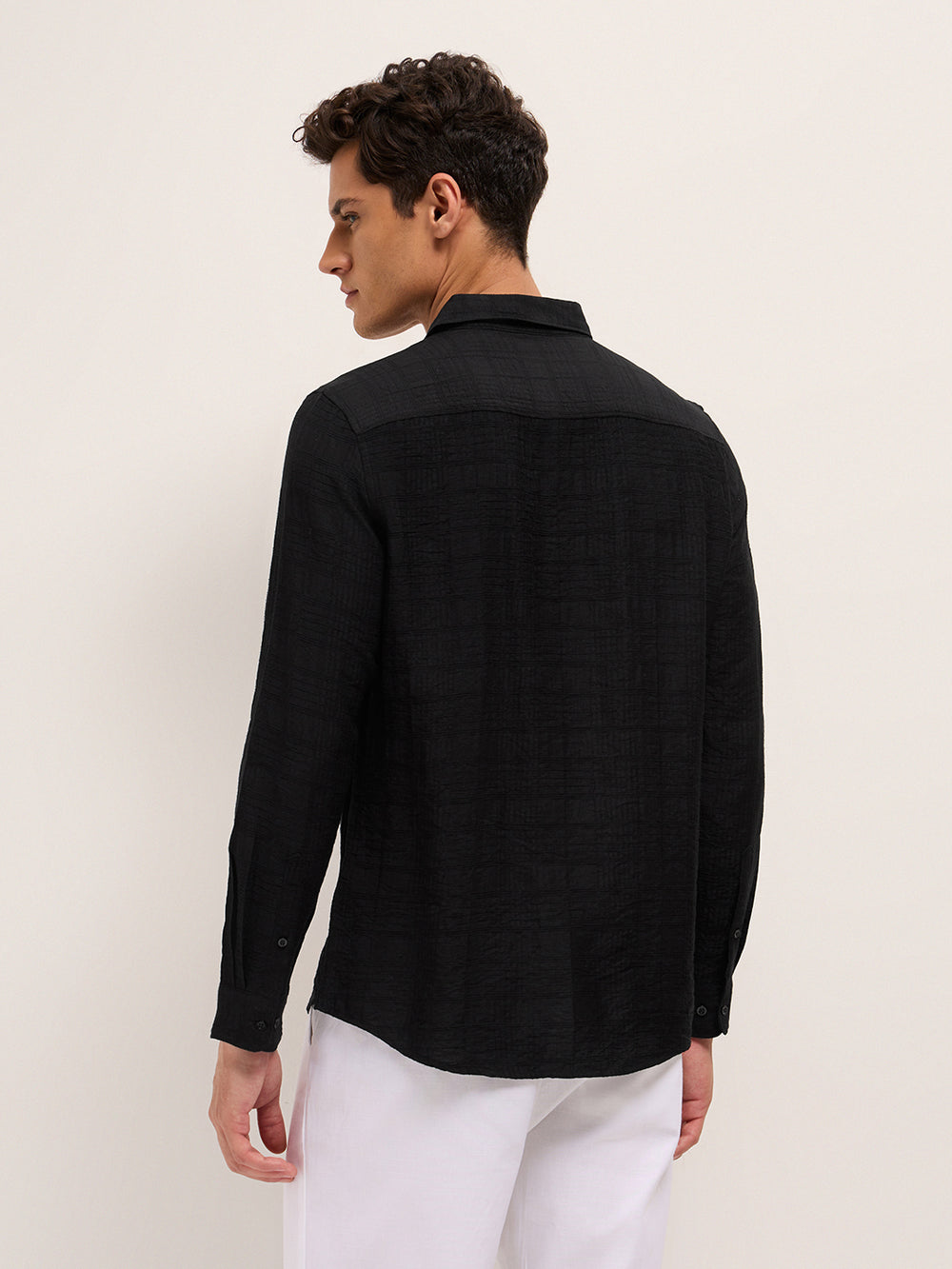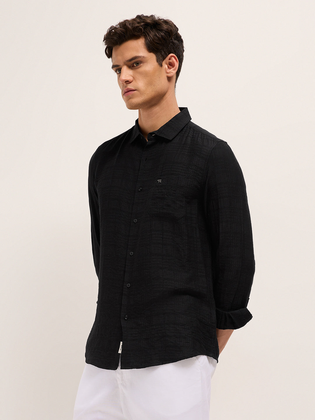 Shop Black Slim Fit Casual Shirt with Woven Textured Check Design Online.