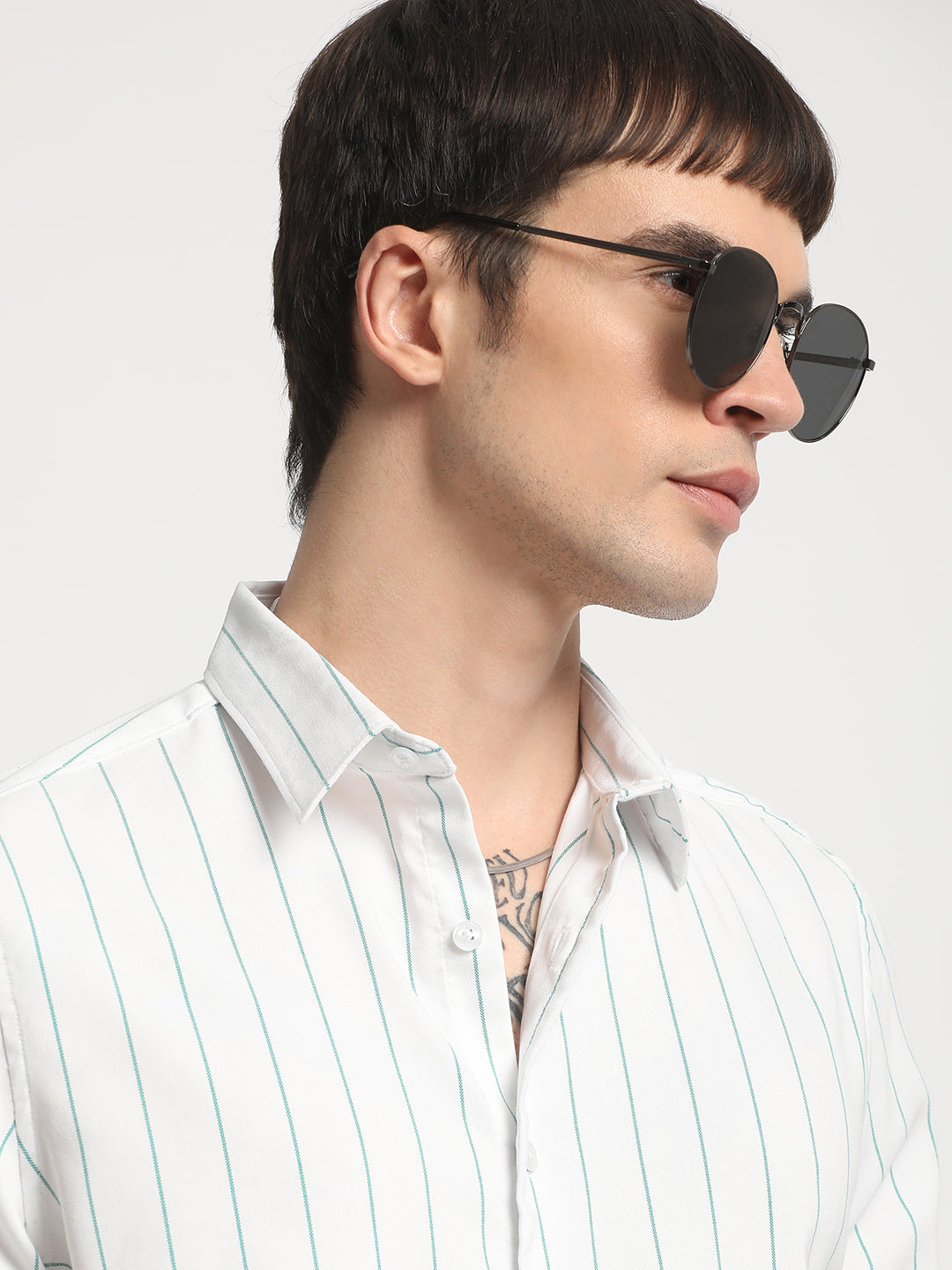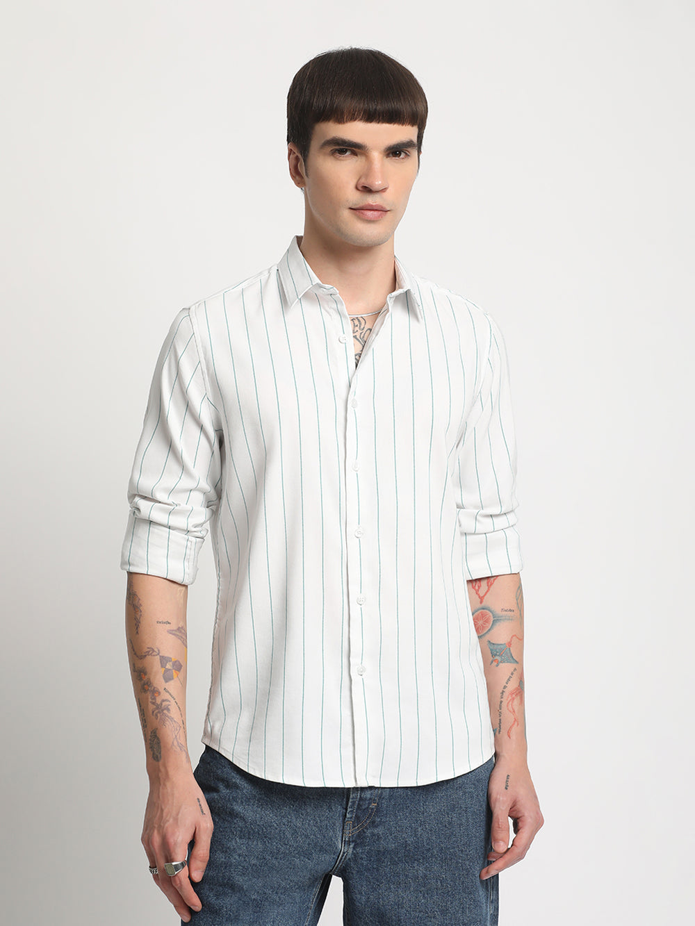 Men White Striped Slim Fit Cotton Casual Shirt