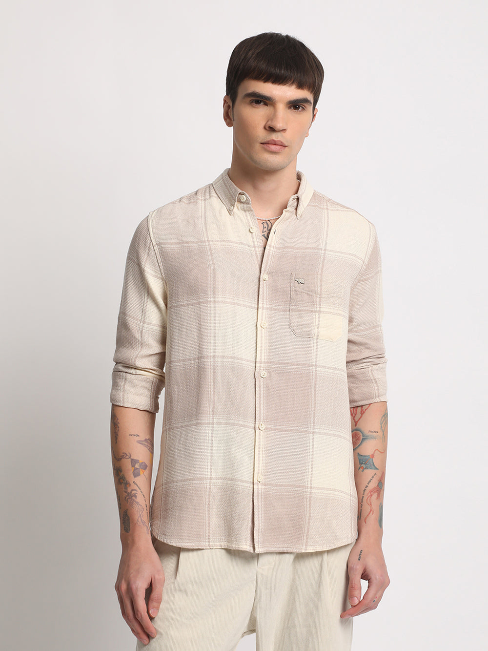Men Cream Checked Slim Fit Cotton Casual Shirt