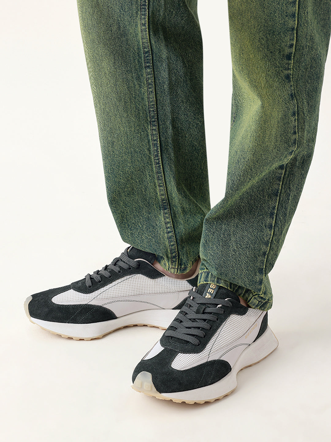 Shop Green Suede & Mesh Lace-Up Sneakers with Contrast White Heel Detail Online.