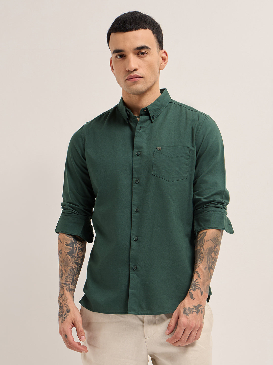 Shop Dark Green Solid Slim Fit Casual Shirt with Button-Down Collar Online.