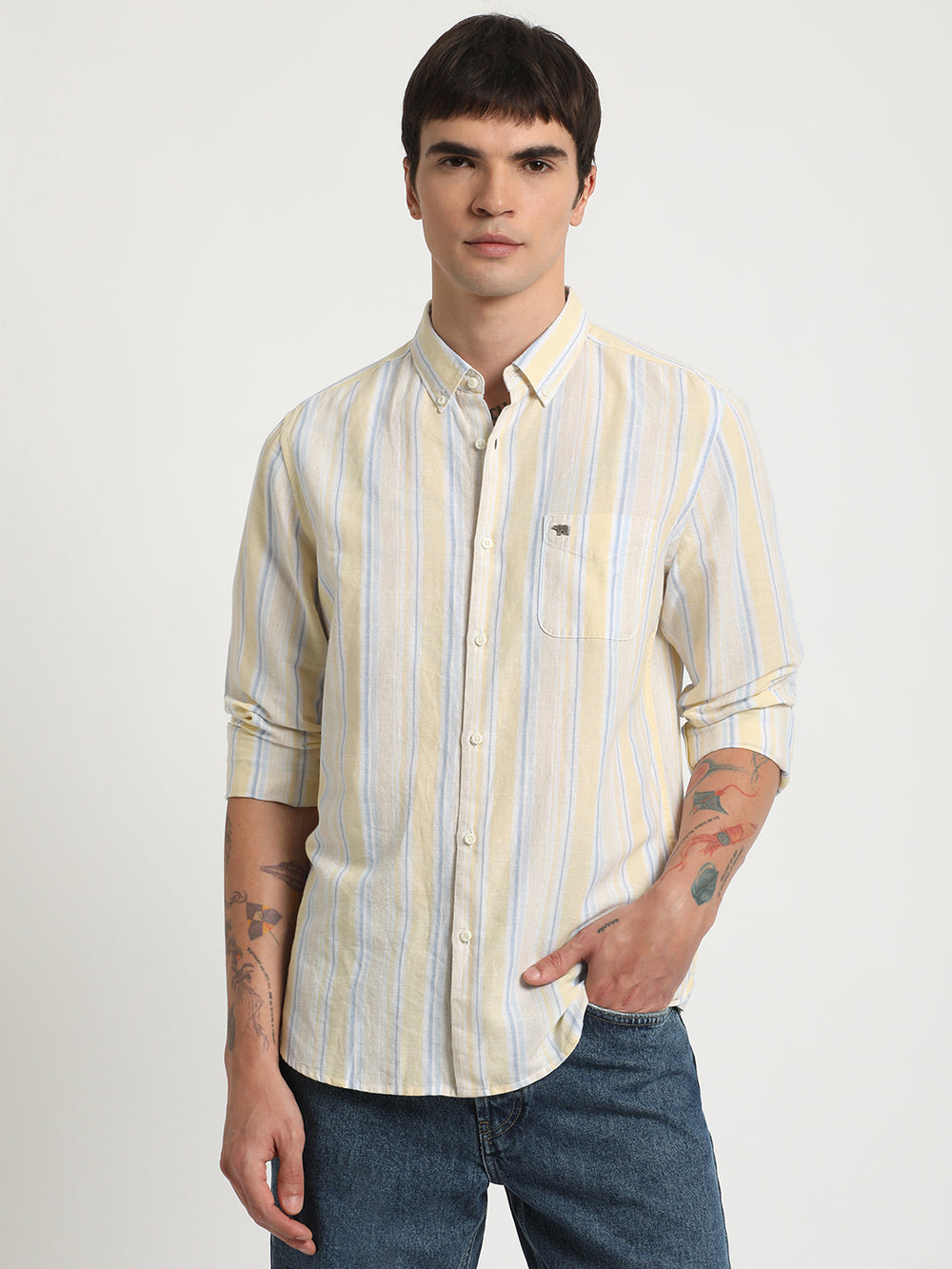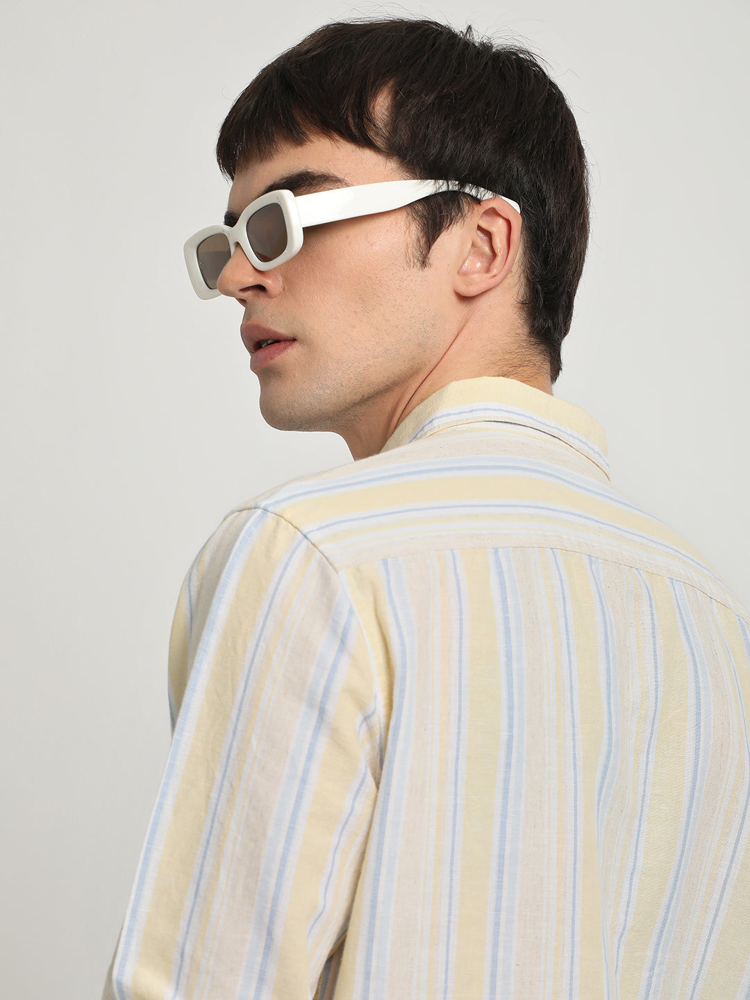 Men Yellow Striped Slim Fit Cotton Casual Shirt