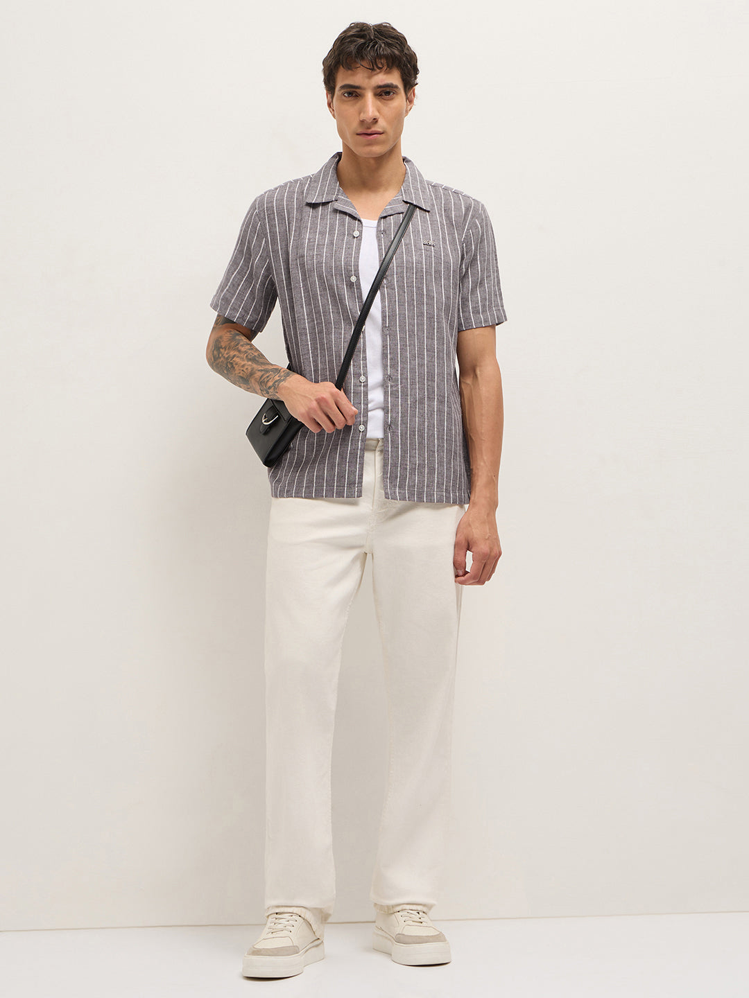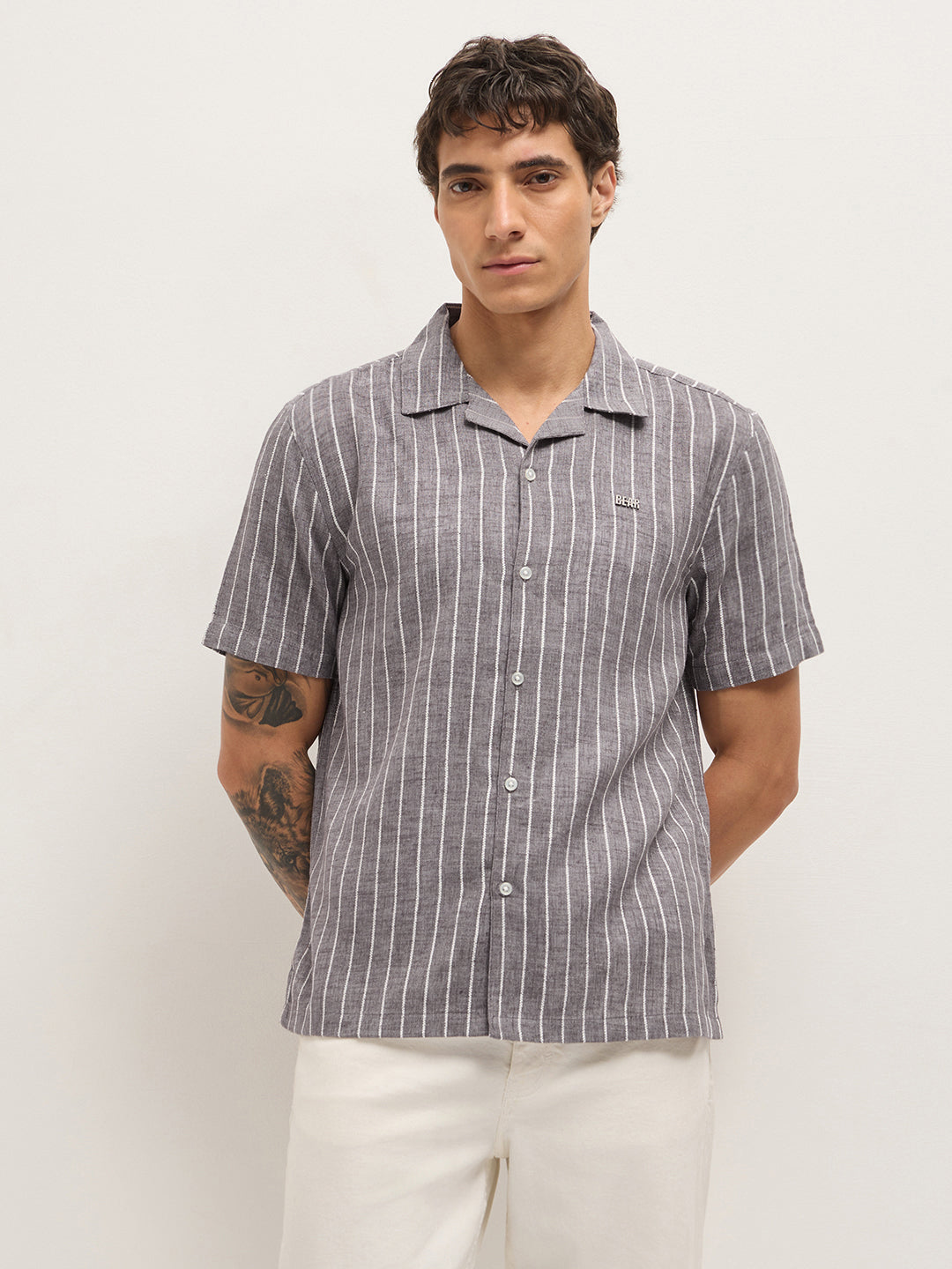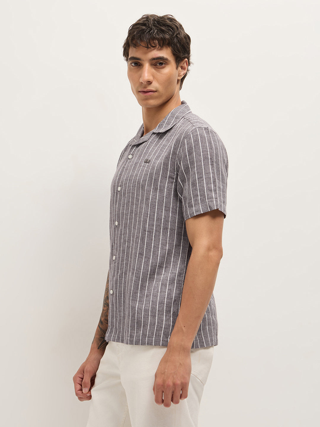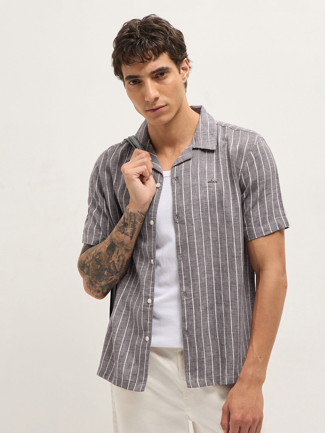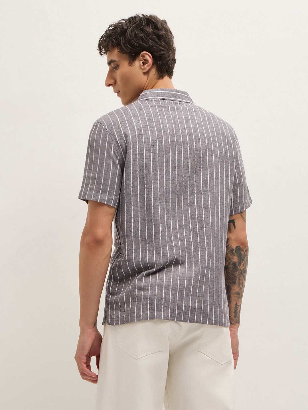 Shop Brown Linen Vertical Textured Stripe Relaxed Fit Half Sleeve Casual Shirt Online.