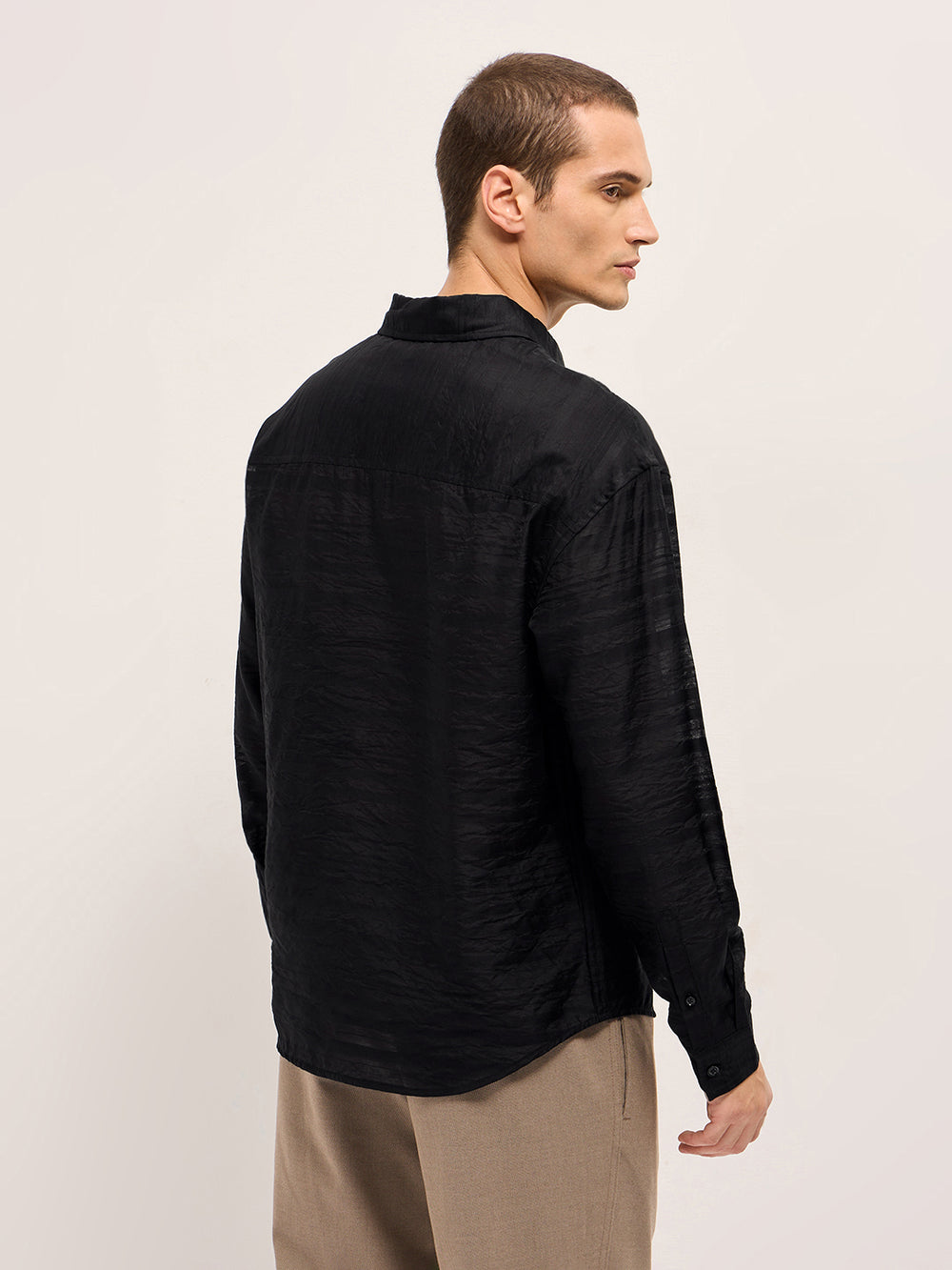 Black Crinkled Horizontal Textured Stripe Relaxed Fit Casual Shirt
