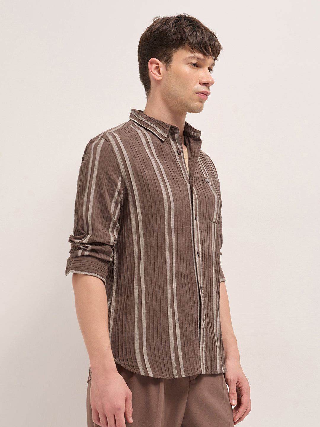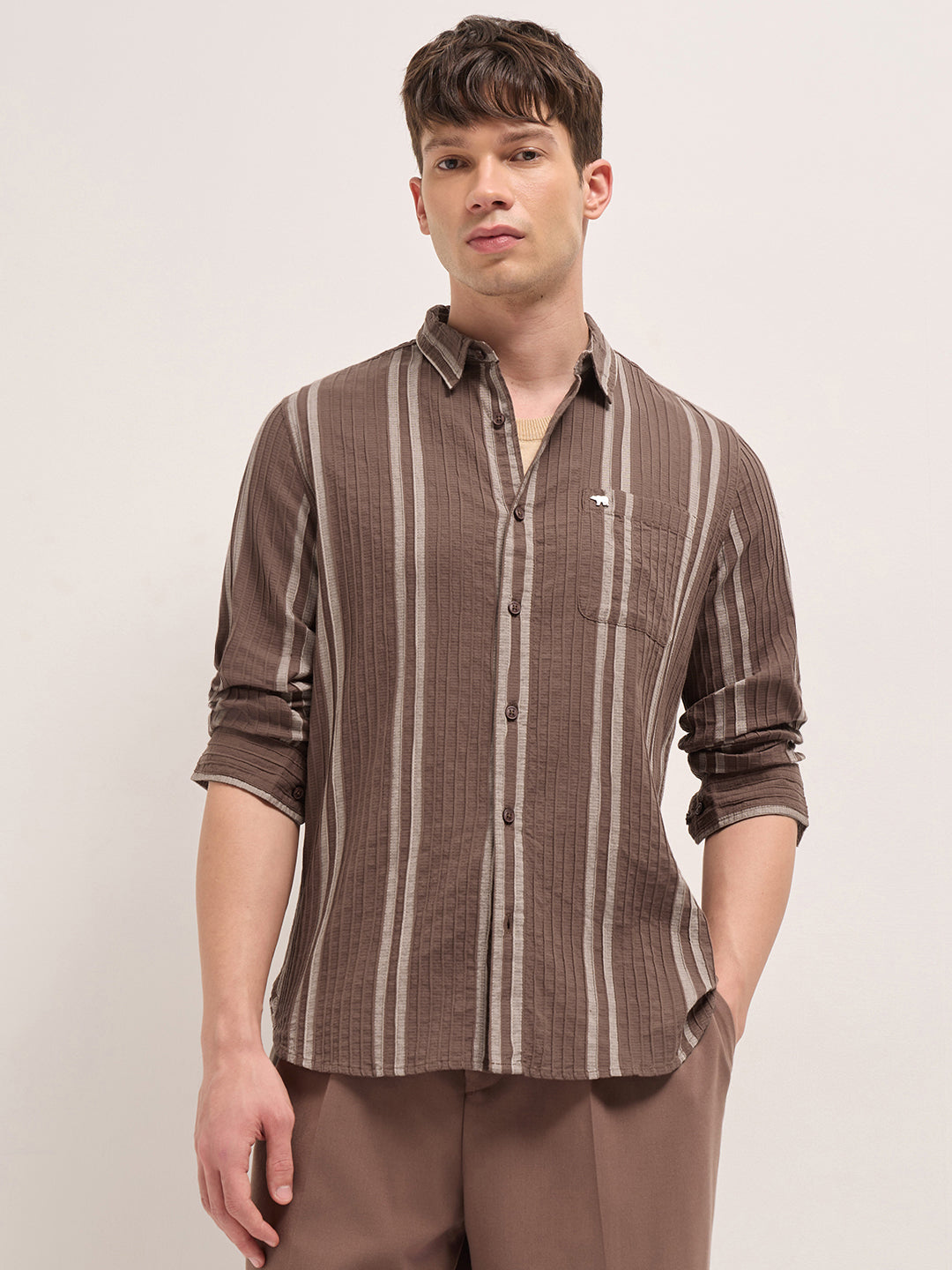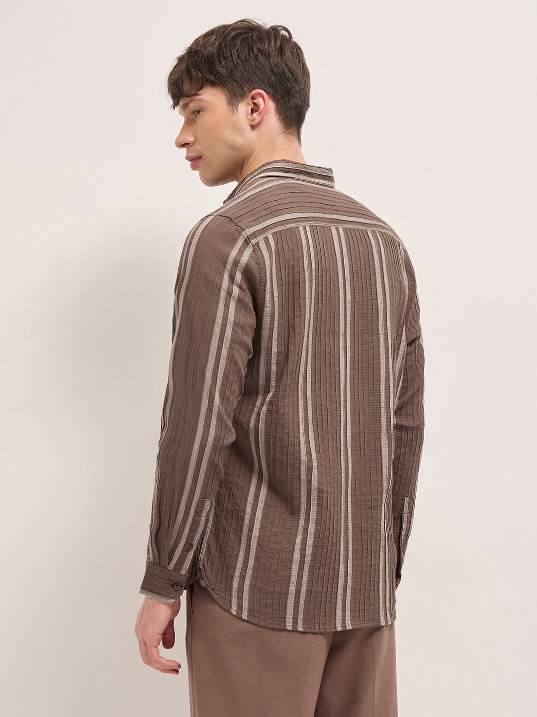Shop Brown Slim Fit Casual Shirt with Woven Vertical Textured Stripes Online.