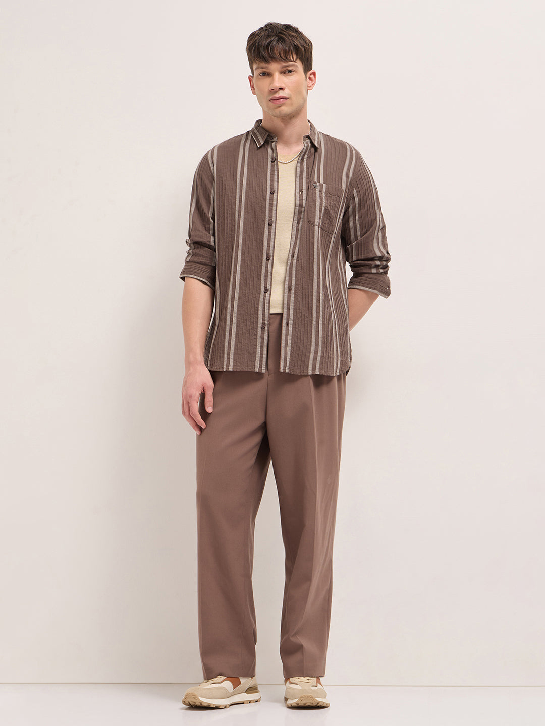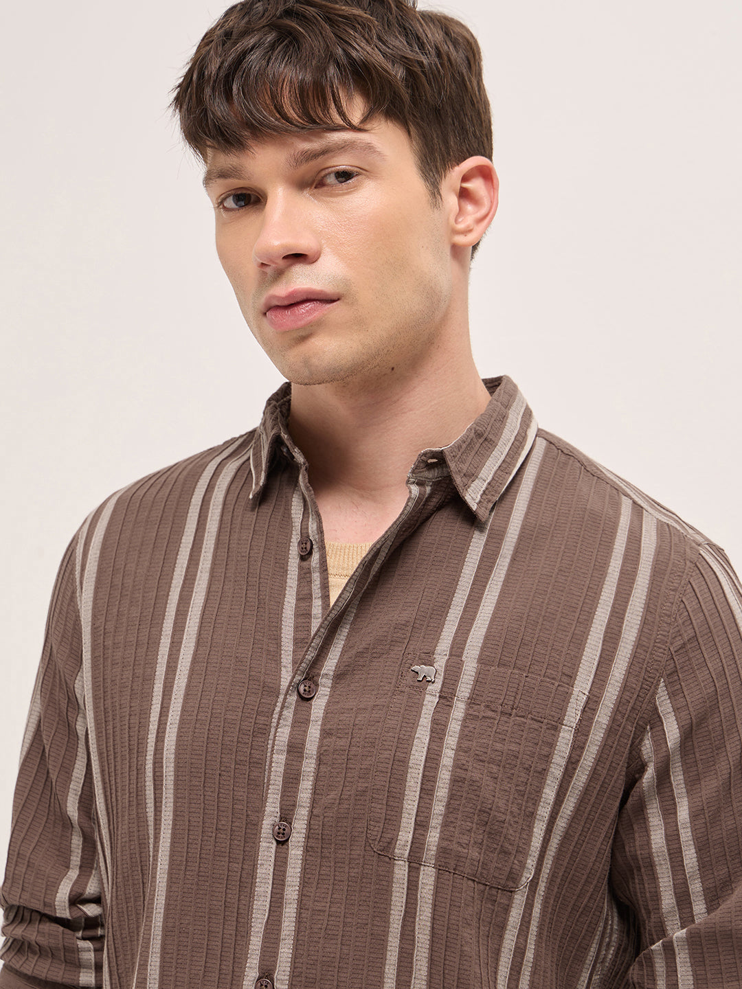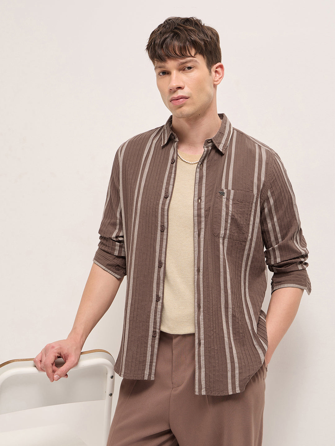 Shop Brown Slim Fit Casual Shirt with Woven Vertical Textured Stripes Online.