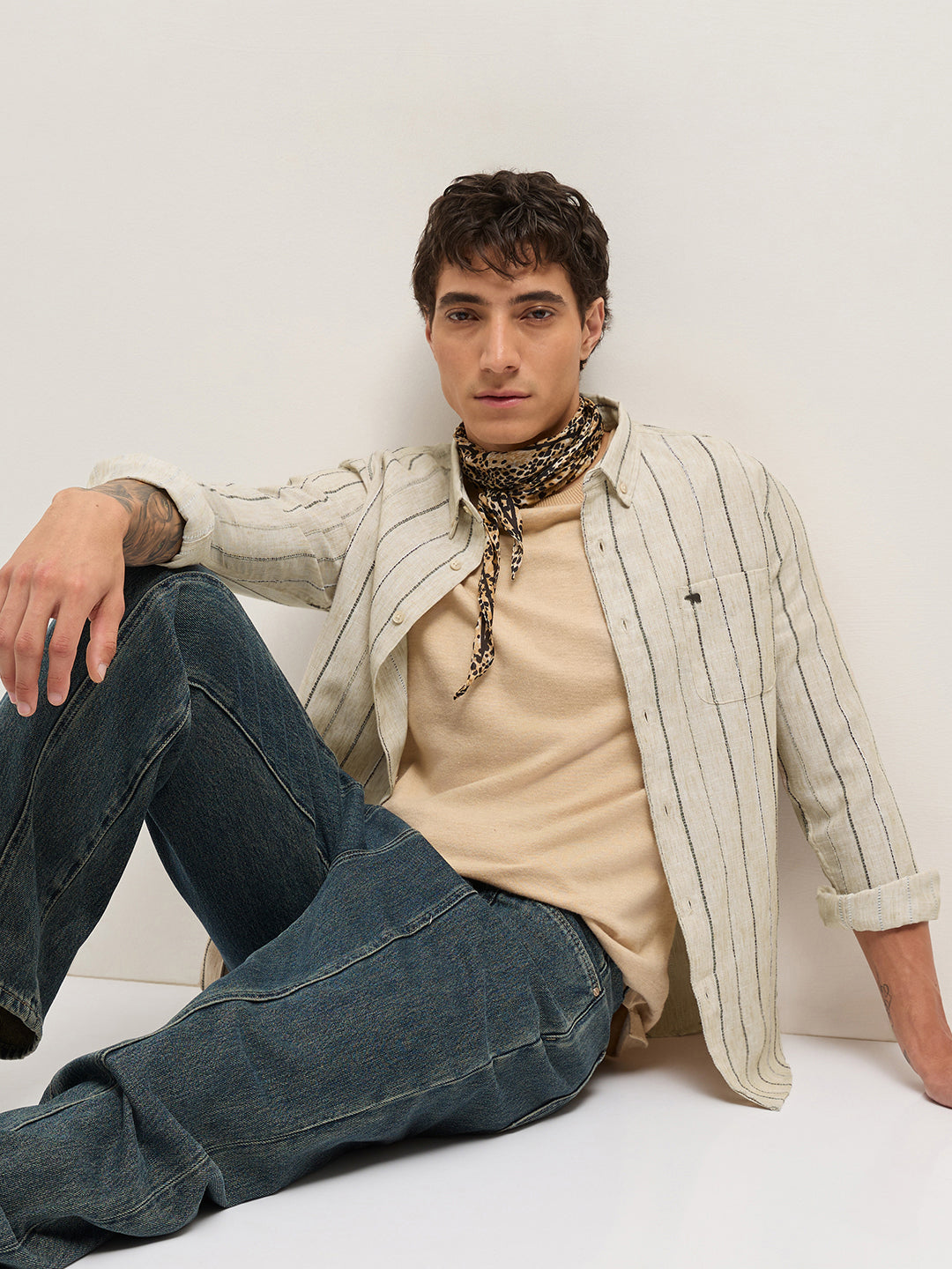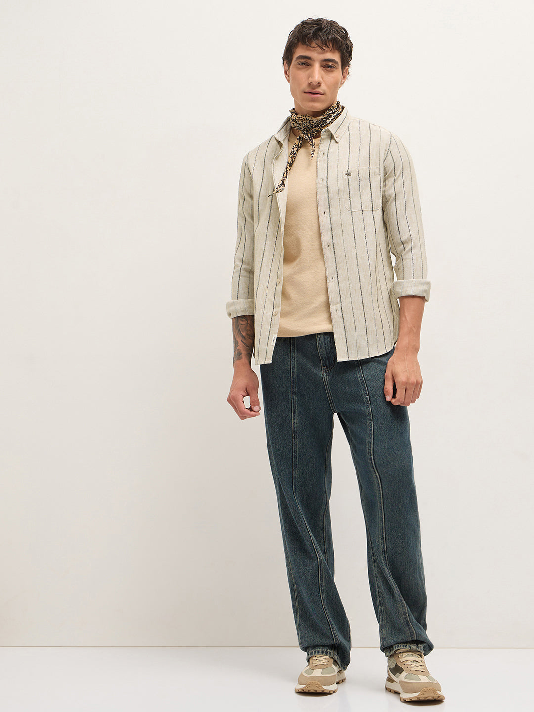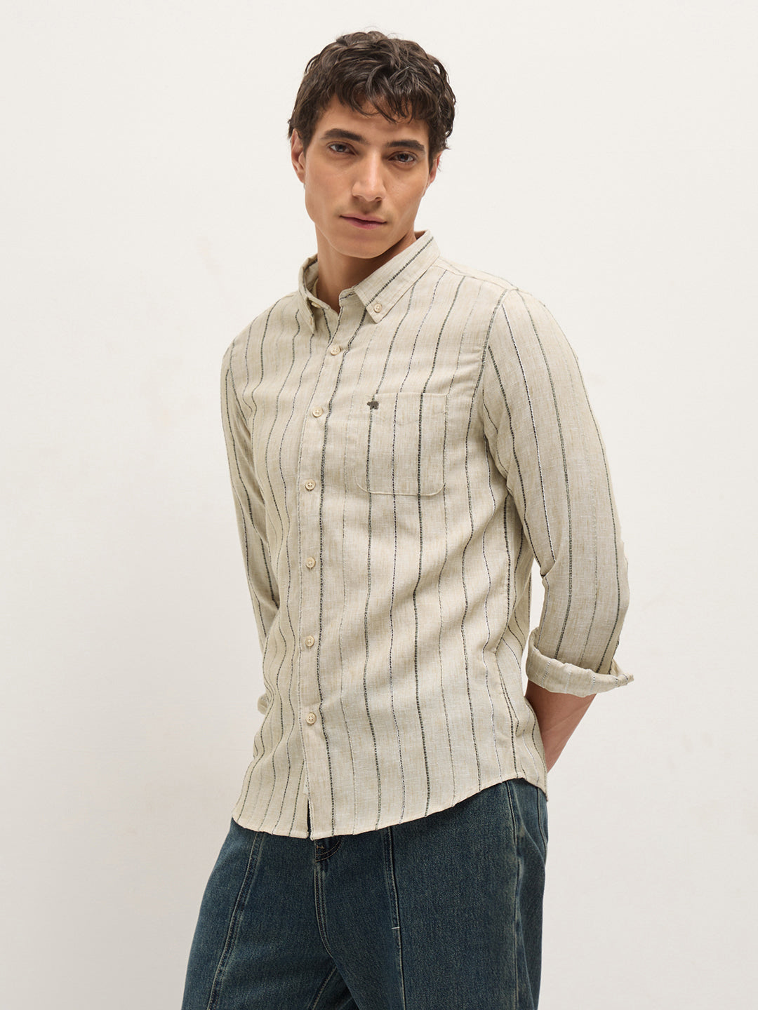Shop Beige Woven Vertical Stripes Slim Fit Casual Shirt Online.