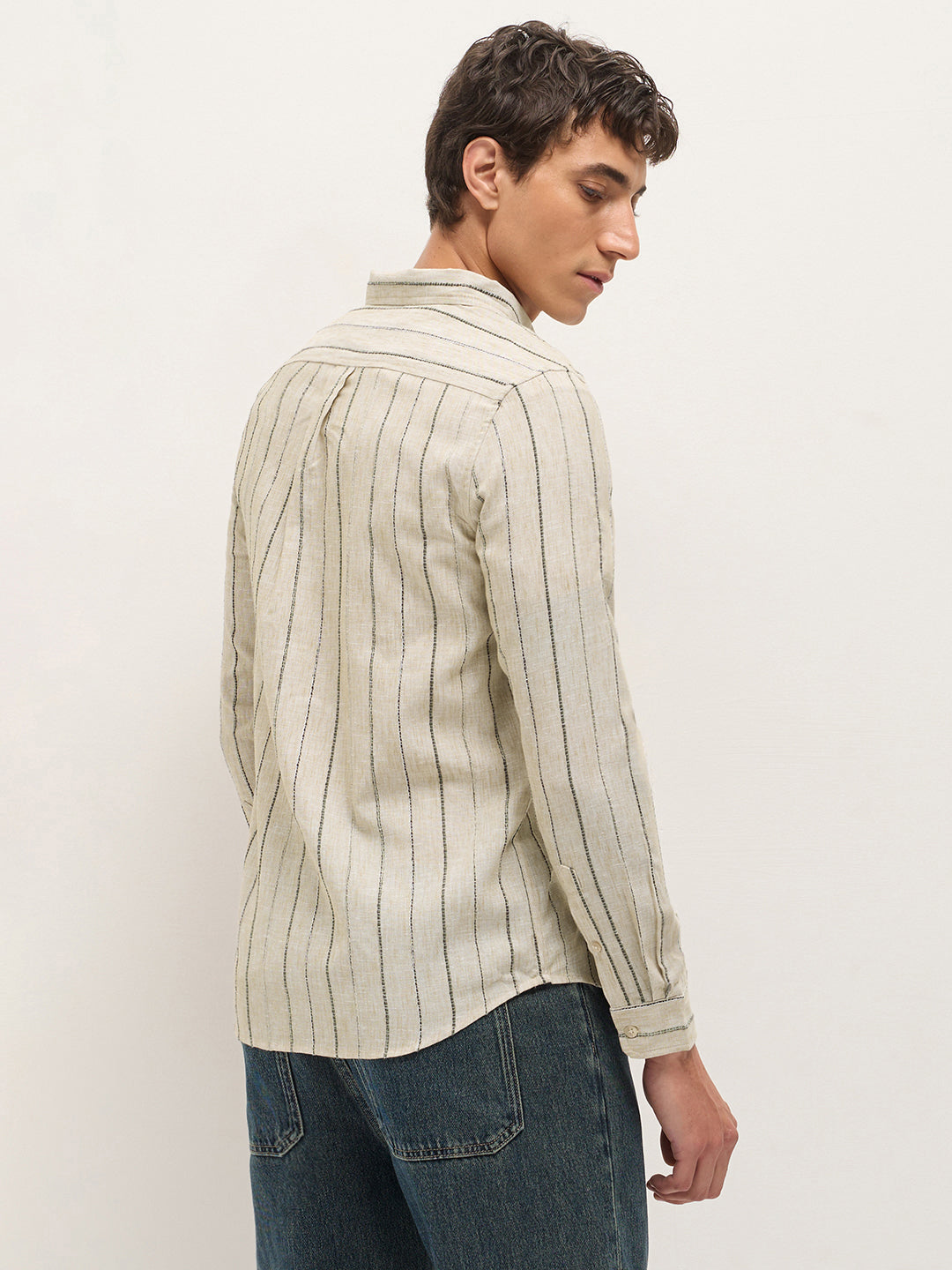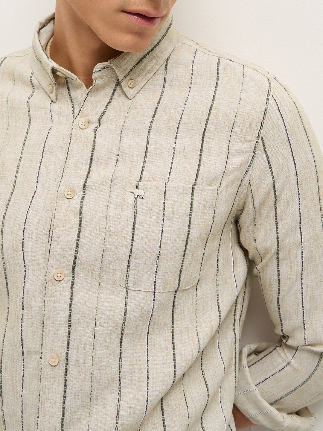 Beige Woven Vertical Stripes Slim Fit Casual Shirt