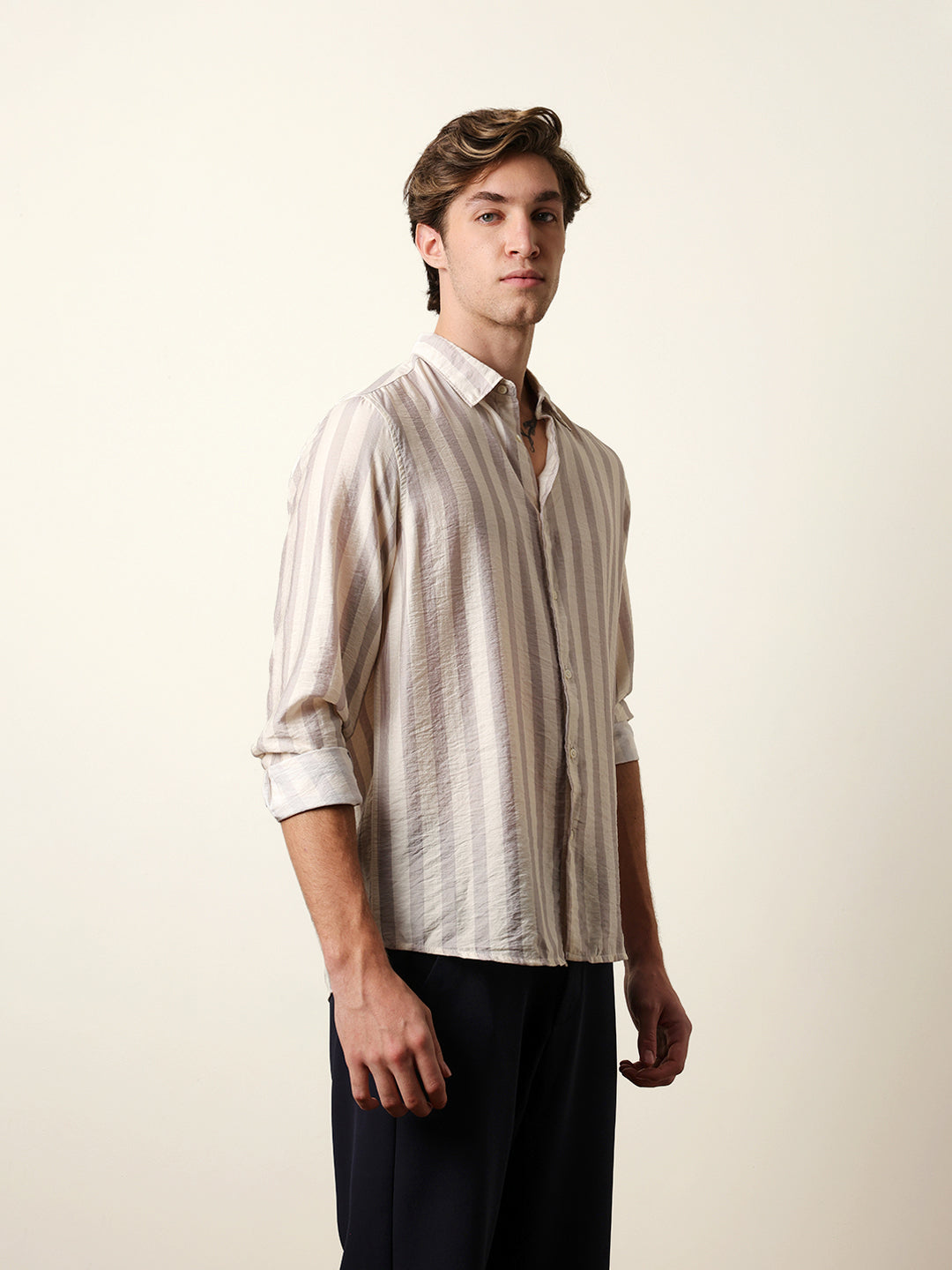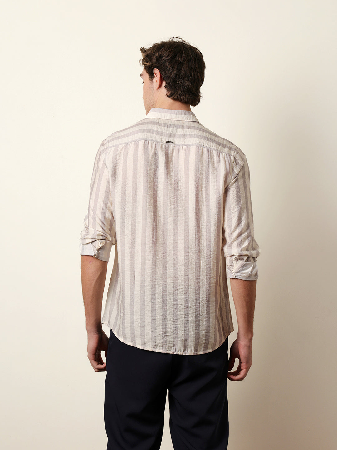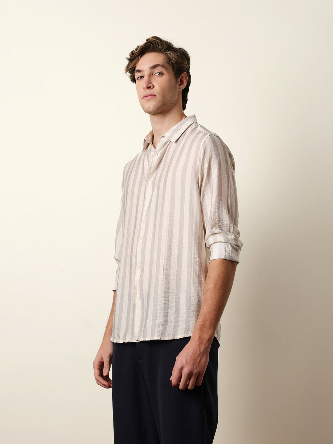Shop Beige & Cream Vertical Stripe Regular Fit Casual Shirt Online.