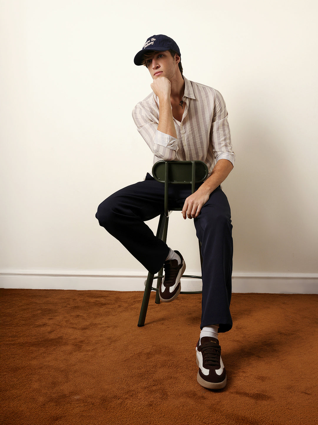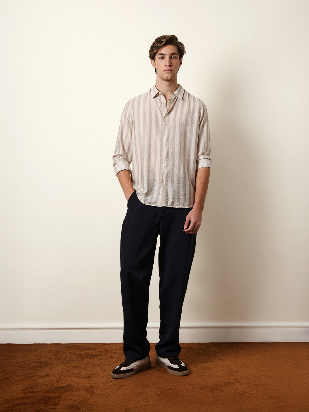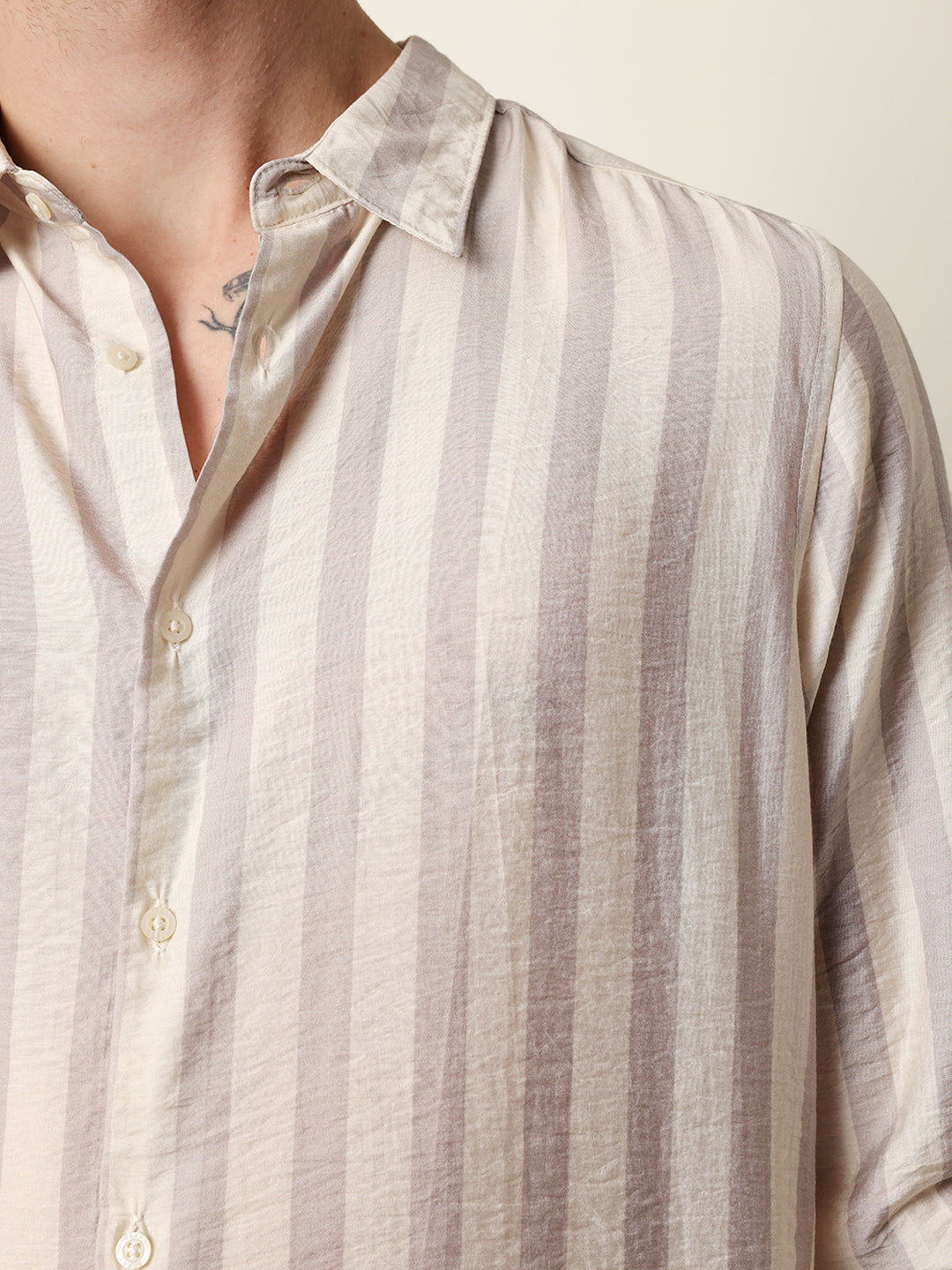 Shop Beige & Cream Vertical Stripe Regular Fit Casual Shirt Online.