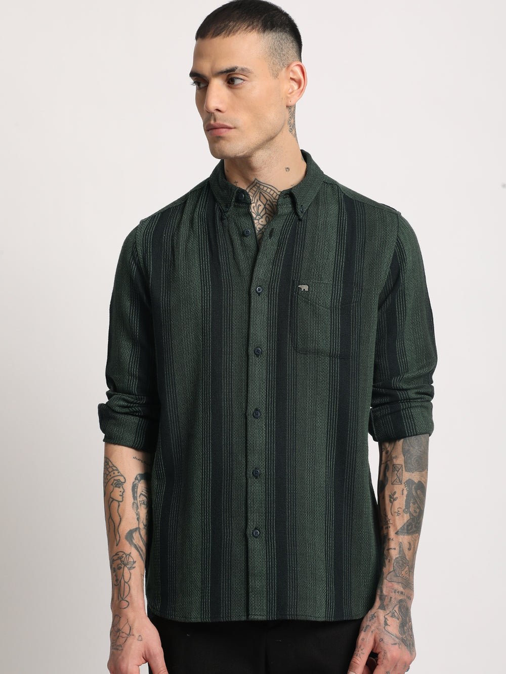Men Green Striped Slim Fit Cotton Casual Shirt